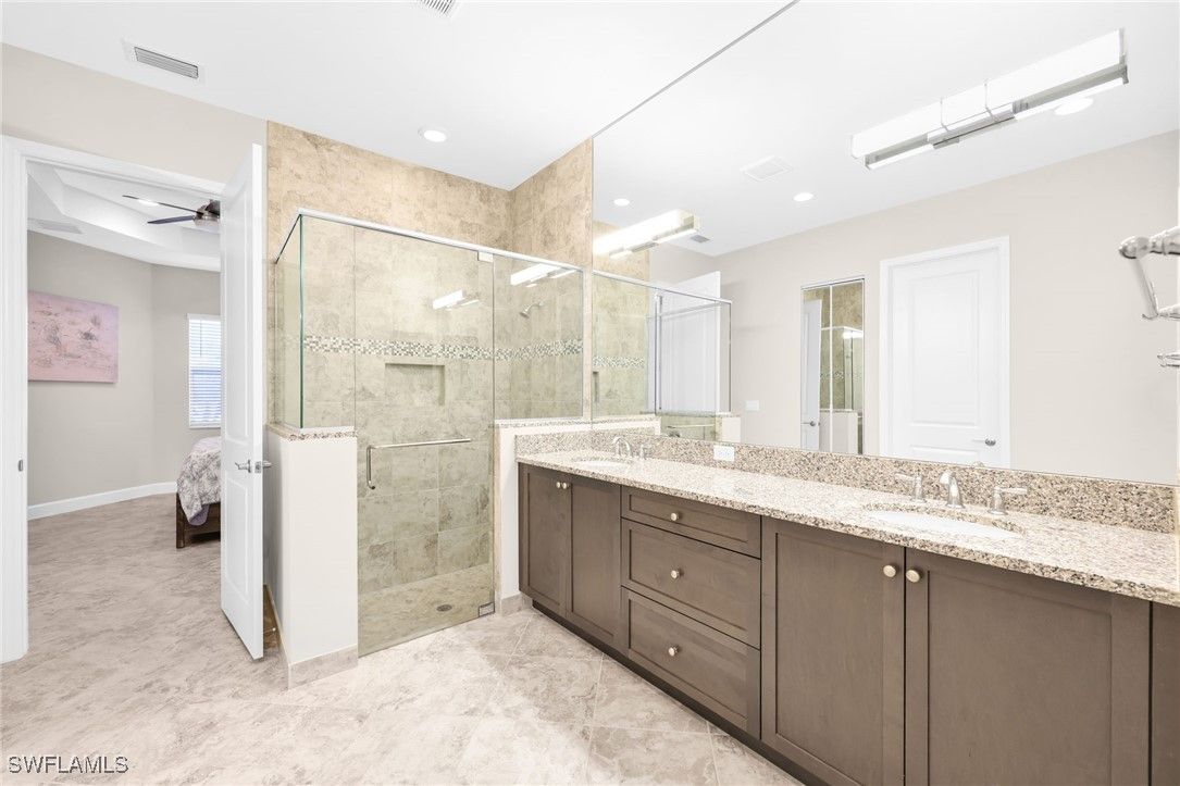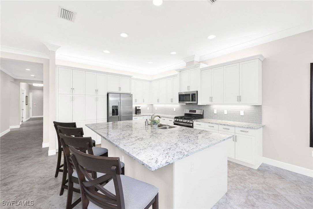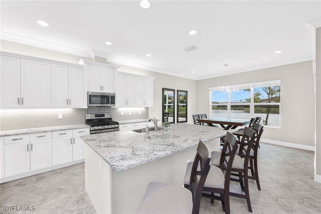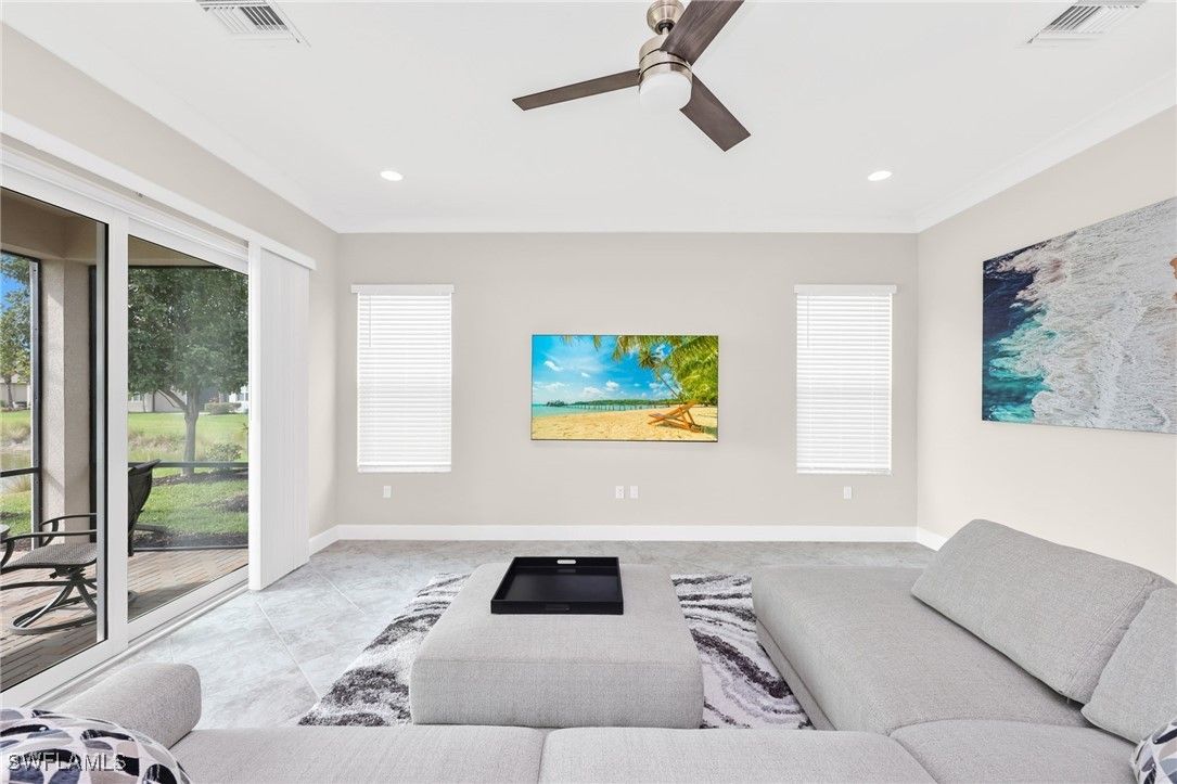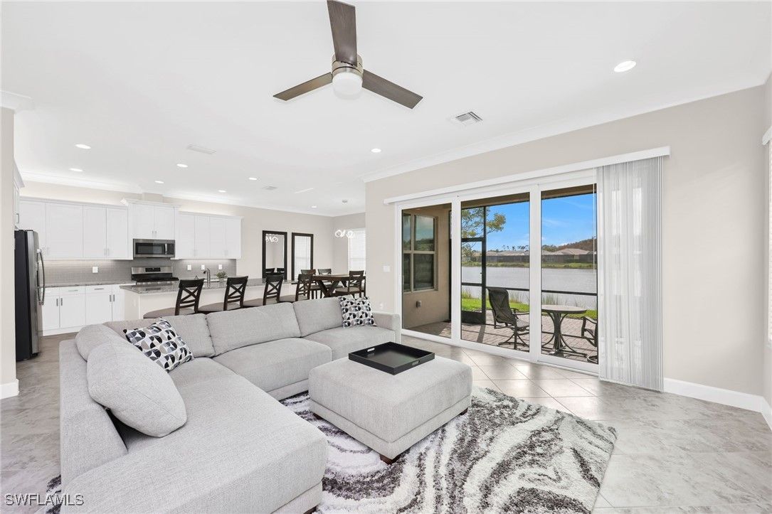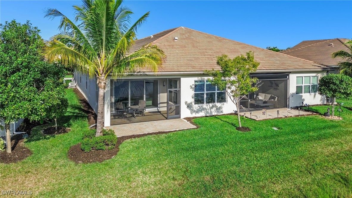 Beautifully appointed 2-bedroom plus den, 2-bath residence, with 2-car garage— this Hampton model has an exceptional layout that stretches the full width of the home’s rear living space. This thoughtful design creates an expansive setting ideal for entertaining and everyday comfort, while offering a layout unlike any other villa model. Good news, this villa is located in the "X flood zone" and impact doors and windows throughout create peace of mind. From the moment you enter, you’ll notice the upgraded finishes throughout: Natural Gas Community, designer lighting, diagonal tile floors that flow throughout the entire villa (No carpet here), and crown molding that adds a refined, cohesive look. At the heart of the home, the open kitchen stands out with granite countertops, stainless steel appliances, natural-gas range, and an inviting dining area perfect for gatherings. The spacious primary suite features a coffered ceiling, dual vanities, a walk-in shower, and a large custom-organized closet. The guest bath is conveniently positioned between the second bedroom and the den, offering privacy and functionality for guests or a home office setup. Outside, you’ll enjoy a serene lake view from the rear of the home along with a meticulous yard and lush landscaping —ideal for relaxing, grilling, or gardening. The community does allow fences, which is a big plus for anyone with dogs. Living in Valencia Bonita means enjoying an unmatched 55+ lifestyle. Residents have access to a spectacular 45,000-square-foot clubhouse offering resort-style pools, lap and resistance pools, indoor/outdoor dining, a full-service spa, fitness center with 40+ weekly classes, and a theater hosting Broadway-style entertainment. Outdoor enthusiasts will love the tennis, pickleball, bocce courts, dog park, and wide variety of social clubs. Nearby, Midtown at Bonita with a variety of restaurants and shops will be opening in 2026. Centrally located near pristine beaches, golf courses, I-75, Naples, RSW Airport, and Fort Myers, this home blends luxury, convenience, and community living at its finest. Don’t miss the chance to experience the lifestyle you’ve been dreaming of—schedule your private tour today!