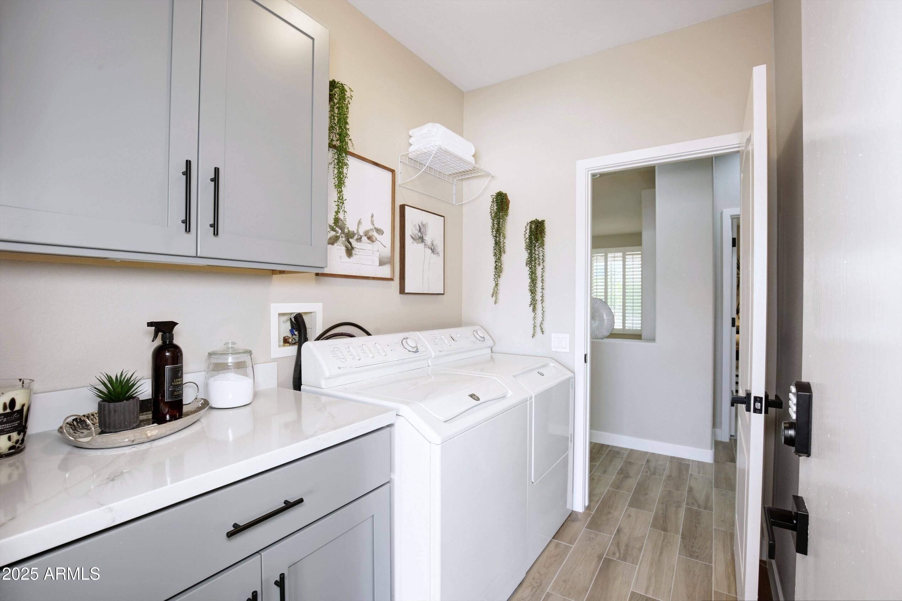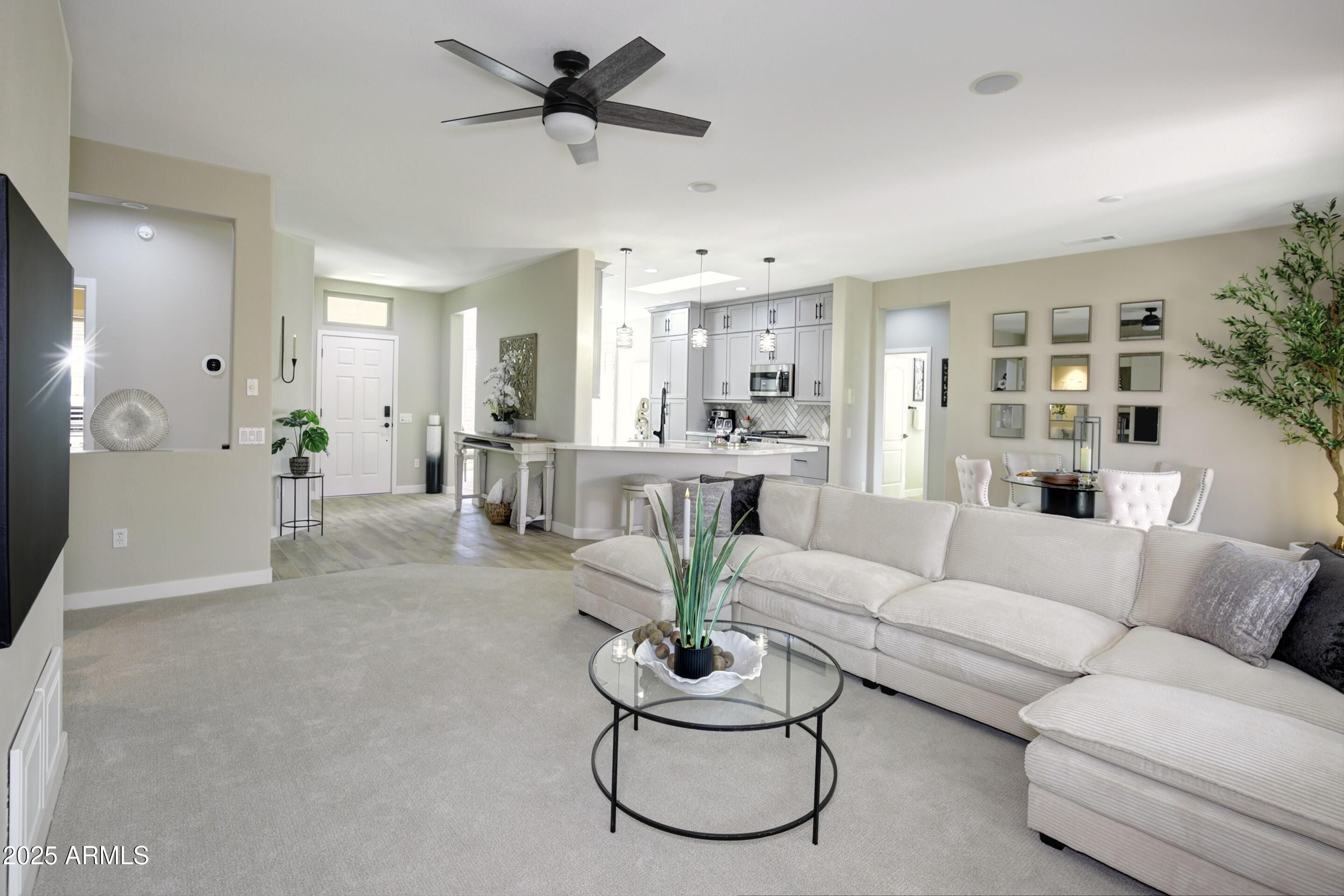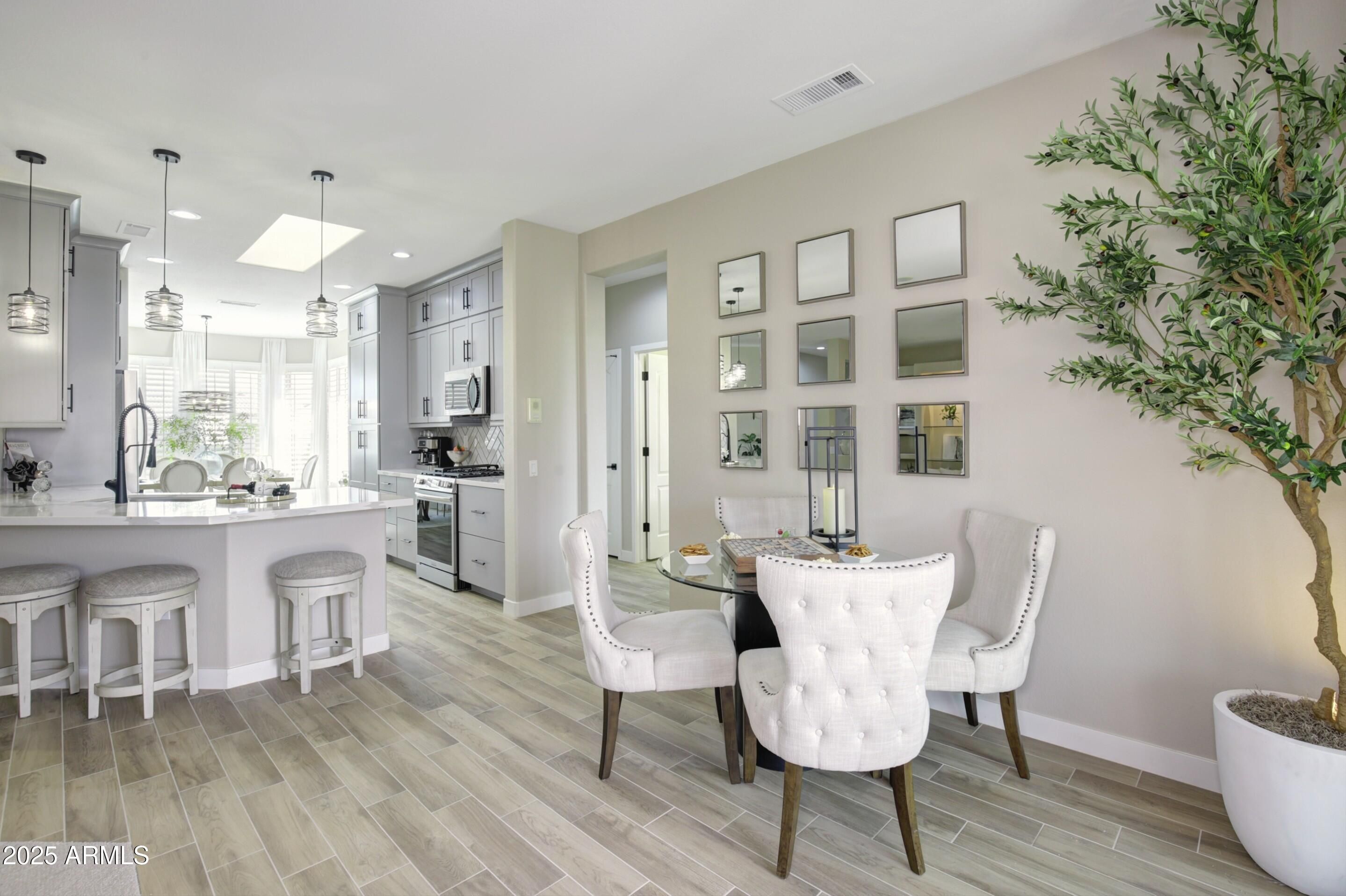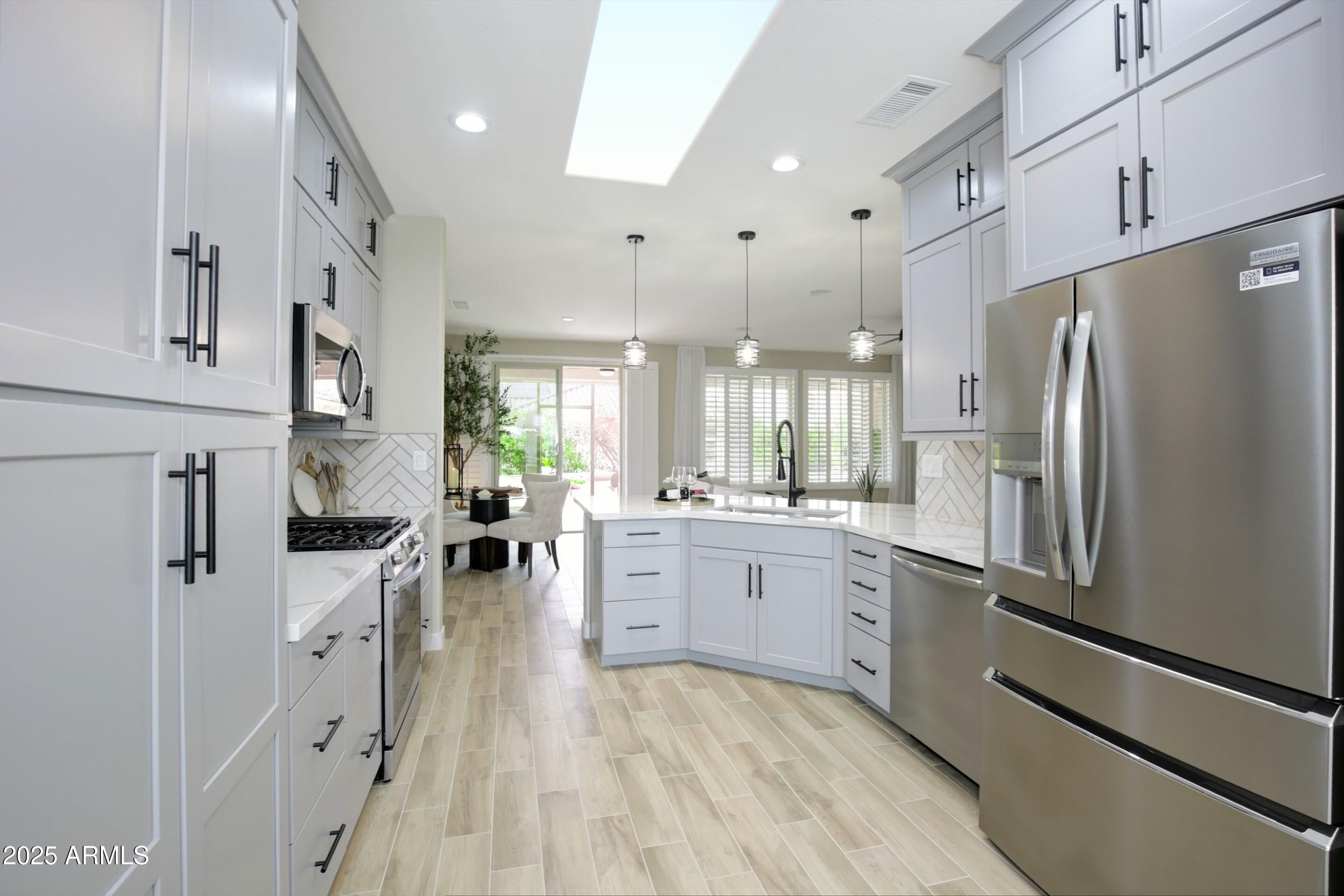 Modern Luxury Meets Resort Living in This Gorgeous Home! This beautifully updated 45+ home in The Grand sits on a quiet cul-de-sac and features 2 bedrooms, 2 baths + a versatile DEN (easily a 3rd bedroom). Every space has been thoughtfully redesigned with high-quality finishes—extended Arizona room, luxury flooring, fresh paint, and designer lighting. The stunning new kitchen (2024) includes Quartz counters, custom cabinetry, stainless appliances, gas stove, and skylights. Spa-style bathrooms (2024) newer concrete tile roof (2020), vinyl windows and plantation shutters (2024 ),add even more value. Close to 4 Championship golf courses, driving range, shopping, and dining. Enjoy resort-style pools, fitness centers, & events year-round. The Grand isn't just a community—it's a lifestyle