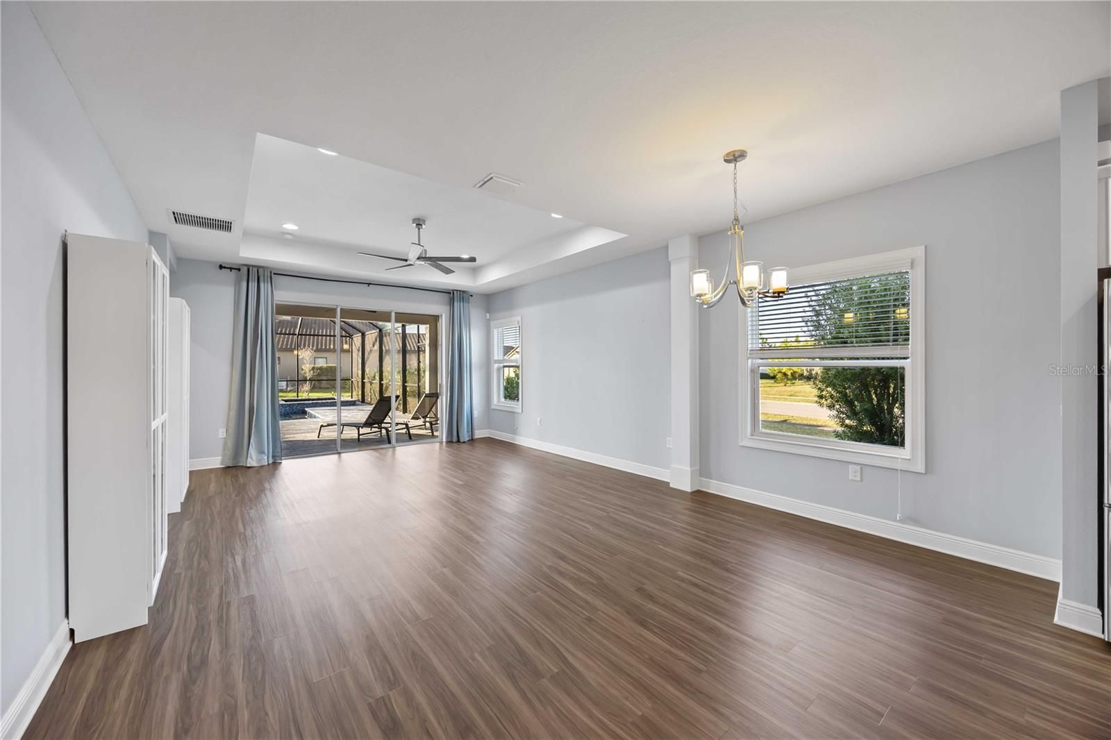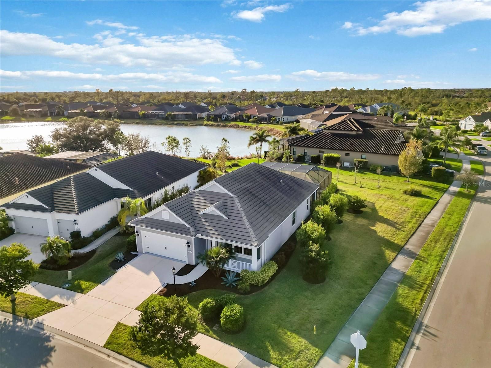 Live the ultimate Florida resort lifestyle in this stunning "Fresh Spring" model pool home! Situated on a premium, oversized corner lot inside the sought-after gated community of Grand Palm, this home features the largest pool in the whole neighborhood! Perfectly positioned high and dry in Flood Zone X, this home offers peace of mind with no flood insurance required. Step inside to discover a bright, open floor plan featuring durable luxury vinyl plank (LVP) flooring throughout the main living areas. The gourmet kitchen boasts modern white cabinetry, a stylish custom backsplash, gleaming quartz countertops, and a premium slide-in gas stove. Architectural details abound, including elegant coffered ceilings in the spacious living room and French doors that add privacy and sophistication to the versatile den—perfect for a home office or quiet retreat. This 3-bedroom, 2-bath home is completed by an oversized 2-car garage, providing ample storage for all your toys. The real showpiece, however, awaits in your backyard. Step out to your own private paradise featuring the largest saltwater heated pool in Grand Palm, measuring an impressive 30’ x 19’, accompanied by a relaxing 6’ x 6’ spa, all with full automation from your phone! With over 1,000 sq. ft. of outdoor living space, this lanai is designed for entertaining on a grand scale or simply soaking up the sun with a beautiful lake view. Grand Palm is a true nature-focused community offering residents unrivaled amenities, including a 39-acre lake for fishing and kayaking, miles of walking and biking trails, and two clubhouses. Stay active with the state-of-the-art fitness center, tennis, pickleball, and bocce ball courts, or cool off in the resort-style community pools with water slides and a splash pad. This home even includes a FREE GOLF CART so you can start living Florida’s resort lifestyle immediately!
