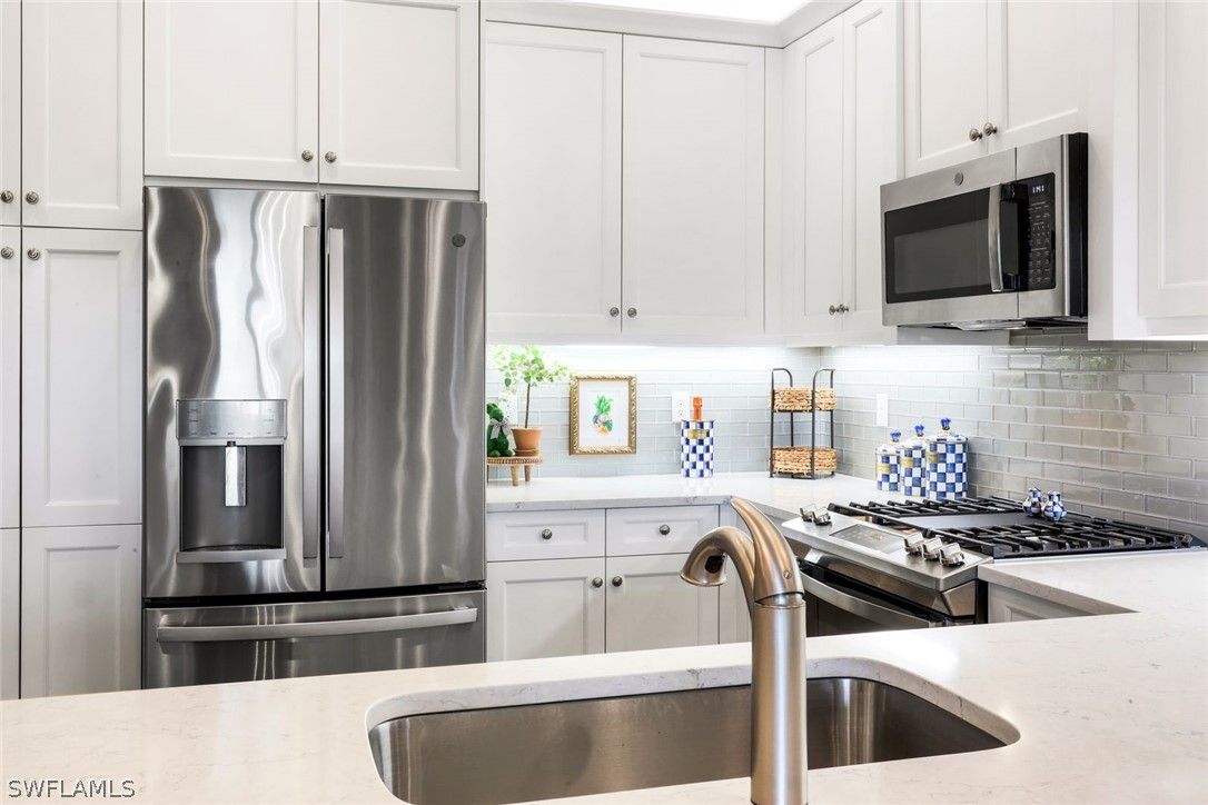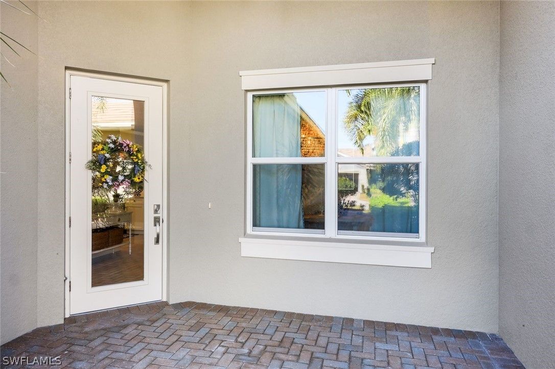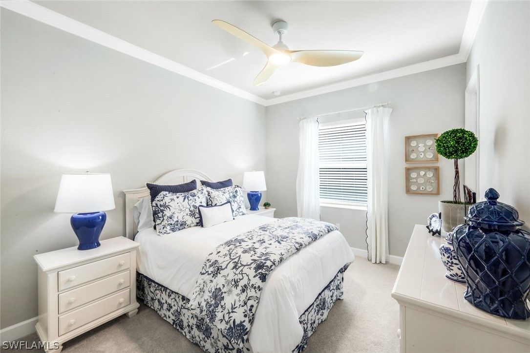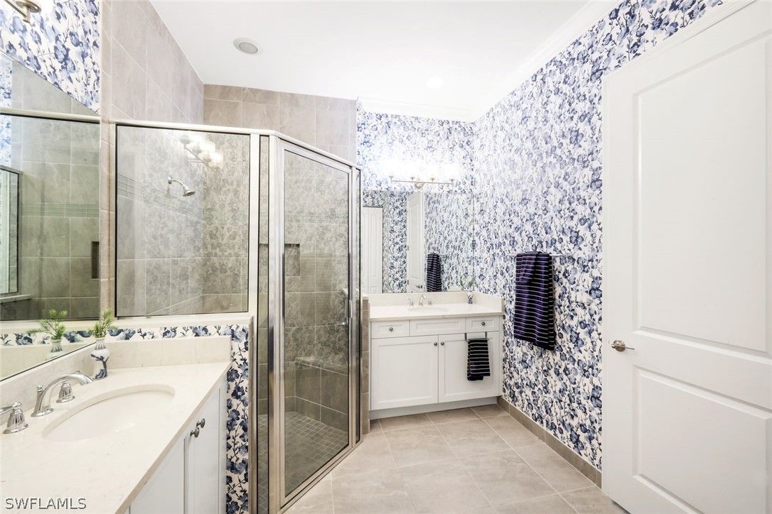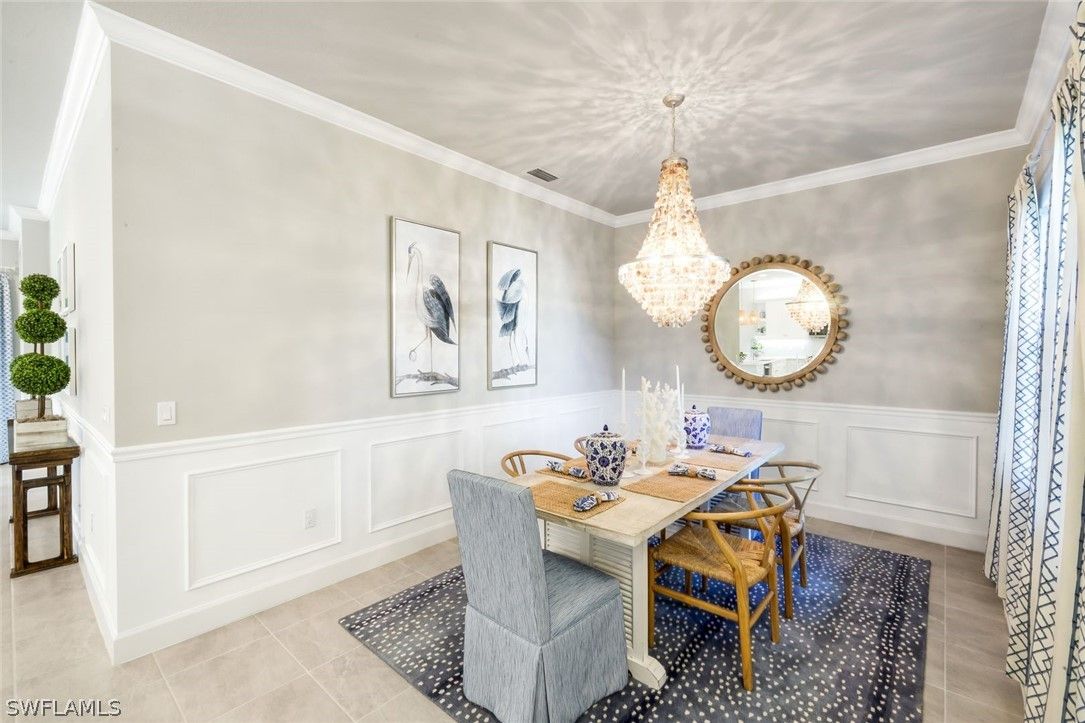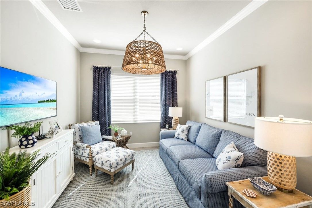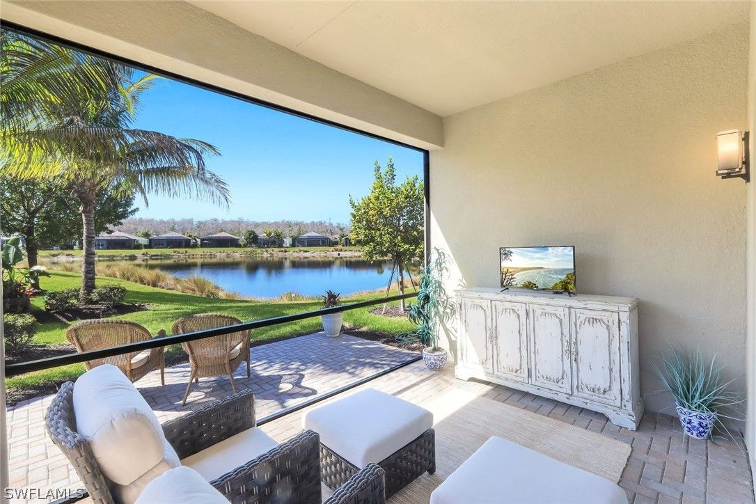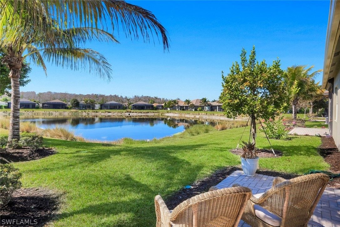 TURNKEY FURNISHED! This popular attached villa (Nantucket floor plan) comes decorated with upgraded COASTAL furniture and accessories and looks amazing providing a very comfortable living space. This beautiful home offers an open layout with 2 bedrooms + den, 2 bathrooms and a 2 car garage. The bright white kitchen features quartz countertops, subway tile backsplash, large stainless steel undermount sink, white raised panel wood cabinets with GE stainless steel appliances which includes a natural gas range, GE Profile Series refrigerator, microwave which is vented out, large built-in cabinet pantry, above and below cabinet lighting. Throughout the home you will see 5 1/4" crown molding and additional custom wood work along with 17" x 17" tiled floors the main living areas and den. The owner installed a wonderful light fixture package along with upgraded ceiling fans. The bathrooms come with large floor tile that includes large wall tile at the bathtub and shower enclosures along with quartz countertops and luxury height toilets. Other additions through the builder were an upgraded recessed lighting package, impact widows, glass front entry door and an extended paver patio. Step outside onto your covered paver patio with the additional patio deck where this space provides ample room to entertain or just relax when looking at the beautiful lake view. All of this is located with Valencia Bonita, a vibrant 55+ community offering unmatched amenities including a spectacular clubhouse, resort-style pools, state-of-the-art fitness center, pickleball and tennis courts, walking trails, full-service nail salon, restaurant and outdoor bar and an active calendar of social events and clubs. Do not miss your chance to own this impeccably upgraded, move-in ready home. Shedule your private tour today and experience the best of Southwest Florida living.