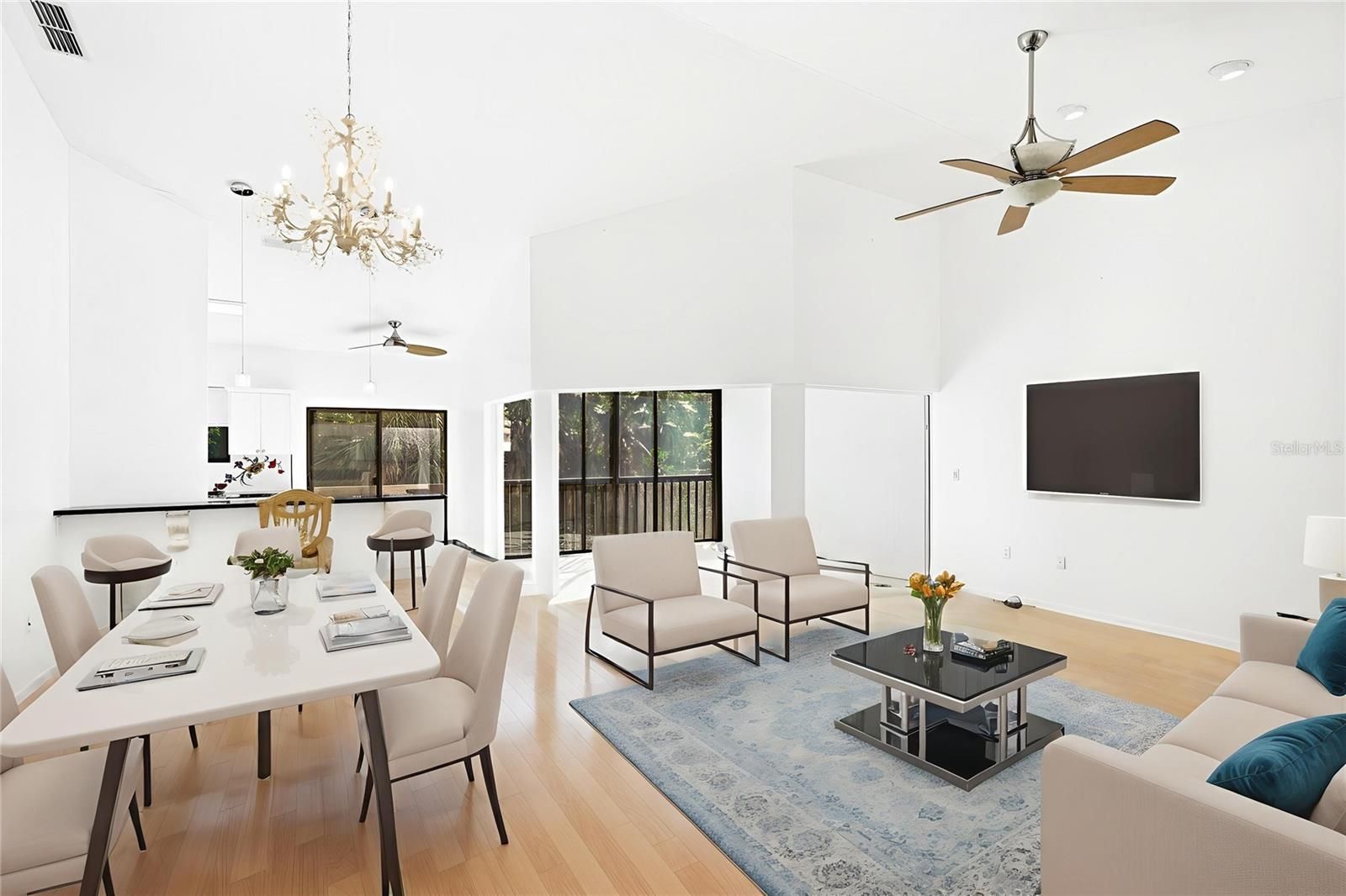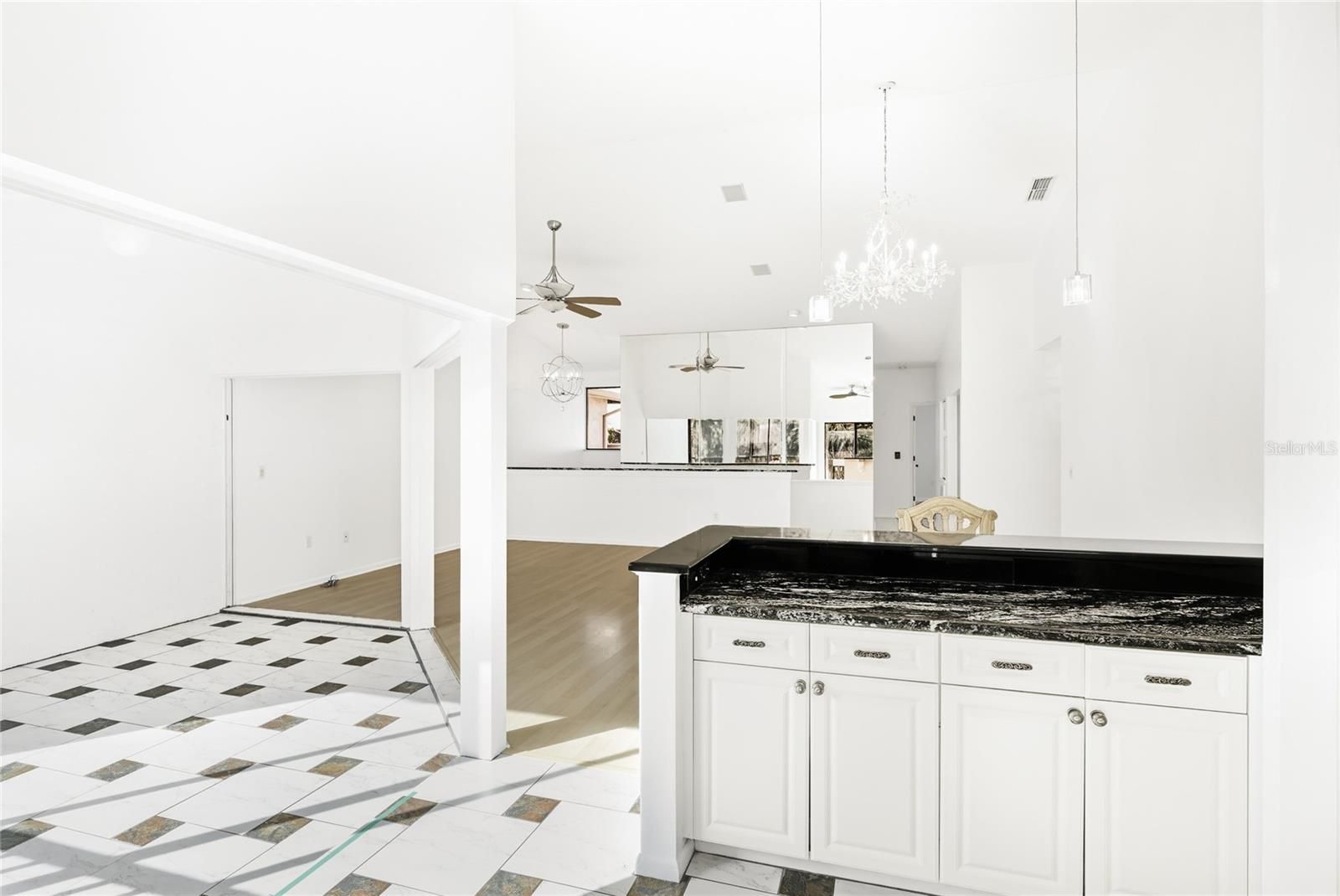 - Cathedral Ceiling(s), Ceiling Fan(s), Dry Bar, Eat-in Kitchen, High Ceilings, Living/Dining Room, Open Floorplan, Stone Counters, Thermostat, Window Treatments