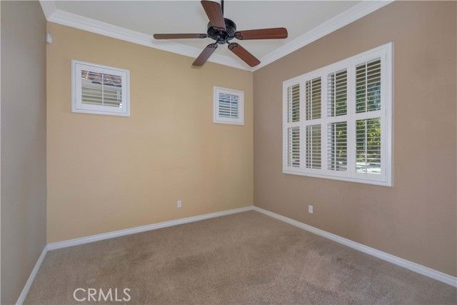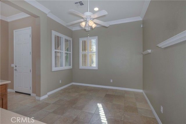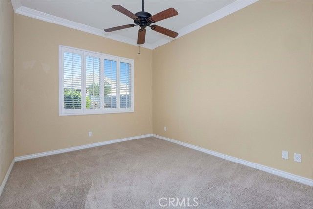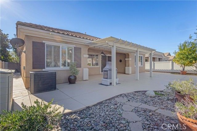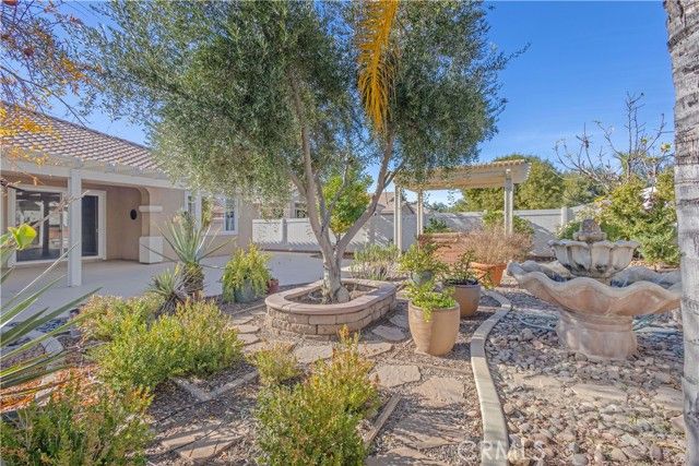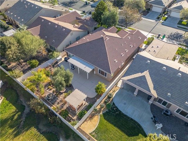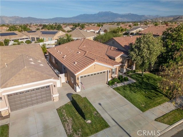 HUGE PRICE DROP! Welcome to this beautifully upgraded home located in the highly desirable 55+ community of Solera Diamond Valley by Del Webb; located within walking distance to clubhouse. Thoughtfully enhanced from top to bottom, this spacious & versatile popular "El Dorado" floor plan offers 2 bedrooms (each on opposite sides of home) 2.5 bathrooms, formal dining room & generous bonus room that can be used as a den, hobby room, exercise rm, or optional 3rd BD. From the moment you enter, you'll notice the attention to detail with crown molding throughout, custom plantation shutters, upgraded paint, & ceiling fans in nearly every room, including the patio. The open-concept kitchen flows seamlessly into family room & features stainless steel appliances, center island with breakfast bar, Corian countertops, recessed lighting, upgraded cabinetry, pull-out shelving & newer sink. The primary suite is a true retreat, offering a large walk-in closet with custom shelving & a spa-inspired bath complete with oversized soaking tub, separate step-in shower featuring a custom teakwood shower mat & dual vanities. The half bath has been tastefully updated with bead board accents & Pottery Barn mirror. The laundry room includes upper & lower cabinetry, utility sink & decorative stainless shelving. Step outside through oversized sliding doors to a peaceful & meticulously designed backyard oasis, complete with private Caldera spa which includes pump, filter, ozone system & heater. Enjoy year-round relaxation under the extended alumawood patio cover with ceiling fan or gather around the freestanding outdoor fireplace with chimney. Custom concrete, river rock, stepping stones, fountain, raised planters, fruit trees, solar lighting, perimeter water faucets, block walls & vinyl fencing create a serene & functional outdoor living space. The garage is equally impressive with epoxy flooring, Gladiator cabinets, rail systems with hooks, Rubbermaid mounting bars, upgraded lighting, workbench with solid wood top, replaced garage door opener, newer gas water heater & replaced pressure regulator. Residents enjoy resort-style amenities including indoor & outdoor pools, spa, workout fitness center that includes indoor walking track, library, billiard tables, conference rooms, bocce ball courts, pickleball courts & tennis courts. The community has daily, monthly & annual events that bring the community together! This exceptional home offers comfort, quality & lifestyle; truly a must-see!