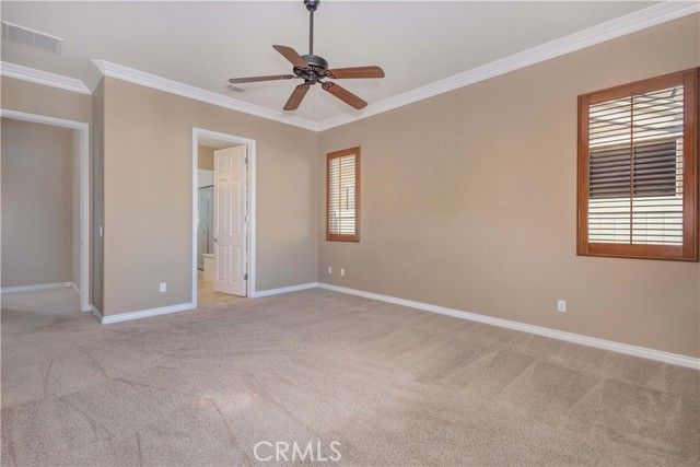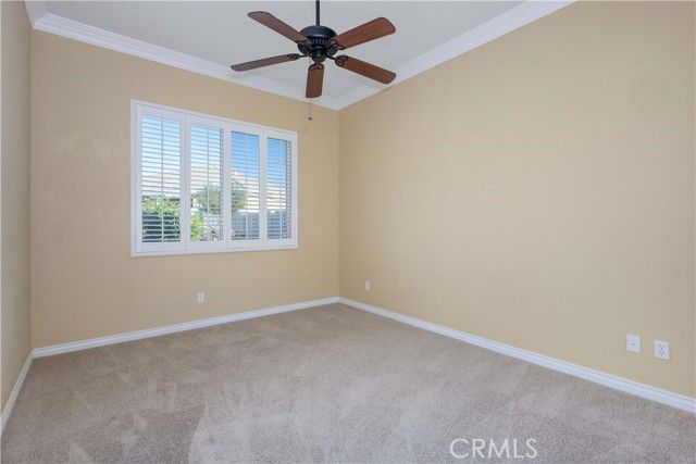 Welcome to this beautifully upgraded home located in the highly desirable 55+ community of Solera Diamond Valley by Del Webb. Thoughtfully enhanced from top to bottom, this spacious & versatile popular "El Dorado" floor plan offers 2 bedrooms (each on opposite sides of the home) 2.5 bathrooms, formal dining room & a generous bonus room that can be used as a den, hobby room, exercise space, or optional 3rd bedroom. From the moment you enter, you'll notice the attention to detail with crown molding throughout, custom plantation shutters, upgraded paint, & ceiling fans in nearly every room, including the patio. The open-concept kitchen flows seamlessly into the family room & features stainless steel appliances, a center island with breakfast bar, Corian countertops, recessed lighting, upgraded cabinetry, with pull-out shelving, & newer sink. The primary primary suite is a true retreat, offering a large walk-in closet with custom shelving & a spa-inspired bath complete with an oversized soaking tub, separate step-in shower featuring a custom teakwood shower mat, & dual vanities. The half bath has been tastefully updated with bead board accents & a Pottery Barn mirror. The laundry room includes upper & lower cabinetry, utility sink, & decorative stainless shelving. Step outside throug