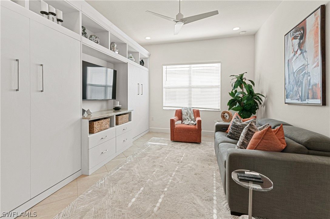Welcome to a meticulously kept, move-in-ready home in the luxurious Valencia Bonita Adult Community! This impressive villa offers 2,024 square feet of luxury with impact-resistant windows and doors throughout the residence. The floor plan includes 2 spacious bedrooms with custom closets, a large den/study, and 2.5 bathrooms. The large den has 2 full size murphy beds that can sleep an additional 4 people. The upgraded kitchen with a built-in pantry, expansive quartz countertops, upgraded custom backsplash, additional cabinetry, and stainless steel appliances flows seamlessly into a light and airy great room. This well-arranged home also features a separate dining room, upgraded neutral tile floors, decorator ceiling fans, and a frosted glass front door. The garage has an upgraded epoxy floor, extra storage, an insulated garage door, and a whole-house water filtration system. Valencia Bonita residents enjoy the magnificent 45,000 sq ft community clubhouse, complete with a full-service restaurant/bar that offers inside/outside dining, a state-of-the-art fitness center, a variety of fitness classes, card rooms, art studios, spa/nail salon, 70+ resident clubs, and a grand social hall with a dance floor. Outdoor amenities abound, including multiple pools (resort style, lap, and resistance), a dedicated racquet club with pickleball and tennis courts, and bocce courts. A full-time on-site lifestyle staff ensures there is something for everyone to enjoy by providing a vibrant calendar of events, including shows and concerts.