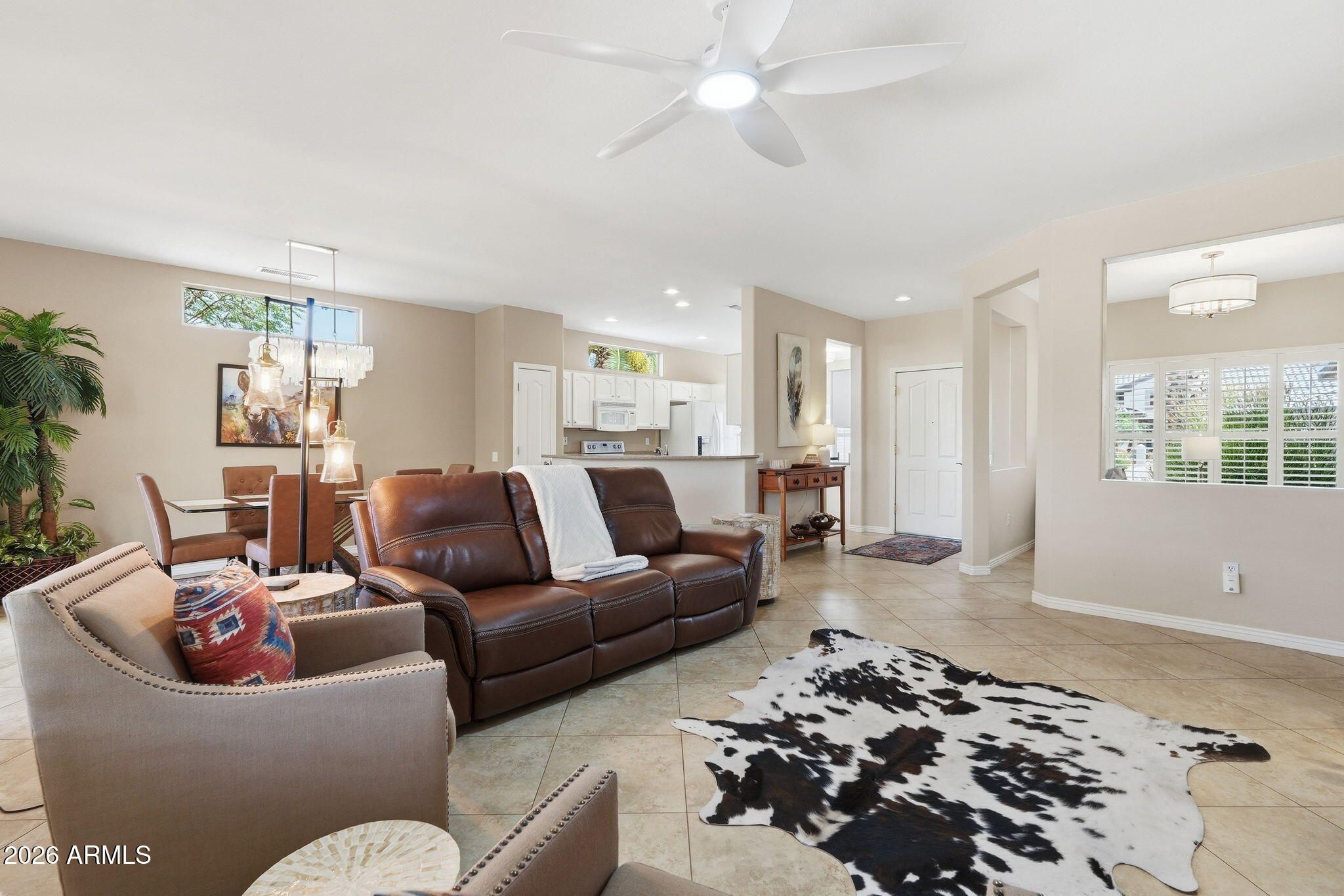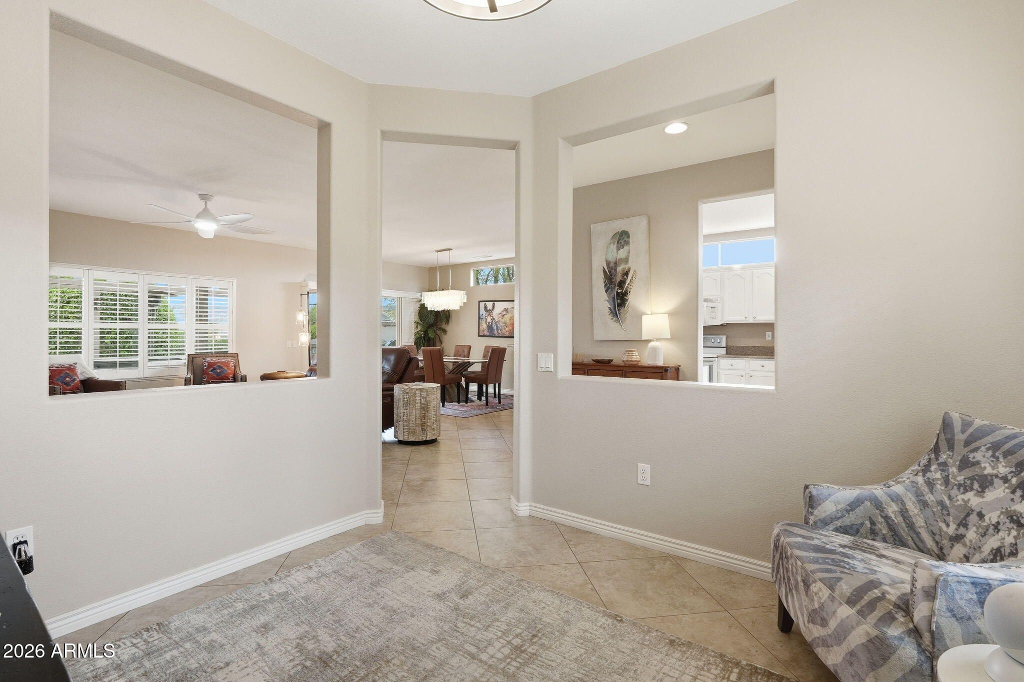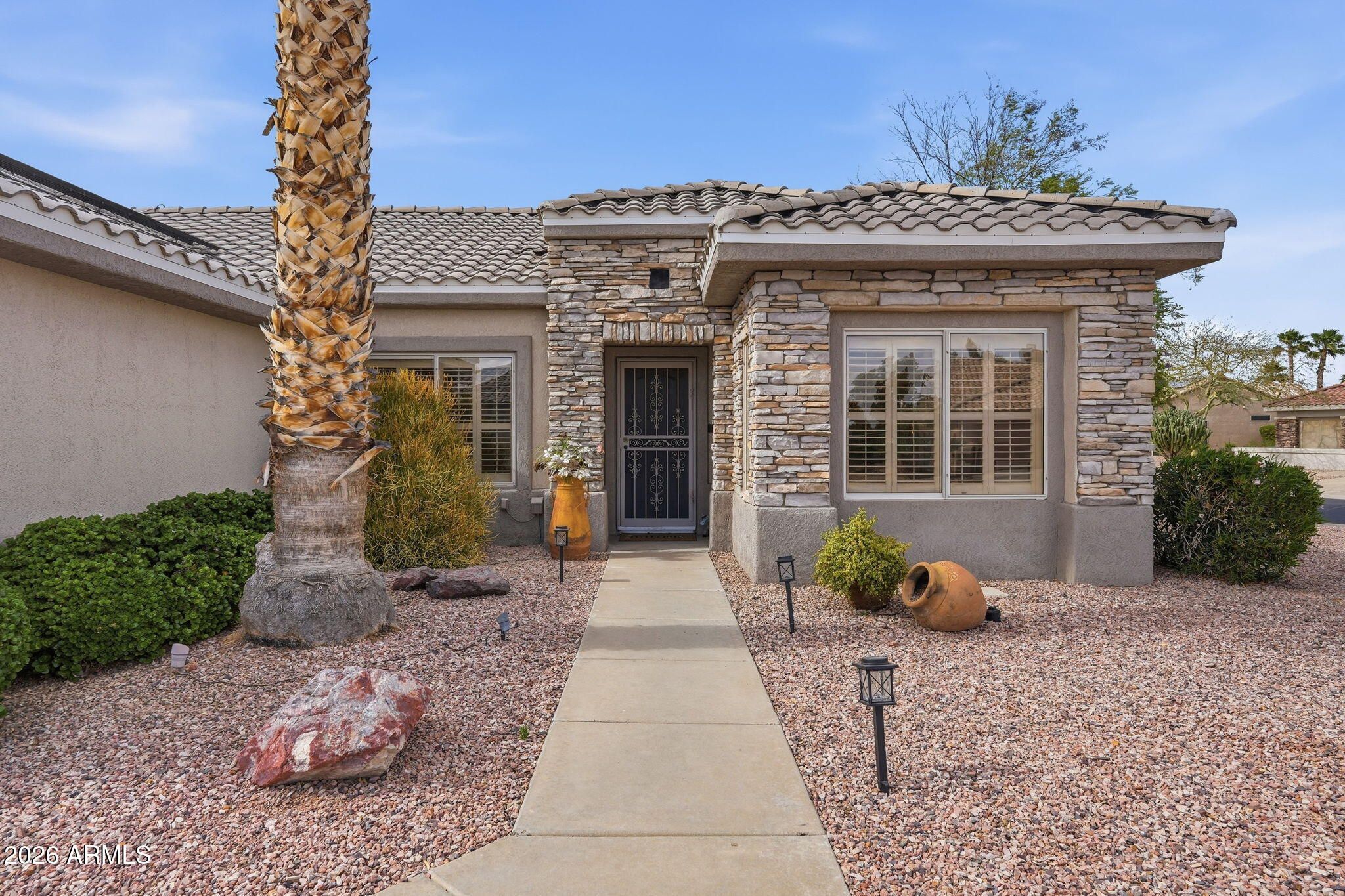 Exquisite corner lot residence showcasing a NEW ROOF, timeless finishes & refined design throughout. This beautifully appointed 2 bedroom plus den home features a striking stone exterior & meticulously designed desert landscaping, offering both elegance & effortless upkeep. Sophisticated interior, classic plantation shutters, & a seamless palette of soft, neutral tones creates a light, airy ambiance. The versatile den provides an ideal space for a private office, library, or guest retreat. Designed for exceptional indoor/outdoor living, the backyard is a serene oasis featuring a covered patio enhanced by a custom pergola, perfect for upscale entertaining or tranquil evenings under the Arizona sky. Lush fruit trees add a touch of charm and natural beauty to the space.