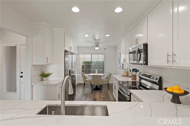 From the moment you step inside, the breathtaking lake and hillside views will captivate you, setting the stage for this beautifully updated single-level home that perfectly blends comfort, style, and convenience. Serene, picturesque lake views from the living room, dining room, and primary bedroom infuse the home with a sense of tranquility and natural beauty. Step outside through the sliding glass doors in the living room or primary bedroom to a spacious double-wide patio-perfect for sipping your morning coffee or hosting sunset gatherings. The stunning scenery provides an idyllic backdrop for both quiet mornings and evening relaxation. The heart of the home is a stunning, newly designed kitchen featuring sleek stainless steel appliances, elegant quartz countertops, and custom cabinetry with soft-close drawers, doors, and gliding shelves. As a bonus, the expansive kitchen offers a breakfast nook bathed in natural light from the oversized windows. The luxurious ensuite primary bedroom boasts a wall of closets, breathtaking views, and direct patio access. The spa-like bathroom is adorned with new cabinetry, quartz countertop, dual sinks, a spacious soaking tub, a separate shower and water closet. Designed for seamless indoor-outdoor living, this lower-level home features vinyl pl