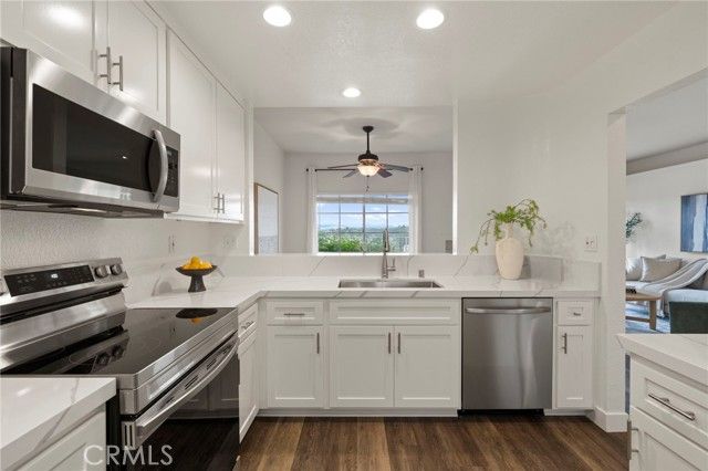 From the moment you step inside, the breathtaking lake and hillside views will captivate you, setting the stage for this beautifully updated single-level home that perfectly blends comfort, style, and convenience. Serene, picturesque lake views from the living room, dining room, and primary bedroom infuse the home with a sense of tranquility and natural beauty. Step outside through the sliding glass doors in the living room or primary bedroom to a spacious double-wide patio—perfect for sipping your morning coffee or hosting sunset gatherings. The stunning scenery provides an idyllic backdrop for both quiet mornings and evening relaxation. The heart of the home is a stunning, newly designed kitchen featuring sleek stainless steel appliances, elegant quartz countertops, and custom cabinetry with soft-close drawers, doors, and gliding shelves. As a bonus, the expansive kitchen offers a breakfast nook bathed in natural light from the oversized windows. The luxurious ensuite primary bedroom boasts a wall of closets, breathtaking views, and direct patio access. The spa-like bathroom is adorned with new cabinetry, quartz countertop, dual sinks, a spacious soaking tub, a separate shower and water closet. Designed for seamless indoor-outdoor living, this lower-level home features vinyl plank flooring and plush carpeting in the bedrooms, creating a perfect balance of elegance and comfort. Additional updates include a new security front door to welcome refreshing lake breezes, ceiling fans, energy-efficient LED lighting and a convenient indoor laundry closet with storage. An inviting gas fireplace and elegant window treatments add charm and functionality. With two garages, convenient guest parking directly across from the garages, this home covers all your practical needs. Enjoy the Lake’s lifestyle and easy access to the community's lake and facilities, all within a secure neighborhood with regular security patrols. The Panorama community offers exclusive amenities, including a private pool, spa, and recreation room. Residents also enjoy access to the Lake San Marcos community center, which features two additional pools, tennis and pickleball courts, and a vibrant social calendar. In addition, you will find The Lakehouse Resort, restaurants, two golf courses, boat & kayak rentals and community events year-round. This home is more than just a place to live—it's a serene retreat offering an unparalleled lifestyle. Don’t let this opportunity pass you by!