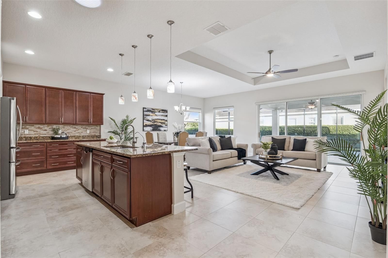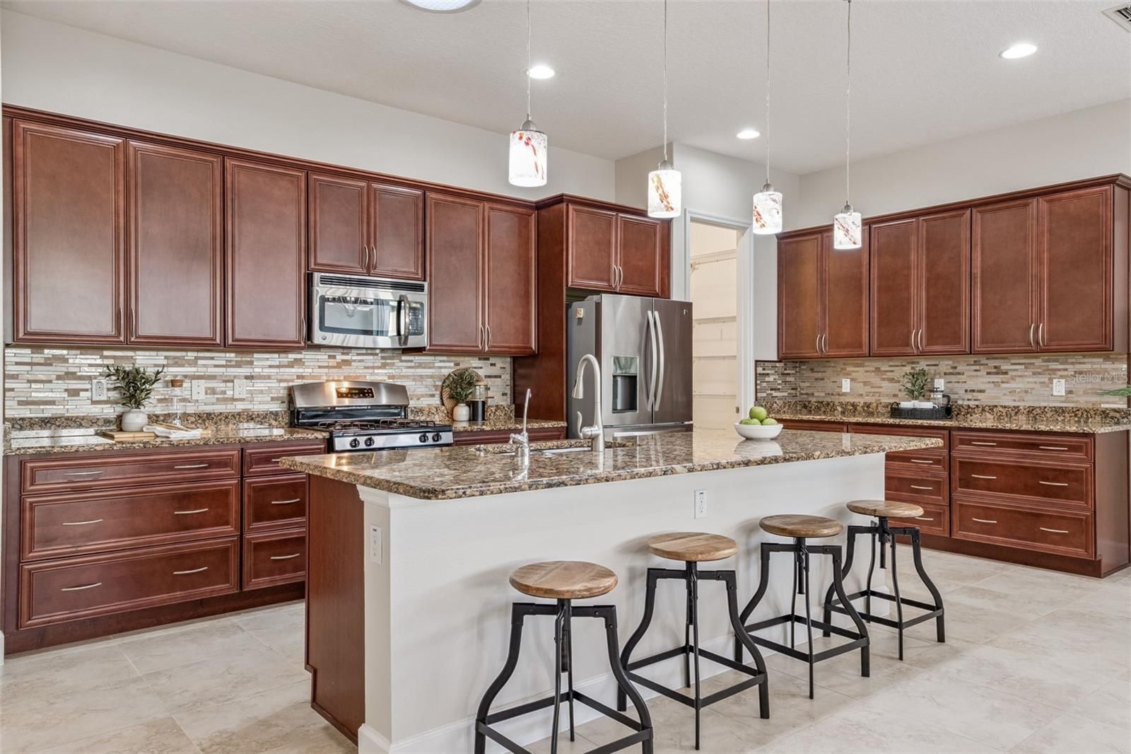 Light & Bright Kolter Lily on a large corner homesite with a 24’ x 21’ screen enclosed tiled patio within the 55+ Victoria Gardens neighborhood. This 2 Bedroom 2 Bath plus Den floorplan has a GREAT ROOM layout. The gourmet kitchen is a chef’s dream that offers 42” Maple “soft close” cabinets w/ crown molding, Pot & Pan drawers, Granite countertops, large breakfast island w/ pendant lighting above, 4-burner natural gas range, walk-in pantry & stainless steel appliances. Porcelain tile floors flow throughout home. Personalized features include leaded glass front entry door, 5” baseboards, Plantation style shutters, reverse osmosis water filtration system, freshly painted interior, remote-controlled shades in Great Room, electric & natural gas connections for dryer & a built-in laundry tub with storage cabinets in utility room. The 13’6” x 16’6”’ primary bedroom offers a tray ceiling, ceiling fan & plenty of wall space for your furniture placement. En suite bathroom provides raised height separate vanities, framed mirrors, glass enclosed walk-in shower & a 13’6” x 5’6” walk-in closet. Homeowner will enjoy having their morning coffee or late afternoon beverage on the large screen enclosed covered patio w/ a natural gas connection for an outdoor grill & privacy hedge. The 19’ x 24’ garage provides additional space for larger vehicles or a work bench, ceiling mounted storage rack, tankless water heater & a insulated garage door. All appliances stay with the home. Victoria Garden residents have access to their own social Private Clubhouse. HOA fee includes lawn care, Spectrum HFC TV & internet and reclaimed water for yard irrigation. Community is within 1 mile of I-4 that offers great access to the east coast beaches, Orlando (40 minutes) and 3 International airports within 1 hour.