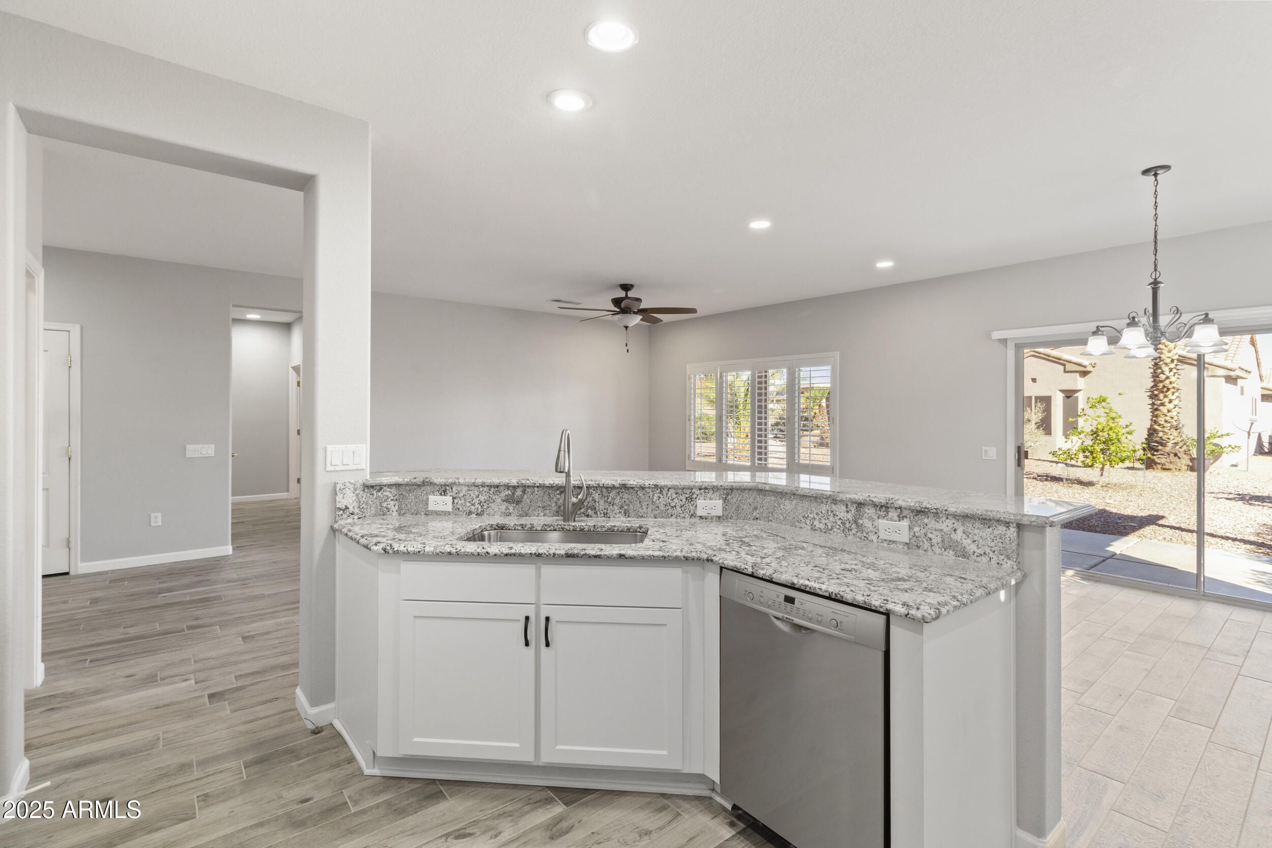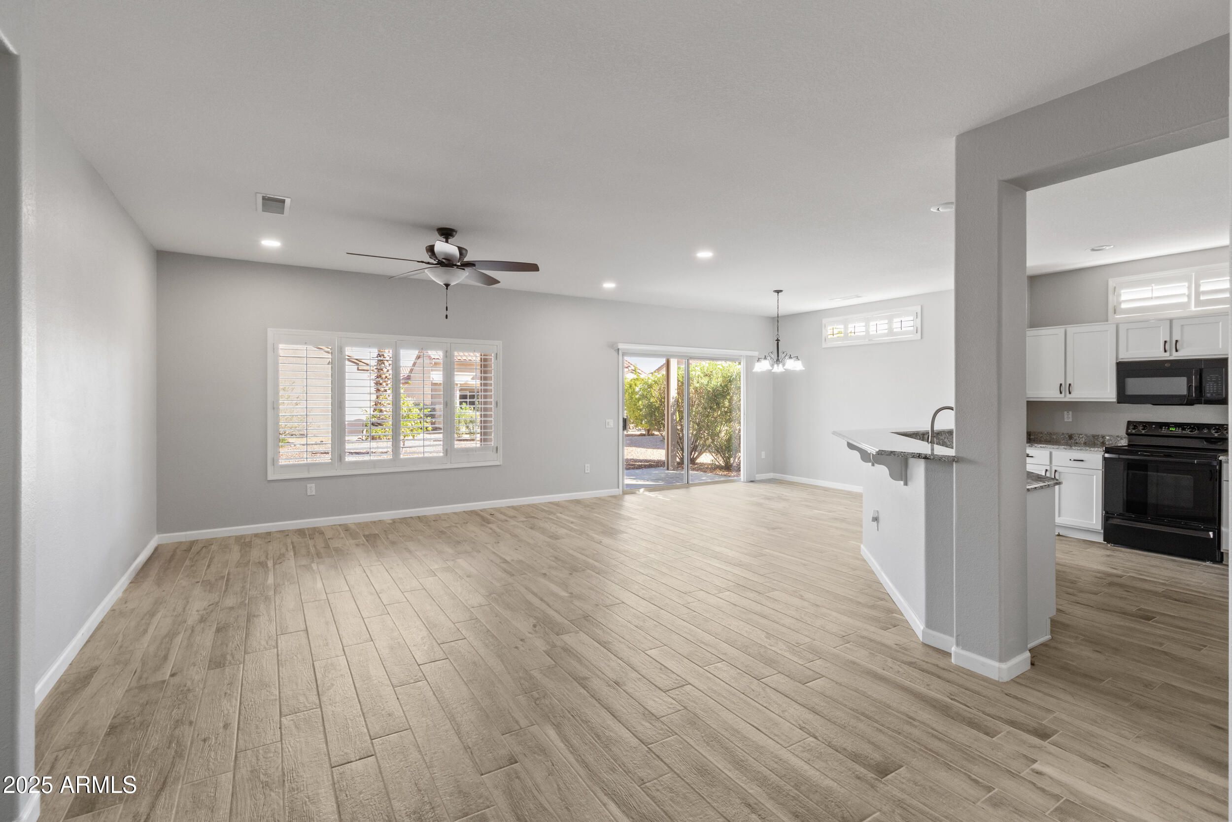 Welcome to this beautifully updated home located in the highly desirable Sun City Grand community! This light and bright open-concept floor plan features fresh interior paint, wood-look tile flooring, and plenty of natural light throughout. The spacious great room flows seamlessly into the dining area and updated kitchen, complete with white cabinetry, granite countertops, and a breakfast bar perfect for entertaining. The large sliding glass doors open to a covered back patio, where you can enjoy Arizona's gorgeous weather in your low-maintenance backyard. Located in the heart of Sun City Grand, this home offers access to world-class amenities including golf, fitness centers, swimming pools, walking trails, and endless social clubs and activities.