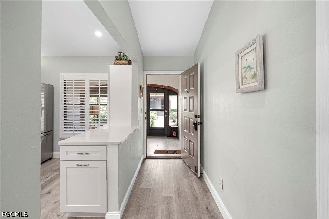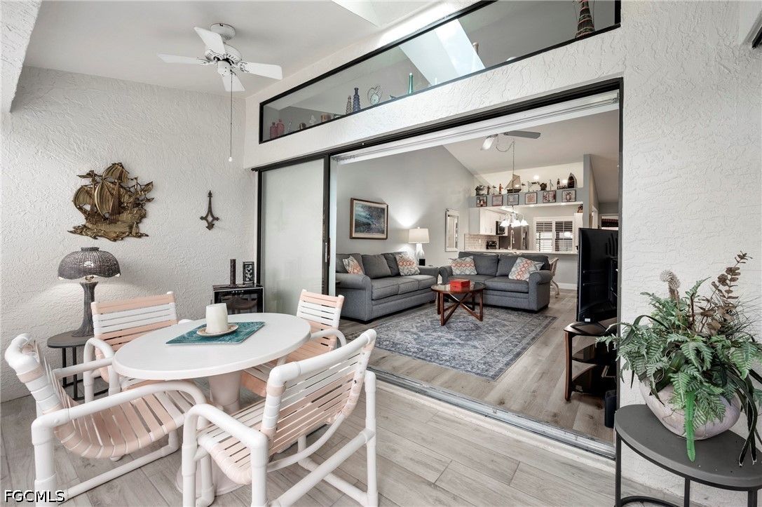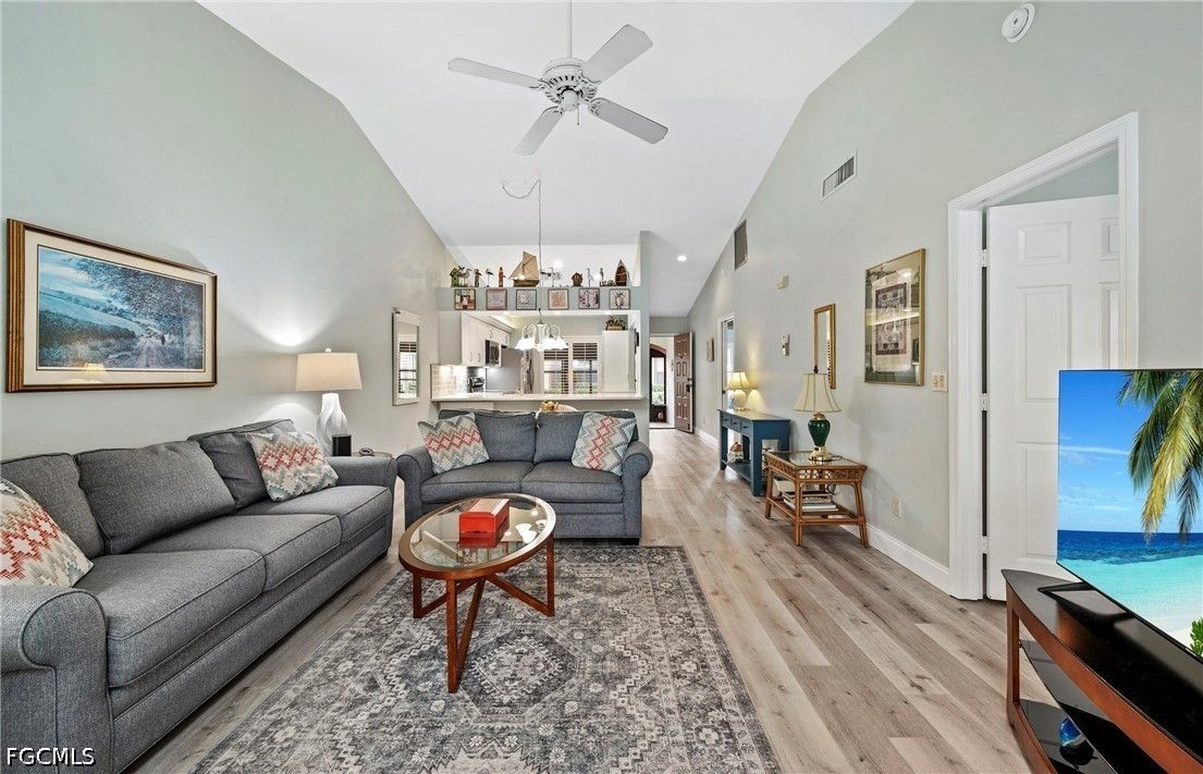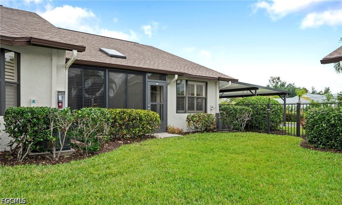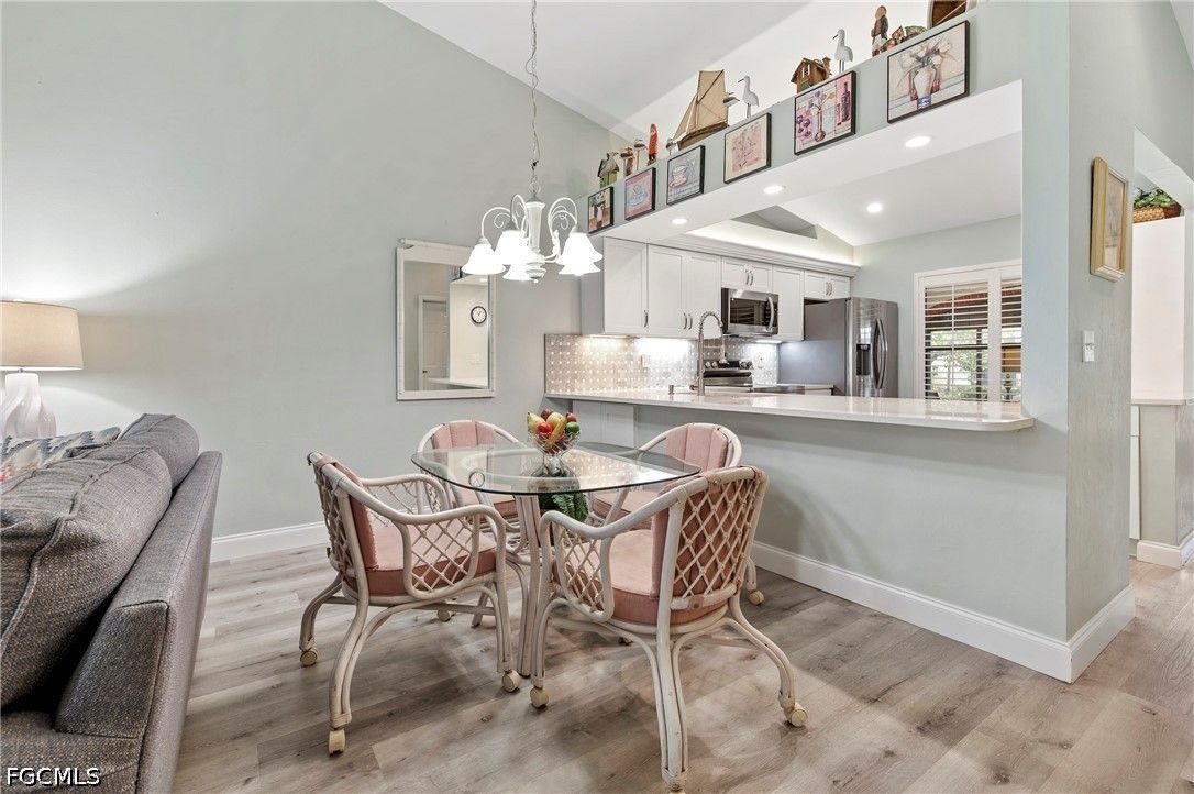 Beautifully maintained pool villa with vaulted ceilings located in a desirable gated community just minutes from Fort Myers Beach and Sanibel Island. This unique corner villa offers exceptional indoor-outdoor living, with a courtyard pool directly accessible from the back door—perfect for relaxing or entertaining. The rear and front lanais are enclosed with sliding windows. Back lanai is thoughtfully furnished with a 4 top table and chairs. At the front of the home, a glassed in lanai is furnished with chairs and side table for a relaxing atmosphere to view the landscape. Inside, the open kitchen features timeless shaker cabinetry, quartz countertops with tile backsplash, stainless steel appliances and lighting. Updated bathrooms include modern cabinetry, solid-surface countertops, mirrors, and lighting. Additional upgrades include two updated showers, custom window treatments, and tasteful furnishings that elevate comfort and style throughout the home. Primary bedroom features bay window area. The laundry room is located inside the villa. Residents enjoy resort-style amenities at the main clubhouse, including a fitness center, pool aerobics, tennis, pickleball, shuffleboard, bocce ball, and more.