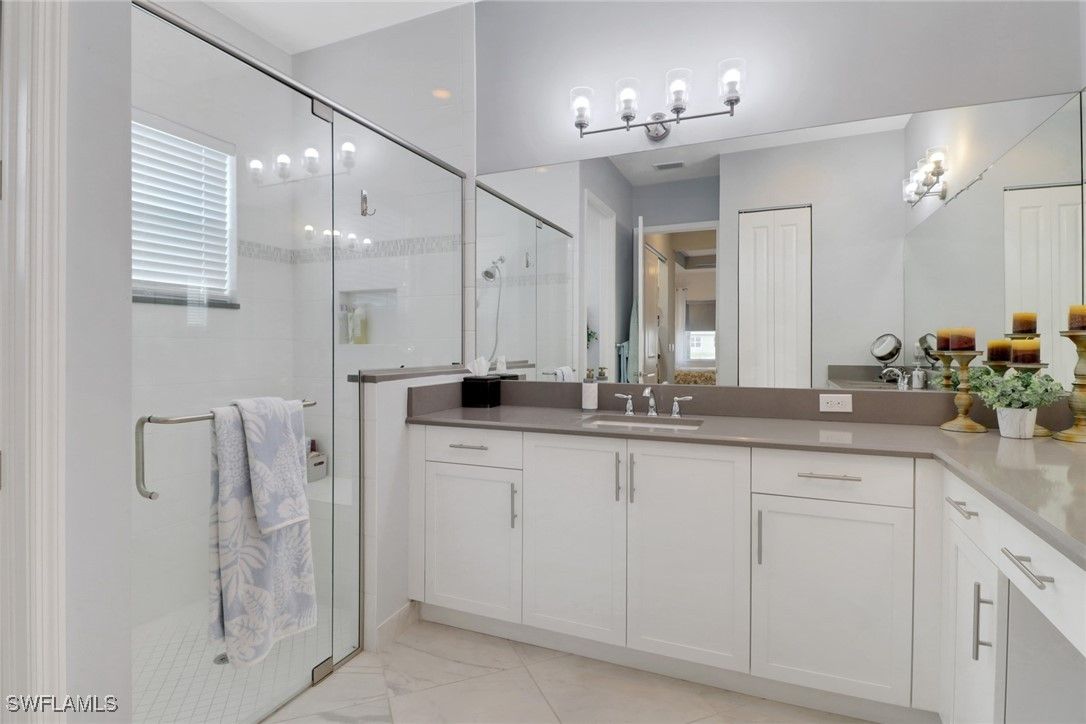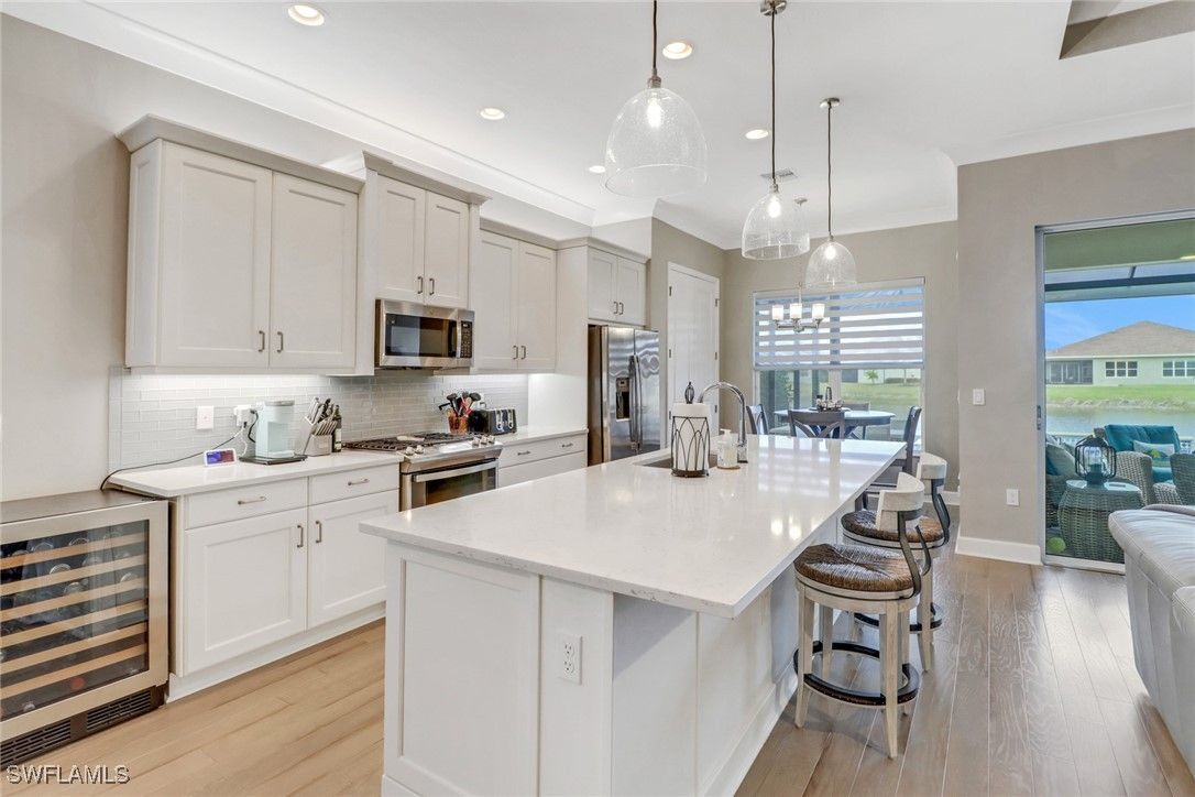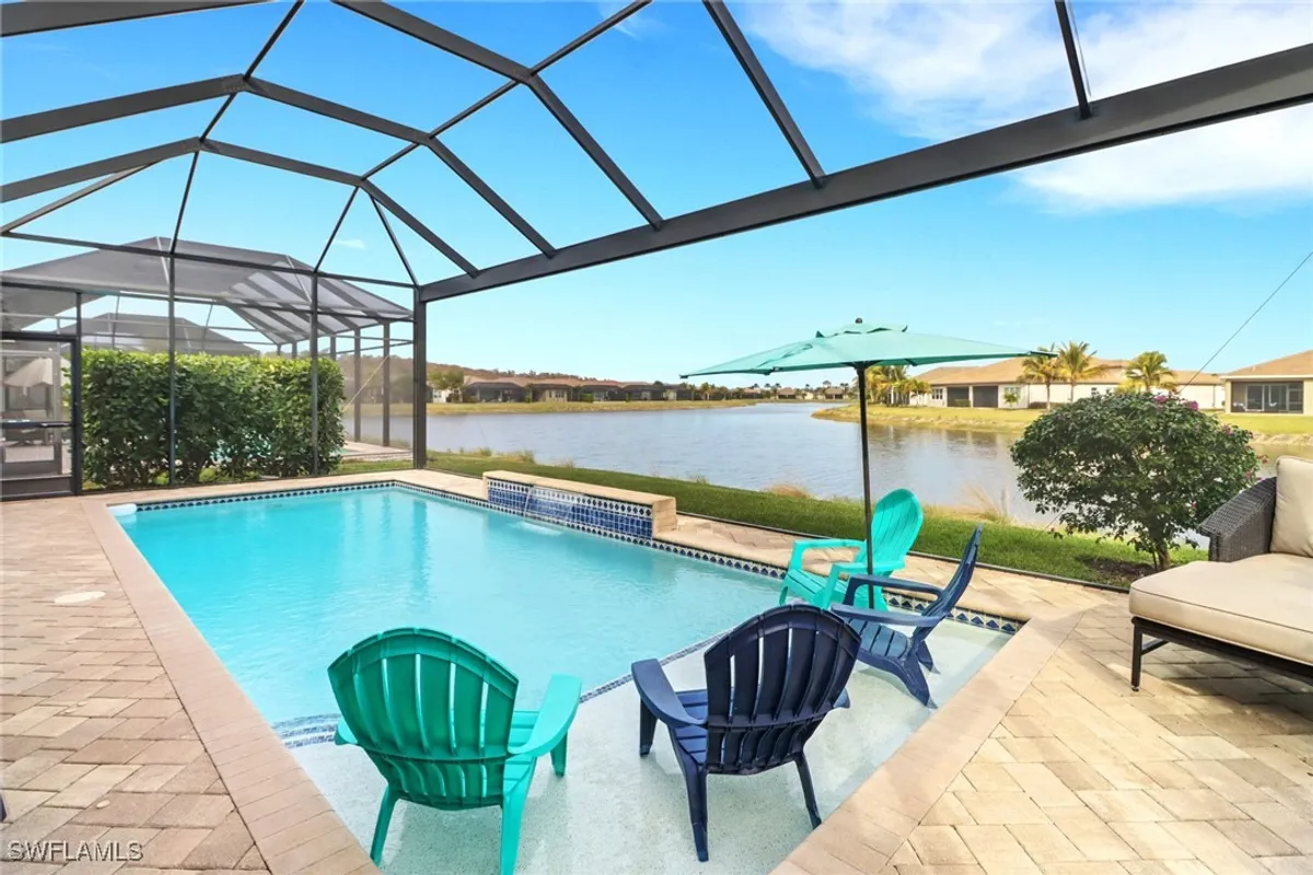 One of the most spectacular long lake views in the active adult community of Valencia Bonita. This home features 3 bedrooms, den and 2 and 1/2 baths. So many upgrades. Crown molding, upgraded painting, dry bar, custom closets in the master bedroom. Upgraded cabinet lighting along with upgraded countertops in the kitchen and baths. In the past 2 years the refrigerator, washer and dryer have been upgraded. New carpet in 2024 in all the bedrooms. The front exterior has a screened in entry area along with professional landscaping and lighting. The heated pool boasts a picture frame screen to enhance your lake view. Electric hurricane shutters allows for lanai furniture to remain outside during a storm, while keeping the rain out. In the garage, there is a water filtration unit and a mini split to keep the garage at a comfortable temperature. A whole house generator offers peace of mind. Valencia Bonita is close to the beaches, grocery stores and other shopping. 25 minute ride to the airport. The community has a life style director for a variety of fun and entertaining events that are held in the 45,000 sq ft clubhouse. This 55+ community has 3 pools, pickleball courts, tennis courts and bocce. A very desirable feature is the on site dining and bar.
