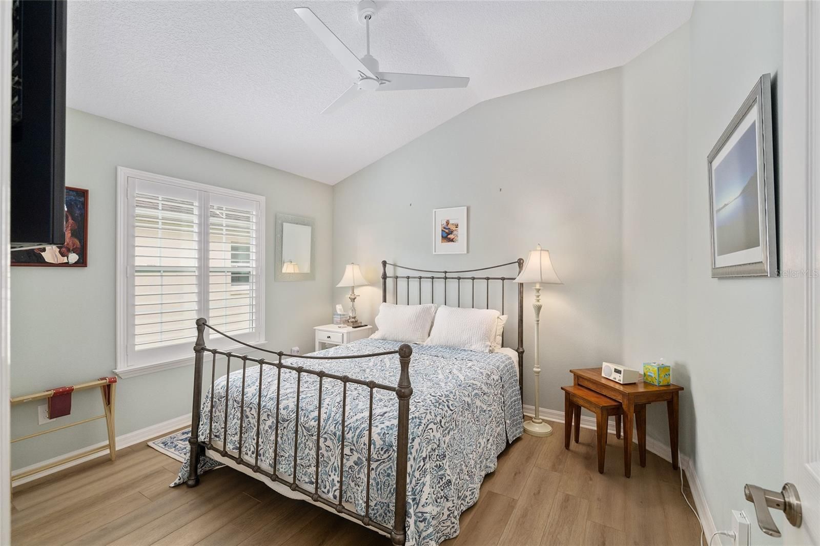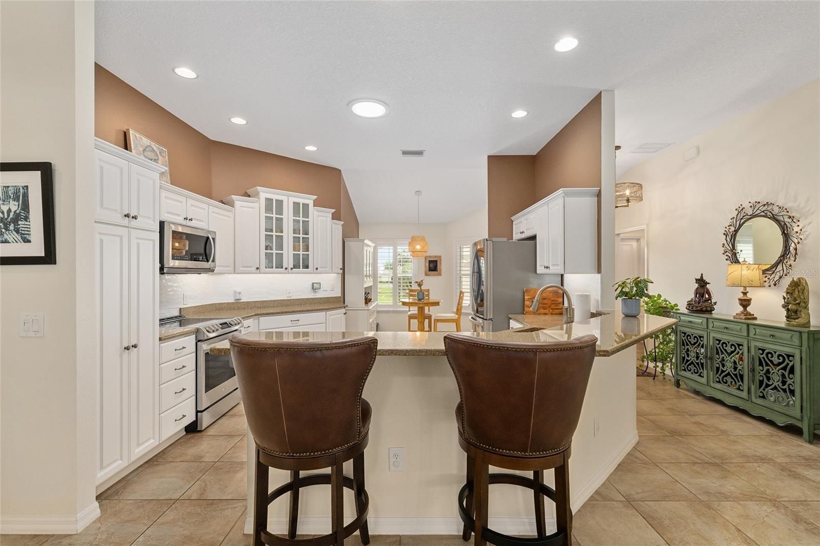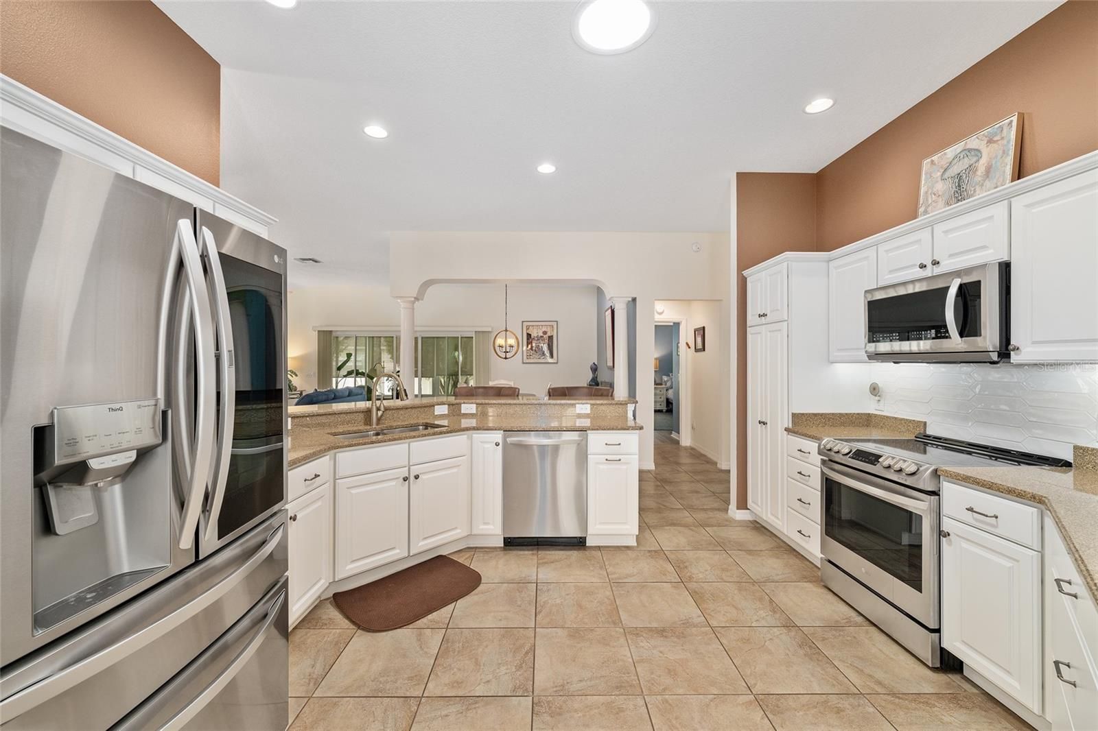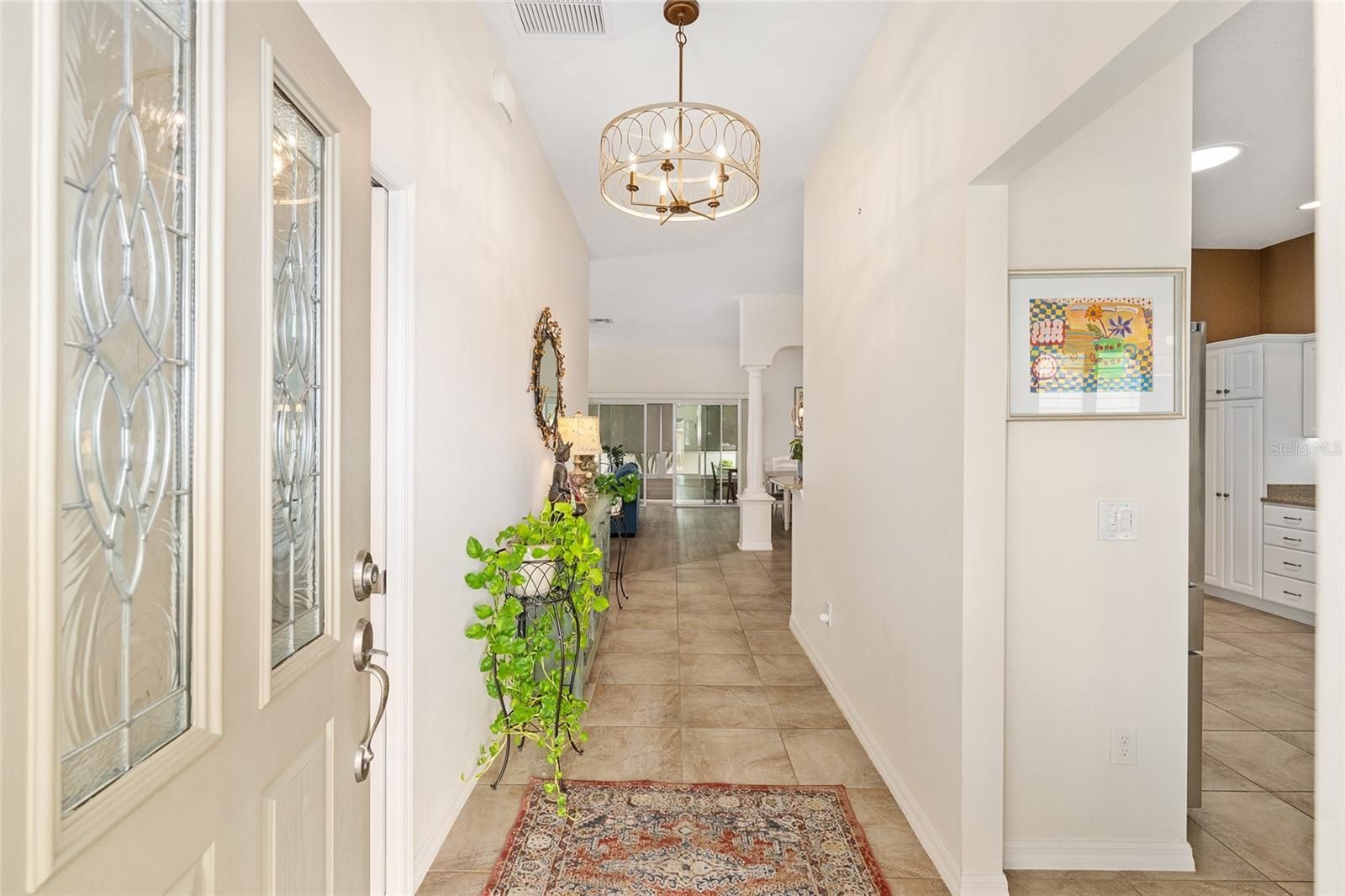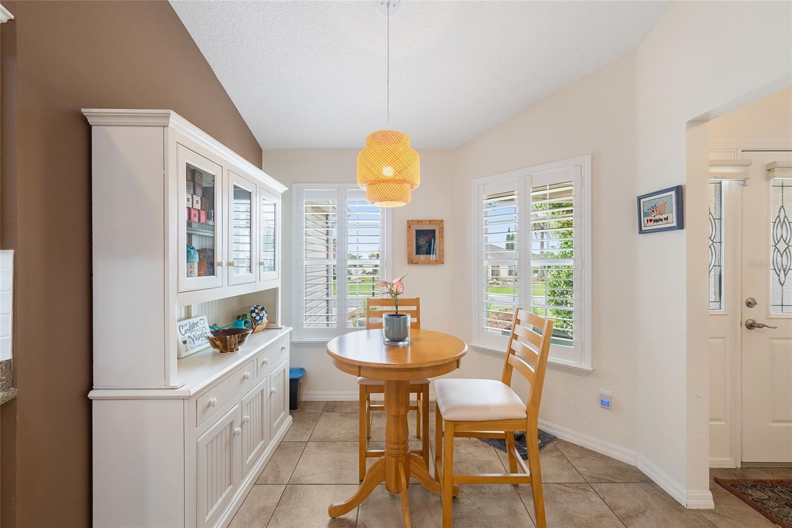 Welcome home to this beautiful Camellia 3/2 Designer home, located in the Village of St. Charles. The driveway and walkway have been painted for great curb appeal. As you enter this home, you will notice the luxury vinyl planking throughout and ceramic tile in the kitchen and wet areas. The kitchen has newer stainless steel appliances, granite countertops, a beautiful white subway tile backsplash and stacked white cabinets, some with glass inserts. There are pull outs in the pantry and all cabinets. The drawers are soft closed and there are pot drawers. There is a breakfast bar where you can enjoy your morning coffee. The barstools will stay with the home. As you look into the living room, the seller is including all TV's and the entertainment stand. Sliders open to the enclosed lanai which is heated and air conditioned. There is a wall behind for additional privacy. There is an inside laundry off the kitchen with Maytag washer and dryer and a utility sink. The primary bedroom has a tray ceiling, dual walk-in closets all custom designed. The primary bathroom has dual sinks and a roman shower. The counters are laminate. The front bedroom has LVP flooring, built-in shelving and a built-in desk, there is no closet in this room. The guest bedroom has a custom designed closet and LVP flooring. The guest bathroom has a tub and shower combination and laminate counters. There is also a pocket door to the guest rooms to create added privacy. The 2 car garage has pull down stairs for storage, a solar fan, water filtration system and extra cabinets for storage. It is an all electric home and there are new ceiling fans in every room. The interior of the home has been recently painted and there is knockdown ceilings, so no popcorn ceilings! Roof 2025, HVAC 2021 and Water Heater is 2021. Taxes $3,547.42, Maint $604.00, Fire $320.71, Annual Bond Payment $1,344.72 and Bond Balance $11,554.96.