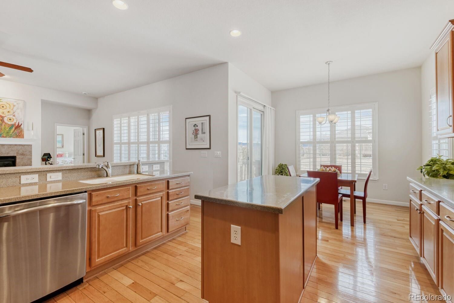 Mountain views, a quiet street, and a large lot create the perfect setting for this private backyard retreat. This Mountain-elevation Breckenridge model offers more than 1,800 square feet of beautifully finished, stair-free living designed for comfort and convenience. Light and bright throughout, the home features gleaming extended hardwood floors, a welcoming storm door with screen, upgraded lighting, plantation shutters, and a cozy gas fireplace that creates an inviting central gathering space. A ceiling fan adds everyday comfort. The thoughtful layout includes a private front office with a glass door, ideal for working from home, along with an eat-in kitchen and separate formal dining room perfect for entertaining. The spacious kitchen offers stainless steel appliances, honey maple cabinetry with decorative hardware and rollout drawers, a convenient buffet area, and a center island providing additional prep and seating space. A patio door opens to a covered deck where you can relax and take in peaceful mountain views while overlooking the large backyard. The primary suite serves as a tranquil retreat with a coffered ceiling, bay window, direct deck access, and scenic views. The luxurious five-piece bath features a soaking tub with tile surround, dual vanities, and a separate shower. A secondary full bath includes a tub and shower combination with a custom glass door. Outdoor living is enhanced by an extended composite covered deck with ceiling fan, ideal for year-round enjoyment. Additional highlights include a laundry room with washer and dryer included, utility sink, and extra cabinetry for storage. Located near a 30,000-square-foot recreation center with indoor and outdoor pools, fitness facilities, pickleball, tennis, bocce, and more than 130 clubs. Residents also enjoy access to over 48 miles of scenic walking and biking trails.