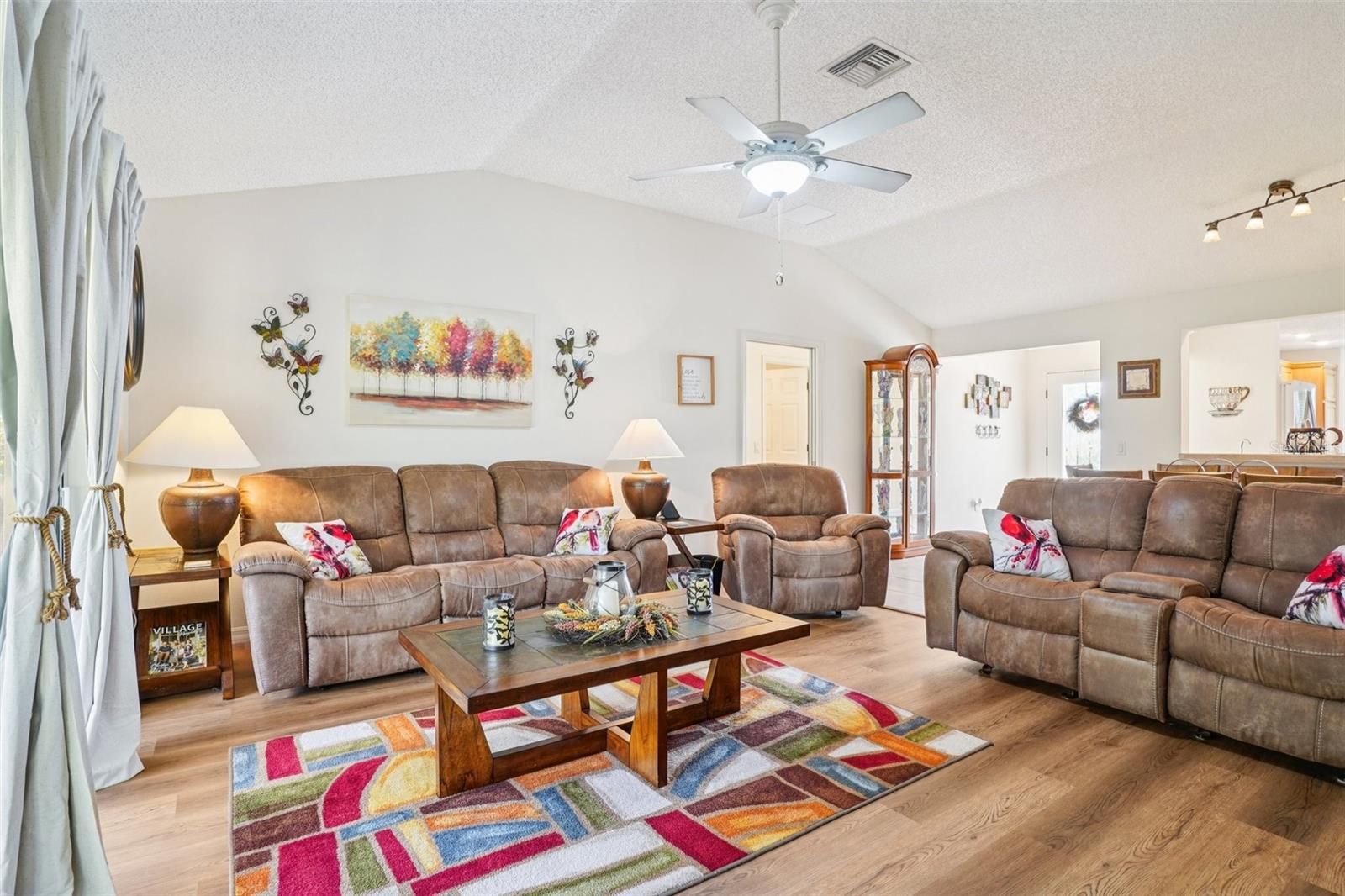 - Cathedral Ceiling(s), Ceiling Fan(s), Eat-in Kitchen, Living/Dining Room, Main Level Primary, Thermostat, Window Treatments
