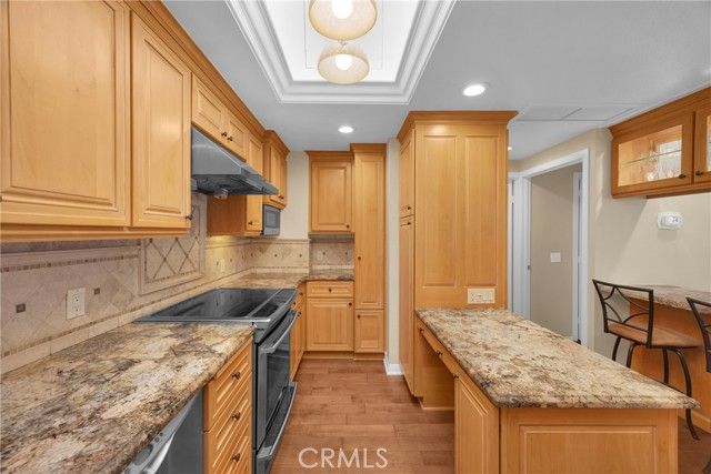 Make this beautifully remodeled corner unit your home! This Leisure World unit has been completely updated with all high end amenities! Located in the Beverly Hills of Leisure World, the highly sought after Mutual 14 near the golf course and across the street from the Golden Rain offices/medical building and amphitheater! Come in through the beautiful entry door with sidelight into the large open living area enhanced with double pane picture windows with white shutters throughout the home. Engineered hardwood floors cover the living, dining and kitchen areas and new carpet in the bedrooms. Central A/C and heat. Make your way through the dining area into the gorgeous updated kitchen. The kitchen is equipped with custom granite counter tops, under cabinet lighting and microwave, double Fisher Paykel dishwasher drawers, Fisher Paykel refrigerator, Electrolux stove/oven and all high end custom Crystal Cabinetry with many special designs and storage features. These include lighted overhead glassware cabinet, pullout waste /recycle cabinet, floor to ceiling pantry with rollout shelves, filtered insta/hot water dispenser and terrific storage space throughout. There is ample counter space for food prep including a peninsula which doubles as an office desk. Also a counter height breakfast bar that doubles as a buffet with extra storage for the dining area. The well sized master bedroom has a huge walk/in closet with storage space above the entrance and double shelving all around with multiple shelf shoe cubbies. Master bath has been completely remodeled as well with granite counter, custom cabinetry with rollout shelves and laundry bin, built in stack laundry and a custom shower with beautiful travertine and mosaic accents, built in shower seat and grab bars. Guest bedroom has a large mirrored closet and it's own 1/2 bath with custom cabinetry and granite counter as well. Entryway has an extra large walk-in closet and the home also comes with 2 skylights (kitchen and master bath).