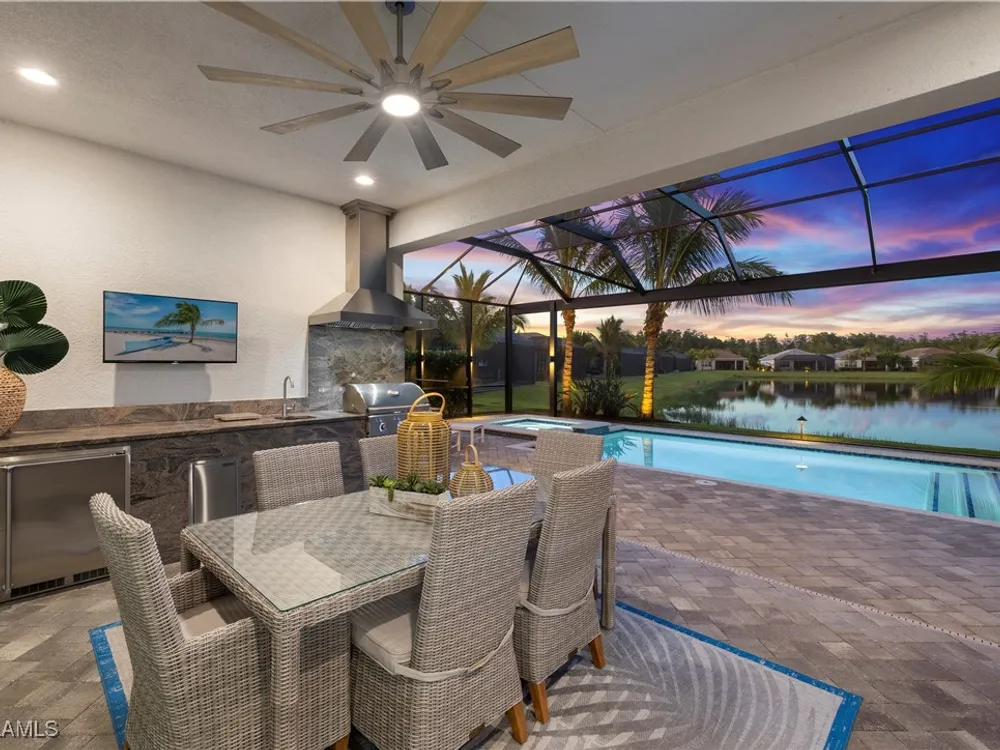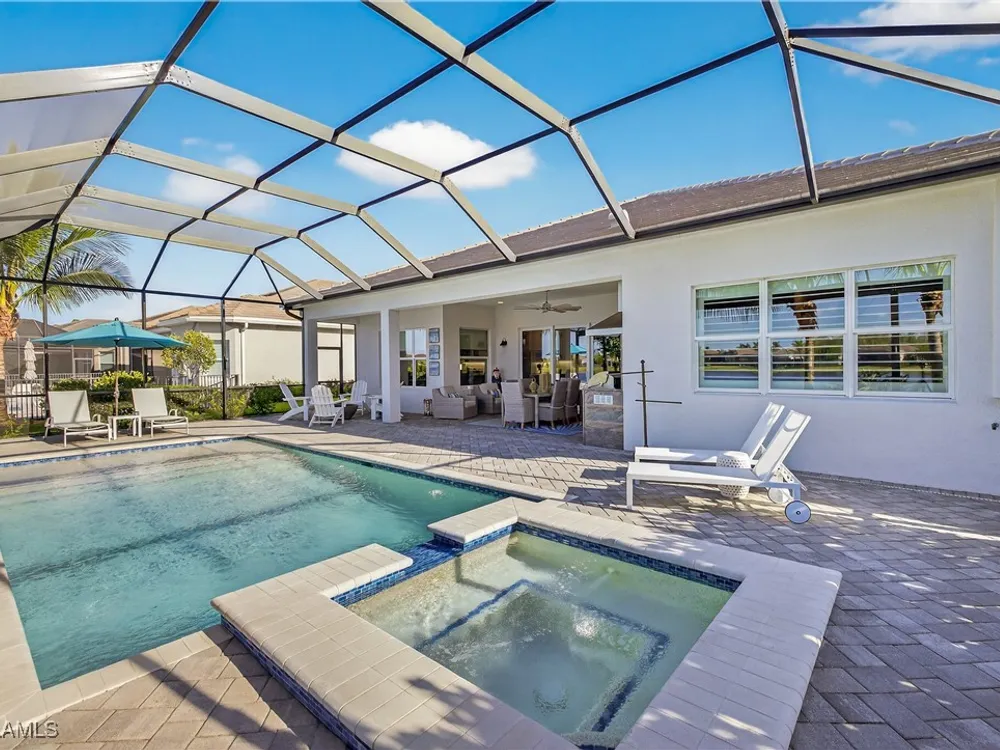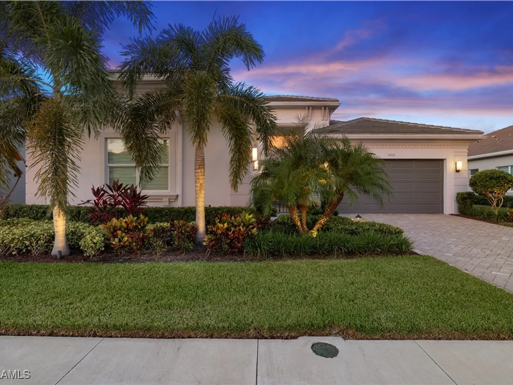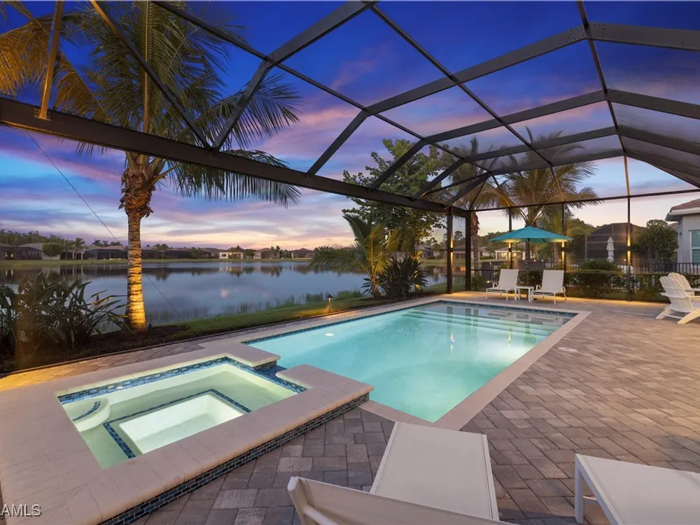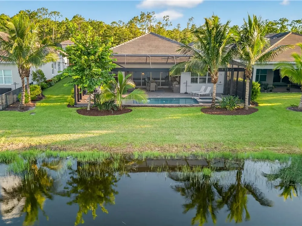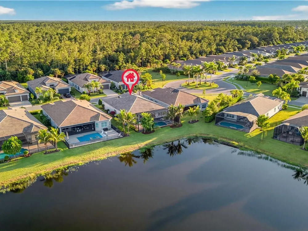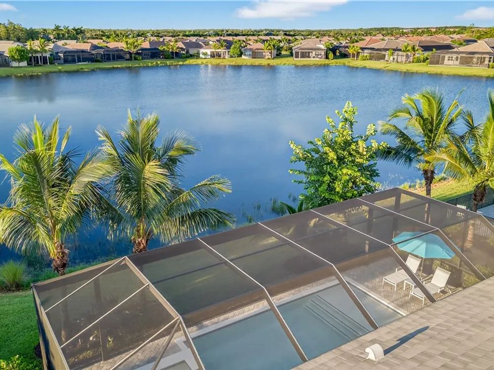 Welcome to your slice of paradise in Valencia Bonita, where luxury and lifestyle meet. This exquisite 2022-built home showcases a harmonious blend of sophistication and comfort, complete with a 3-car garage and a welcoming courtyard entry surrounded by lush tropical landscaping with upgraded nightscape custom lighting. Step inside and be greeted by beautiful white oak engineered wood flooring, designer chandeliers, and a spacious open layout. The chef’s kitchen is a masterpiece, showcasing professional Viking appliances, a gas range, wine cooler, quartz counters, and an oversized island with a striking custom backsplash. Abundant pantry-style cabinetry flows seamlessly into the bright breakfast nook, creating the perfect space for both everyday living and inspired culinary entertaining. The home offers 2 bedrooms plus an oversized den with additional private French door entry, and 2.5 baths, highlighted by a serene primary suite with two walk-in closets, soaking tub, and expansive vanity mirrors. Seamlessly transition to outdoor living on the extended lanai, where a heated saltwater pool, spa, outdoor kitchen, and full nightscape lighting create the ultimate backdrop for entertaining. Storm screens provide peace of mind, in addition to a full home outdoor natural gas generator, while the tranquil, expansive lake views enhance the sense of retreat. As part of the 55+ Valencia Bonita lifestyle, residents enjoy a state-of-the-art clubhouse with dining, fitness, resort pools, pickleball, tennis, bocce, a spa, and endless social opportunities. This move-in-ready home is being sold with almost all furnishings negotiable. This home is not just a residence—it’s a resort experience every day.