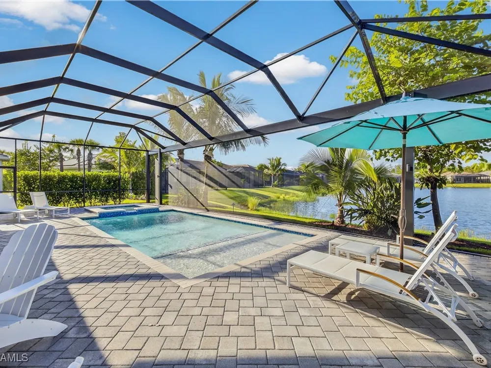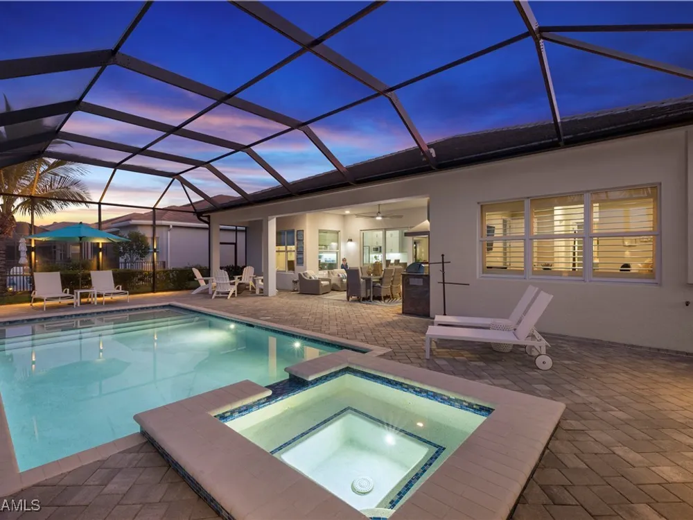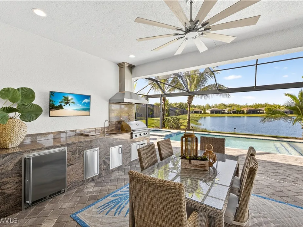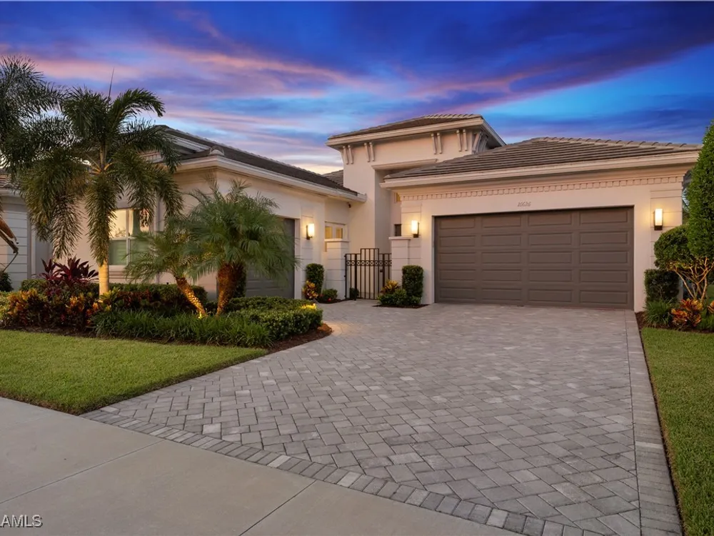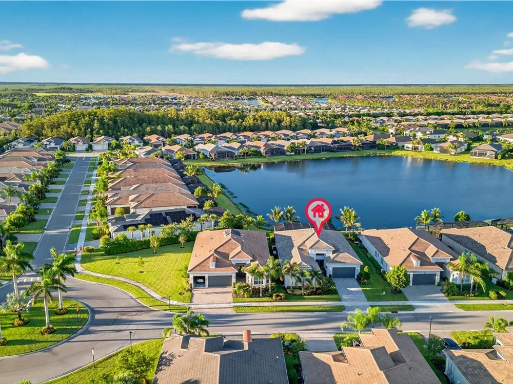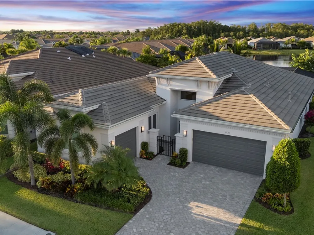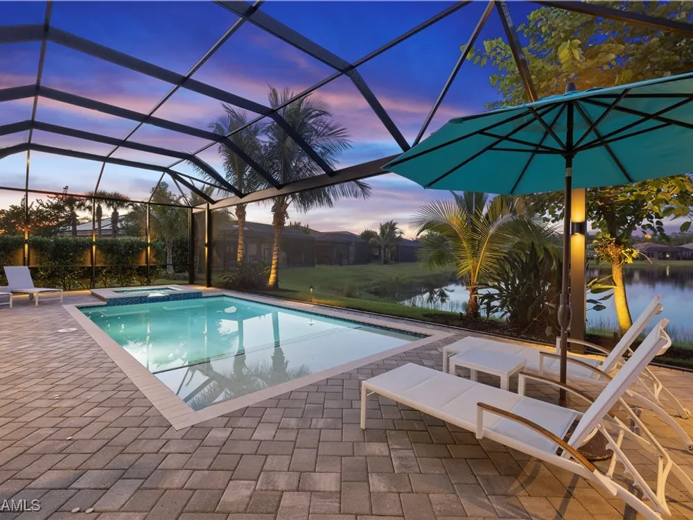 Welcome to your slice of paradise in Valencia Bonita, where luxury and lifestyle meet. This exquisite 2022-built home showcases a harmonious blend of sophistication and comfort, complete with a 3-car garage and a welcoming courtyard entry surrounded by lush tropical landscaping with upgraded nightscape custom lighting. Step inside and be greeted by beautiful white oak engineered wood flooring, designer chandeliers, and a spacious open layout. The chef’s kitchen is a masterpiece, showcasing professional Viking appliances, a gas range, wine cooler, quartz counters, and an oversized island with a striking custom backsplash. Abundant pantry-style cabinetry flows seamlessly into the bright breakfast nook, creating the perfect space for both everyday living and inspired culinary entertaining. The home offers 2 bedrooms plus an oversized den with additional private French door entry, and 2.5 baths, highlighted by a serene primary suite with two walk-in closets, soaking tub, and expansive vanity mirrors. Seamlessly transition to outdoor living on the extended lanai, where a heated saltwater pool, spa, outdoor kitchen, and full nightscape lighting create the ultimate backdrop for entertaining. Storm screens provide peace of mind, in addition to a full home outdoor natural gas generator, while the tranquil, expansive lake views enhance the sense of retreat. As part of the 55+ Valencia Bonita lifestyle, residents enjoy a state-of-the-art clubhouse with dining, fitness, resort pools, pickleball, tennis, bocce, a spa, and endless social opportunities. This move-in-ready home is being sold with almost all furnishings negotiable. This home is not just a residence—it’s a resort experience every day.