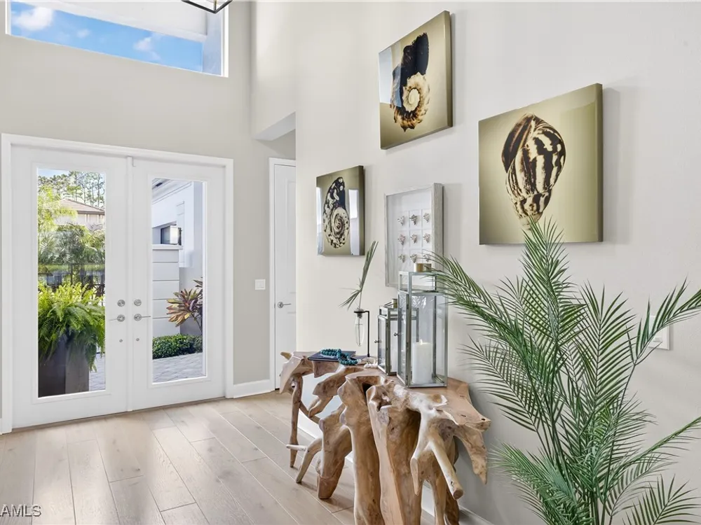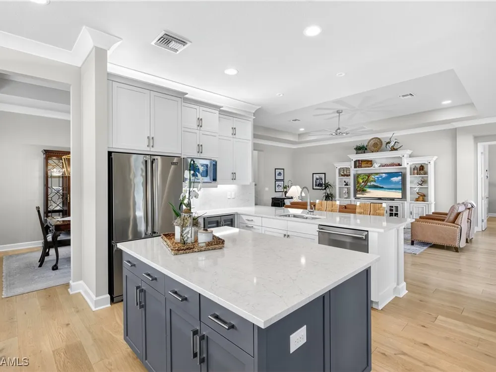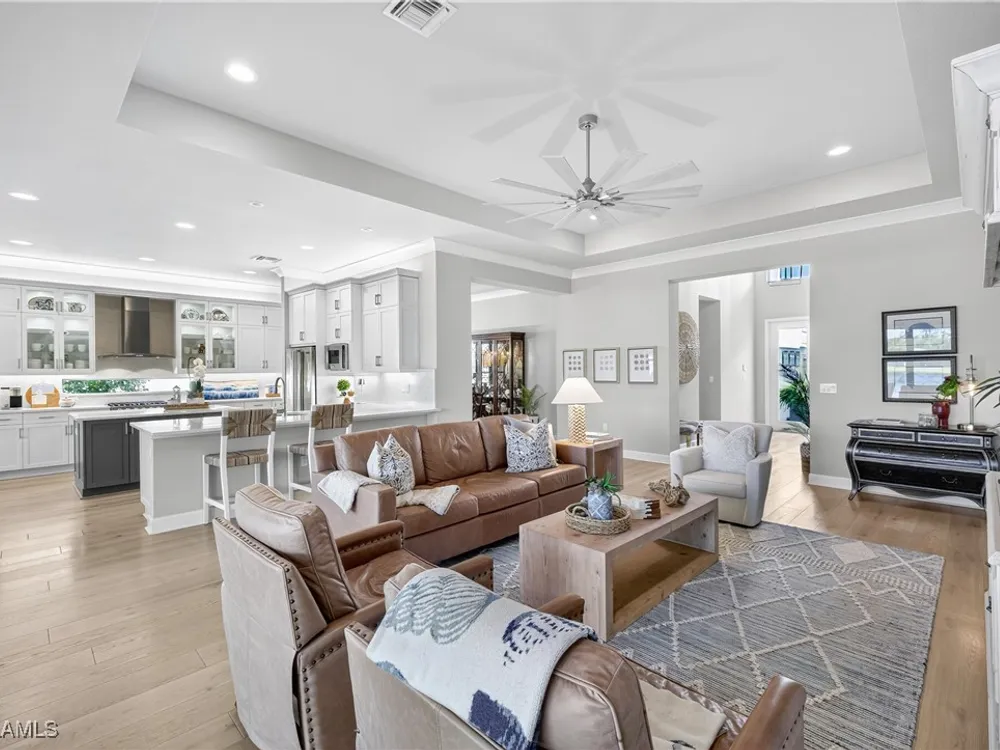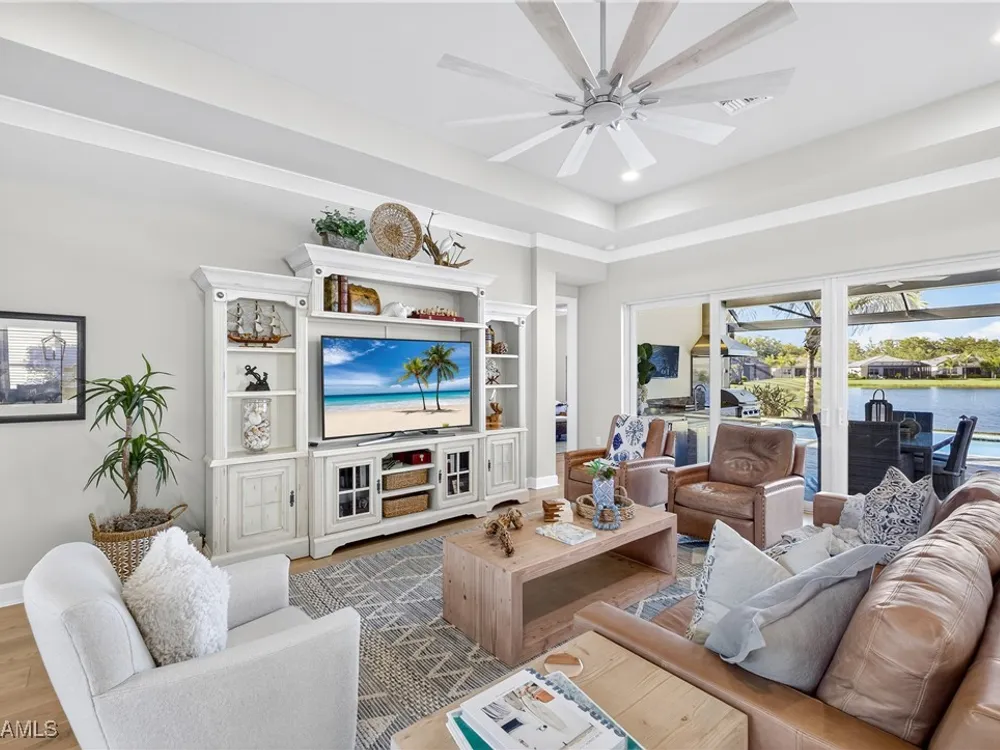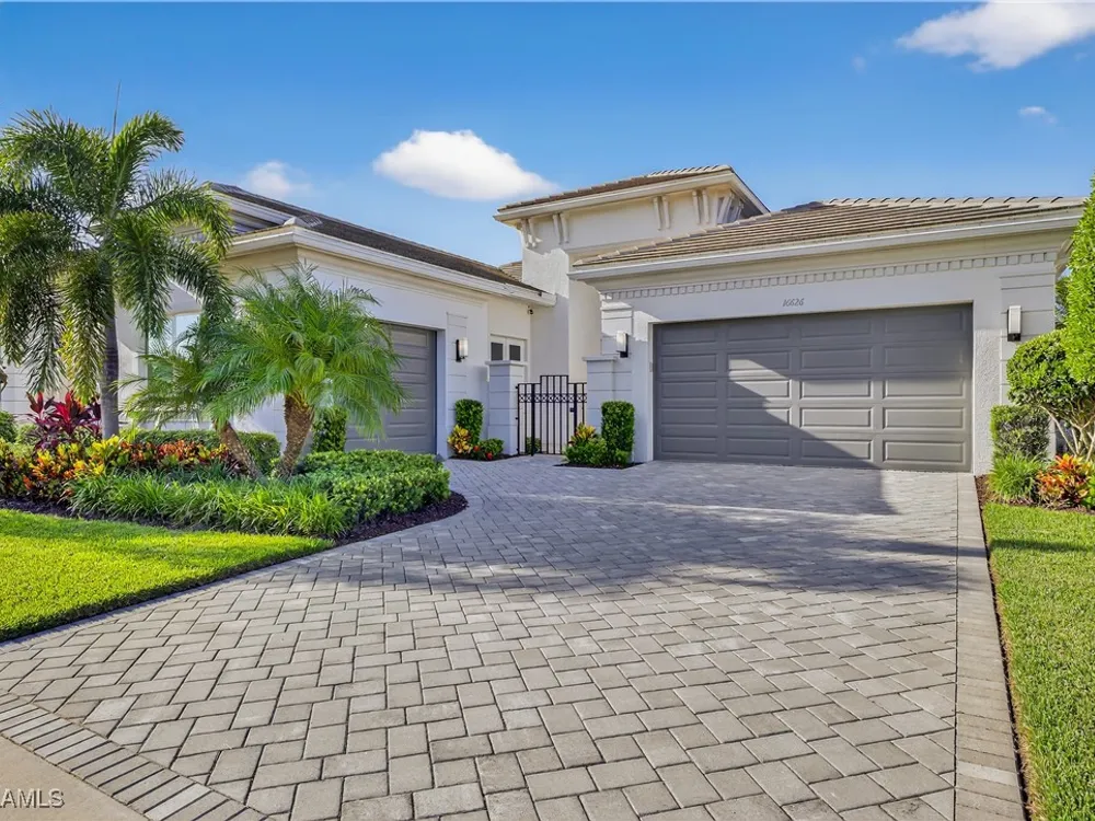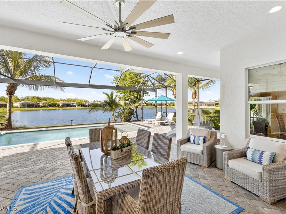 Welcome to your slice of paradise in Valencia Bonita, where luxury and lifestyle meet. This exquisite 2022-built home showcases a harmonious blend of sophistication and comfort, complete with a 3-car garage and a welcoming courtyard entry surrounded by lush tropical landscaping with upgraded nightscape custom lighting. Step inside and be greeted by beautiful white oak engineered wood flooring, designer chandeliers, and a spacious open layout. The chef’s kitchen is a masterpiece, showcasing professional Viking appliances, a gas range, wine cooler, quartz counters, and an oversized island with a striking custom backsplash. Abundant pantry-style cabinetry flows seamlessly into the bright breakfast nook, creating the perfect space for both everyday living and inspired culinary entertaining. The home offers 2 bedrooms plus an oversized den with additional private French door entry, and 2.5 baths, highlighted by a serene primary suite with two walk-in closets, soaking tub, and expansive vanity mirrors. Seamlessly transition to outdoor living on the extended lanai, where a heated saltwater pool, spa, outdoor kitchen, and full nightscape lighting create the ultimate backdrop for entertaining. Storm screens provide peace of mind, in addition to a full home outdoor natural gas generator, while the tranquil, expansive lake views enhance the sense of retreat. As part of the 55+ Valencia Bonita lifestyle, residents enjoy a state-of-the-art clubhouse with dining, fitness, resort pools, pickleball, tennis, bocce, a spa, and endless social opportunities. This move-in-ready home is being sold with almost all furnishings negotiable. This home is not just a residence—it’s a resort experience every day.