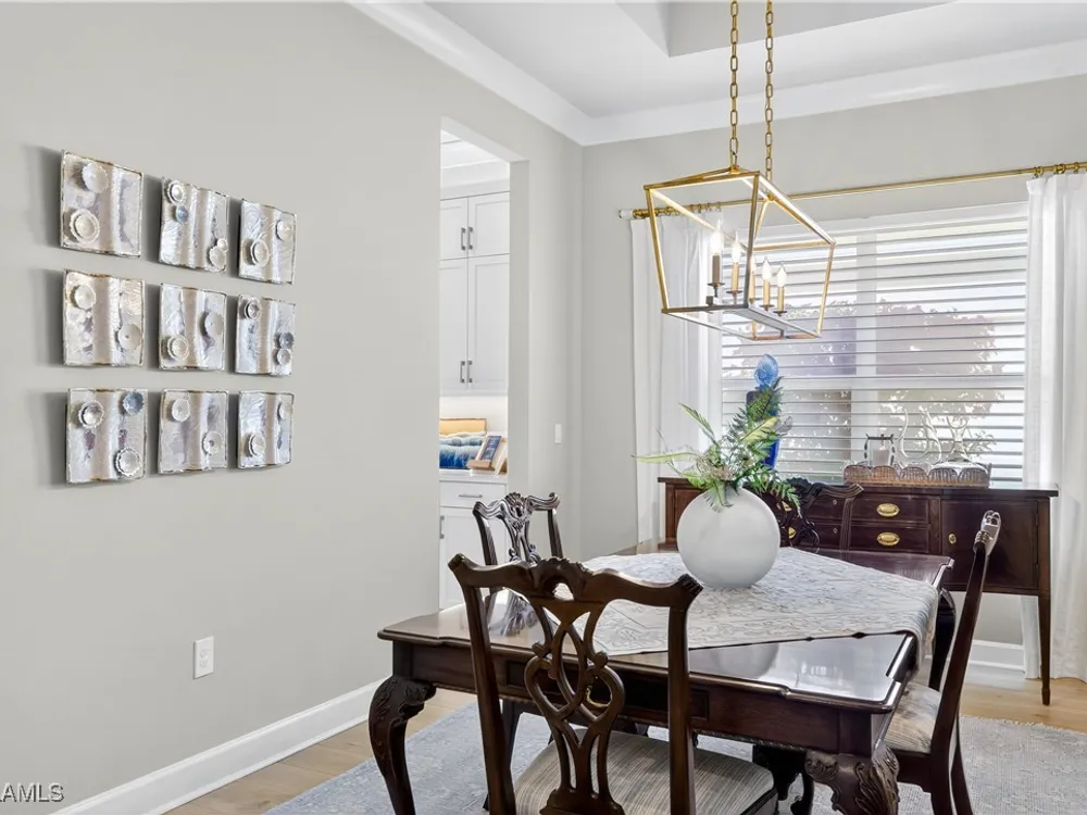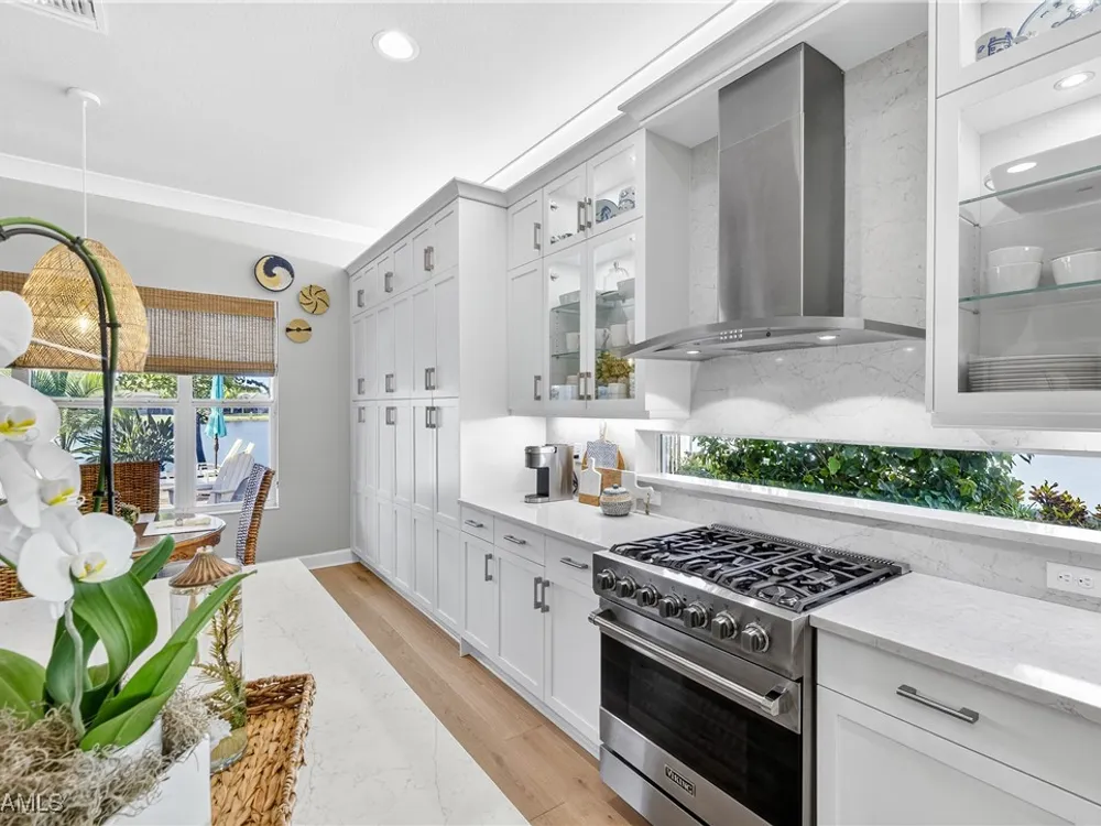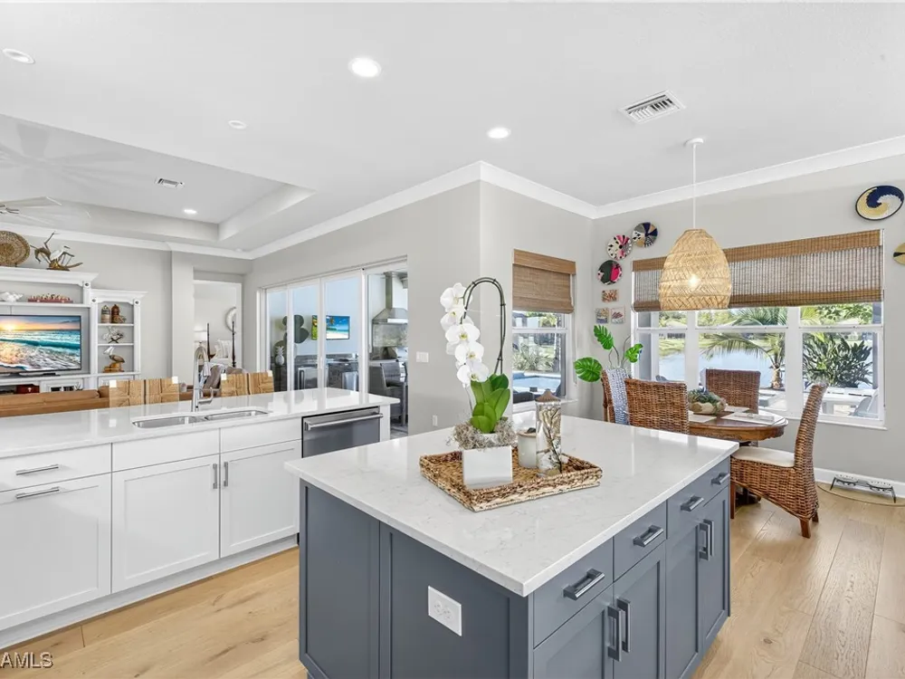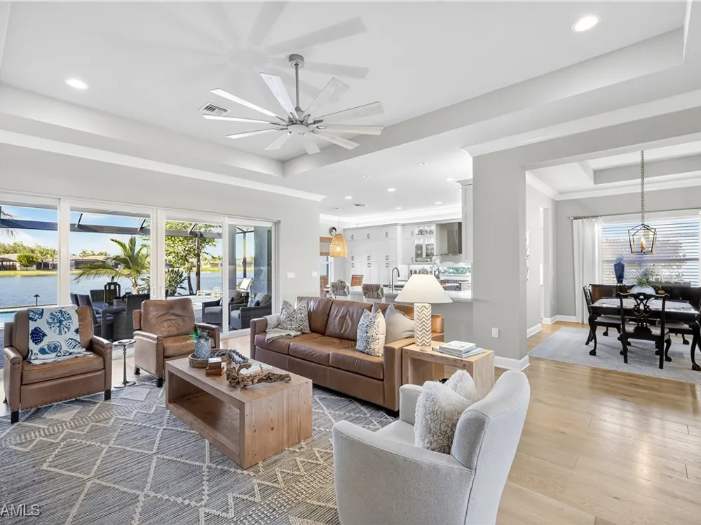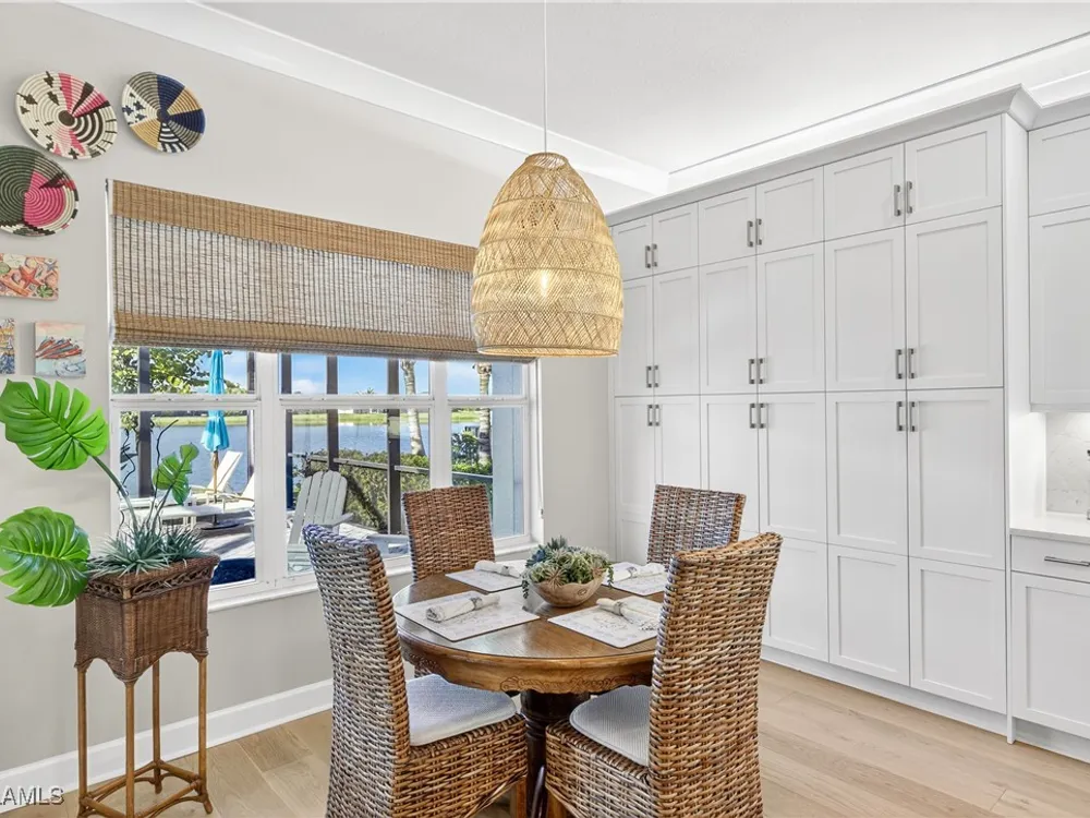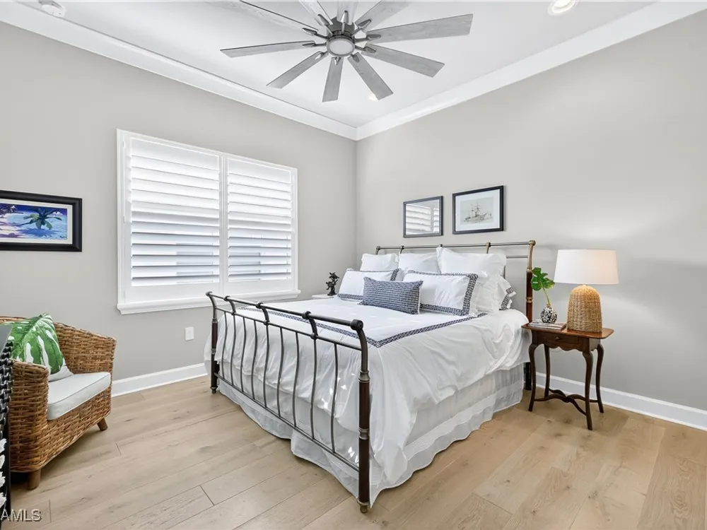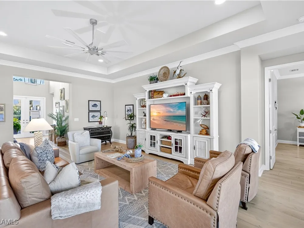 Welcome to your slice of paradise in Valencia Bonita, where luxury and lifestyle meet. This exquisite 2022-built home showcases a harmonious blend of sophistication and comfort, complete with a 3-car garage and a welcoming courtyard entry surrounded by lush tropical landscaping with upgraded nightscape custom lighting. Step inside and be greeted by beautiful white oak engineered wood flooring, designer chandeliers, and a spacious open layout. The chef’s kitchen is a masterpiece, showcasing professional Viking appliances, a gas range, wine cooler, quartz counters, and an oversized island with a striking custom backsplash. Abundant pantry-style cabinetry flows seamlessly into the bright breakfast nook, creating the perfect space for both everyday living and inspired culinary entertaining. The home offers 2 bedrooms plus an oversized den with additional private French door entry, and 2.5 baths, highlighted by a serene primary suite with two walk-in closets, soaking tub, and expansive vanity mirrors. Seamlessly transition to outdoor living on the extended lanai, where a heated saltwater pool, spa, outdoor kitchen, and full nightscape lighting create the ultimate backdrop for entertaining. Storm screens provide peace of mind, in addition to a full home outdoor natural gas generator, while the tranquil, expansive lake views enhance the sense of retreat. As part of the 55+ Valencia Bonita lifestyle, residents enjoy a state-of-the-art clubhouse with dining, fitness, resort pools, pickleball, tennis, bocce, a spa, and endless social opportunities. This move-in-ready home is being sold with almost all furnishings negotiable. This home is not just a residence—it’s a resort experience every day.