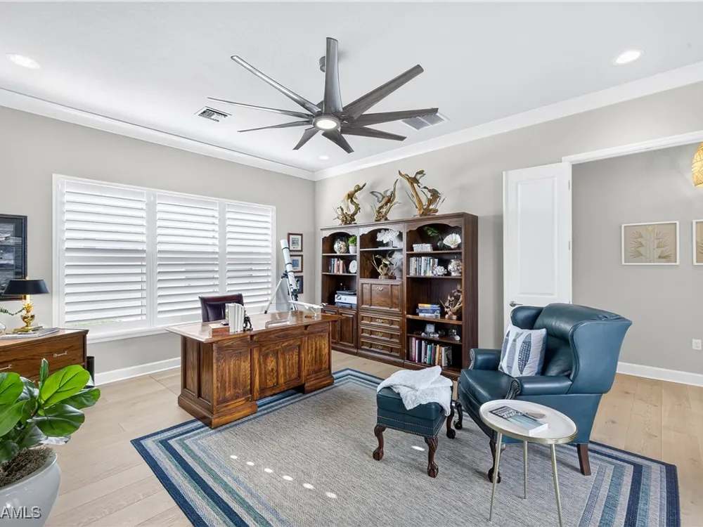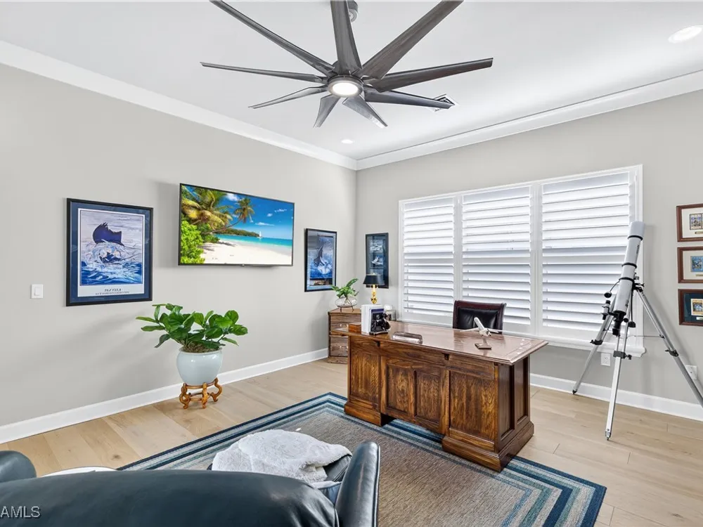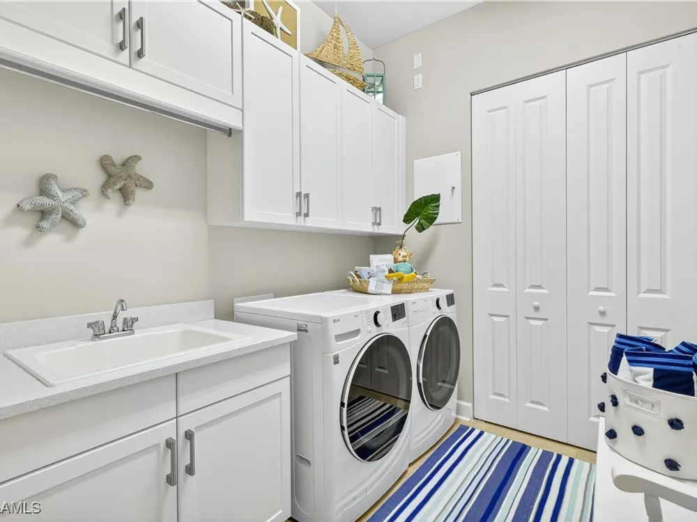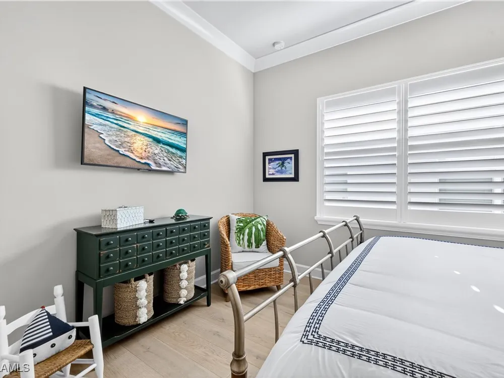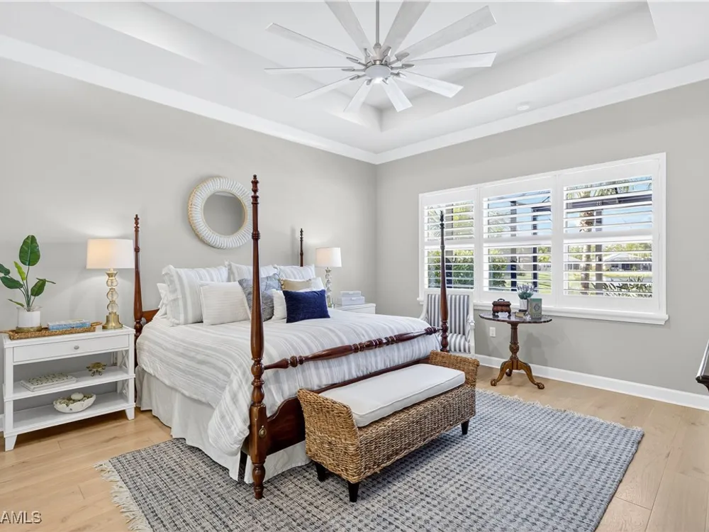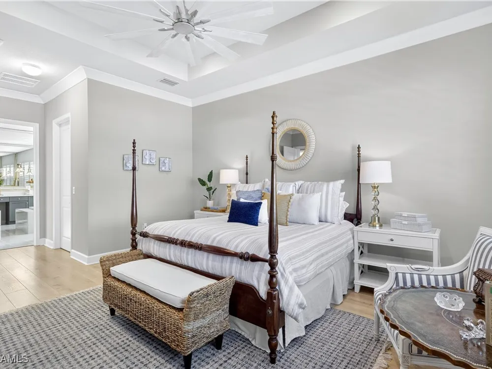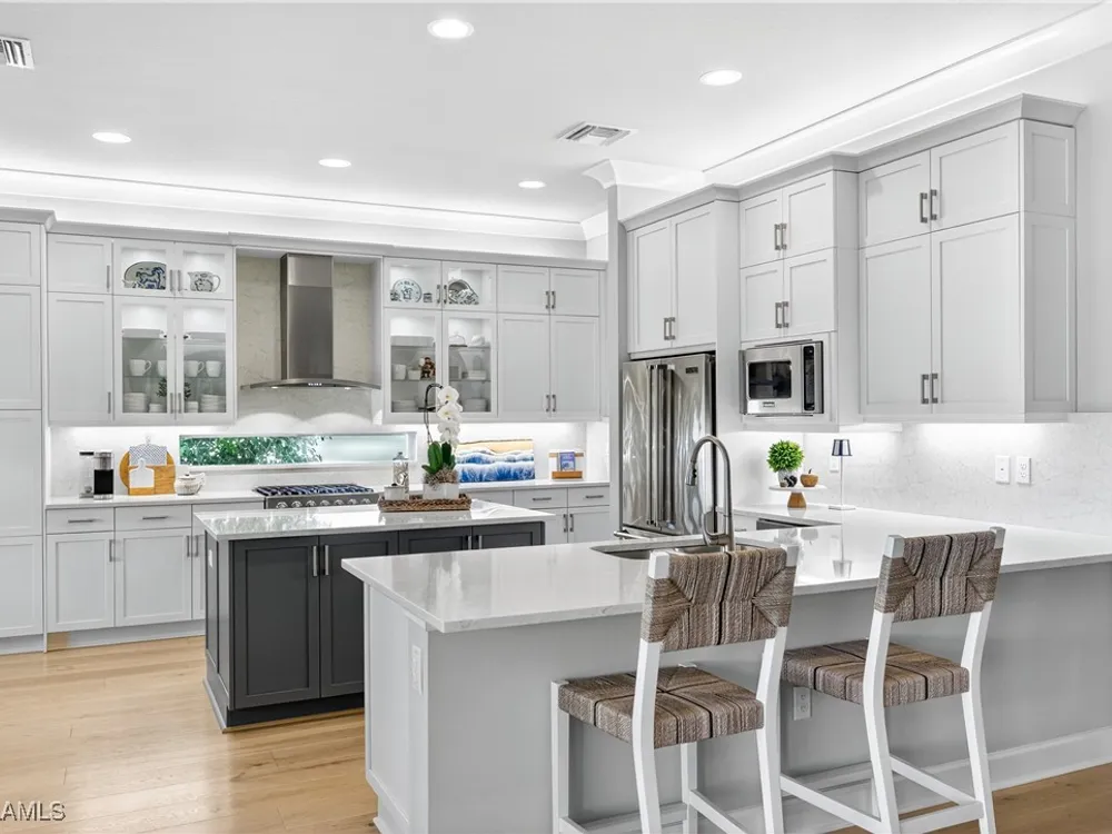 Welcome to your slice of paradise in Valencia Bonita, where luxury and lifestyle meet. This exquisite 2022-built home showcases a harmonious blend of sophistication and comfort, complete with a 3-car garage and a welcoming courtyard entry surrounded by lush tropical landscaping with upgraded nightscape custom lighting. Step inside and be greeted by beautiful white oak engineered wood flooring, designer chandeliers, and a spacious open layout. The chef’s kitchen is a masterpiece, showcasing professional Viking appliances, a gas range, wine cooler, quartz counters, and an oversized island with a striking custom backsplash. Abundant pantry-style cabinetry flows seamlessly into the bright breakfast nook, creating the perfect space for both everyday living and inspired culinary entertaining. The home offers 2 bedrooms plus an oversized den with additional private French door entry, and 2.5 baths, highlighted by a serene primary suite with two walk-in closets, soaking tub, and expansive vanity mirrors. Seamlessly transition to outdoor living on the extended lanai, where a heated saltwater pool, spa, outdoor kitchen, and full nightscape lighting create the ultimate backdrop for entertaining. Storm screens provide peace of mind, in addition to a full home outdoor natural gas generator, while the tranquil, expansive lake views enhance the sense of retreat. As part of the 55+ Valencia Bonita lifestyle, residents enjoy a state-of-the-art clubhouse with dining, fitness, resort pools, pickleball, tennis, bocce, a spa, and endless social opportunities. This move-in-ready home is being sold with almost all furnishings negotiable. This home is not just a residence—it’s a resort experience every day.