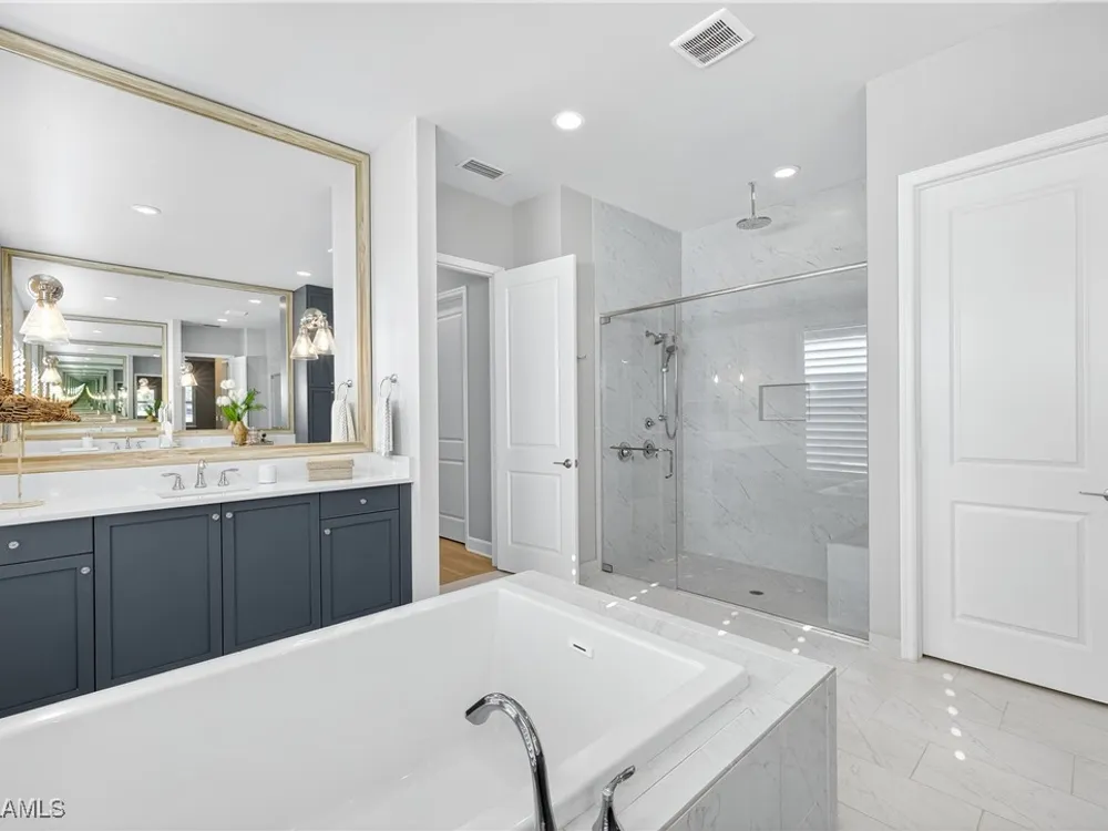 - Breakfast Bar, Built-in Features, Bathtub, Coffered Ceiling(s), Entrance Foyer, Eat-in Kitchen, French Door(s)/Atrium Door(s), Kitchen Island, Living/Dining Room, Multiple Shower Heads, Custom Mirrors, Pantry, Separate Shower, Cable TV, Walk-In Closet(s), Window Treatments, High Speed Internet, Split Bedrooms
