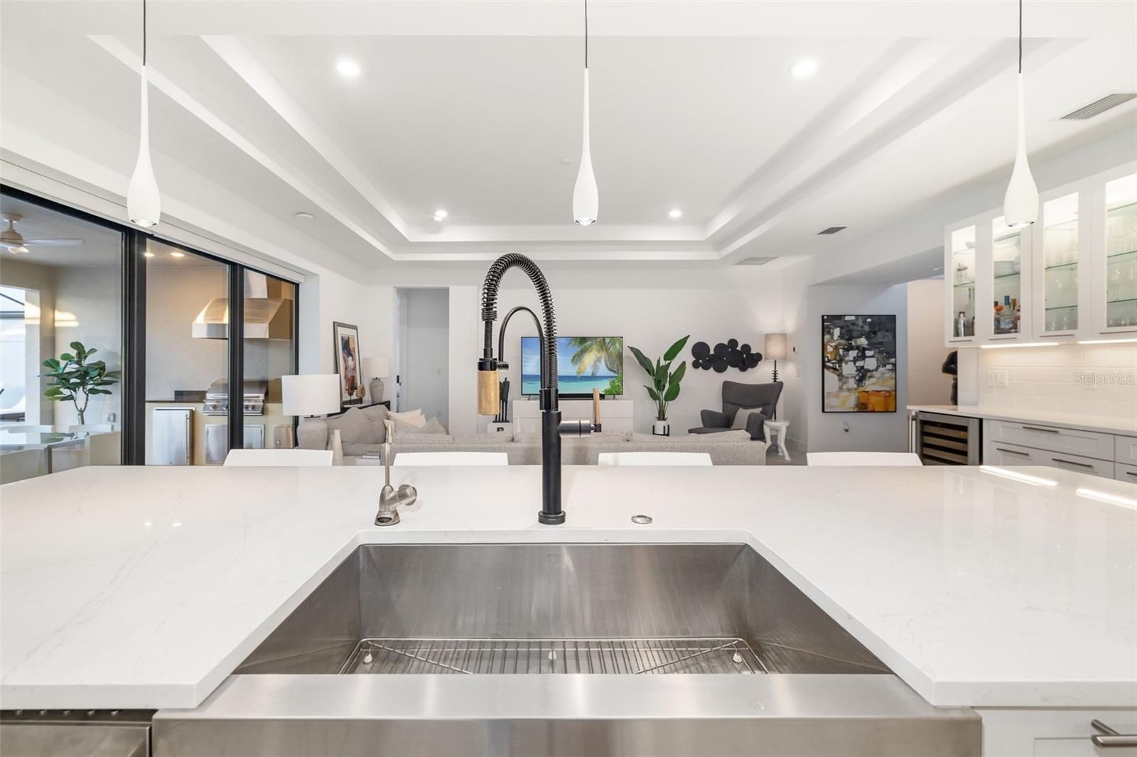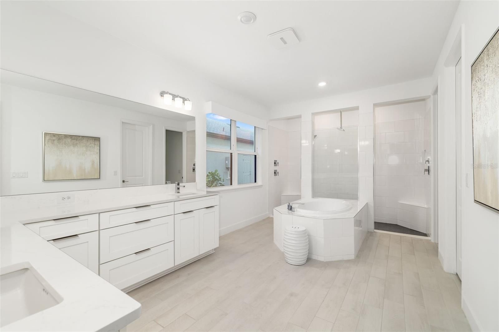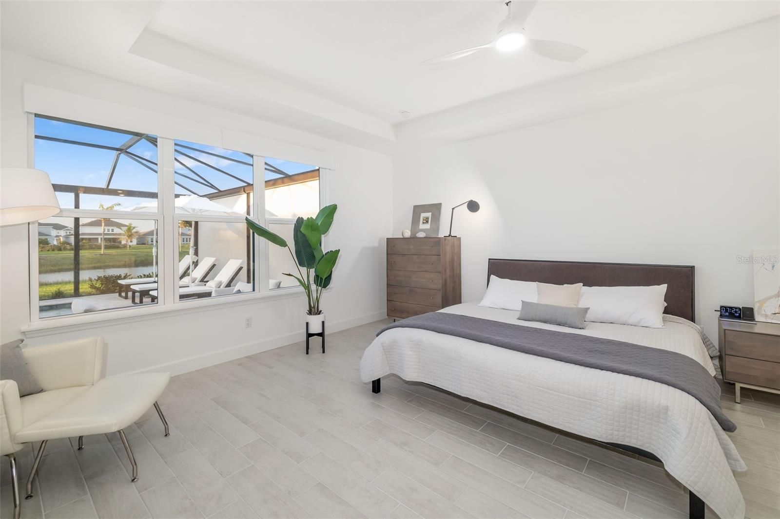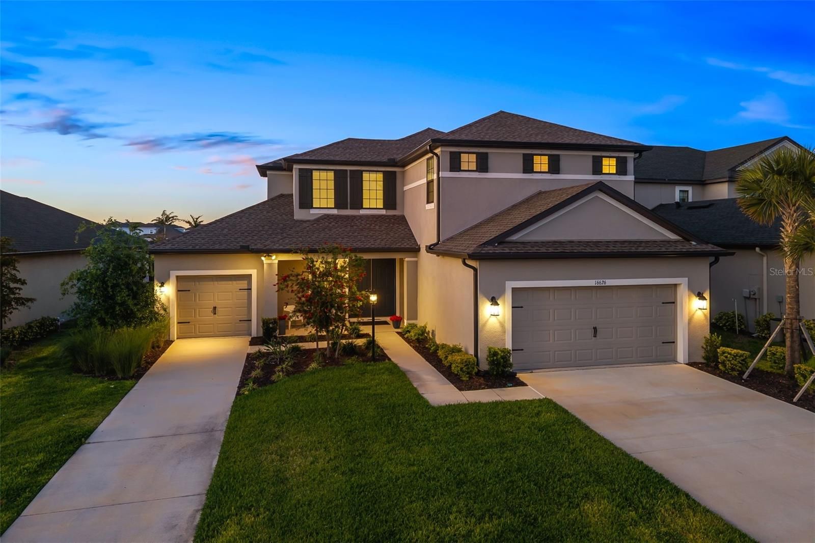 WOW is the WORD to describe this Modern Luxury Home where an AMAZING design meets Resort-Style Living! Welcome to 16626 Paynes Mill Drive, a rarely available TORTOLA MODEL in Park East at Azario, Lakewood Ranch. This stunning 5-bedroom, 4.5-bath home offers 3,461 sq. ft. of thoughtfully designed living space, including a BONUS ROOM, 3-car garage, and versatile flex areas to fit your lifestyle. Perfectly situated on a premium LAKEFRONT homesite, you'll enjoy tranquil water views and breathtaking sunsets daily. In this home you'll be prepared for any storm with the security of knowing you have BACKUP POWER with a built-in GENERAC Generator System and a upgraded gutter system to push the water away. The extended lanai SETS THE TONE for resort-style outdoor living, featuring upgraded travertine flooring, a spacious SALTWATER POOL with HOT TUB and LED lighting, 4 large electric roll-down shades for privacy and ambiance, and a built-in vented gourmet gas grill—ideal for entertaining or relaxing in your own PRIVATE OASIS. Inside, the large GOURMET KITCHEN impresses with 42” soft-close cabinetry, high-end MONOGRAM appliances, upgraded quartz countertops, subway tile backsplash, gas cooktop with stainless hood, built-in wall oven and microwave, a walk-in pantry, and designer pendant lighting over a LARGE CENTER ISLAND. The gathering room features a beautiful DOUBLE TRAY ceiling, expansive WINE WET BAR for entertaining, upgraded POCKET CORNER SLIDERS, and PANORAMIC lake views through your CLEARVIEW SCREEN. The first-floor primary suite offers serene lake views and a spa-inspired bath with dual vanities, soaking tub, and dual rain shower heads, plus oversized walk-in closets. An additional en-suite bedroom is also located downstairs. Upstairs, discover three more spacious bedrooms (one with an en suite), a shared full bath, and a bonus/game room featuring a second WINE WET BAR with lake views (currently used as a theater room). Live where luxury meets lifestyle—lush landscaping, pristine lakes, and the natural beauty of Lakewood Ranch surround you. This home is a true standout—schedule your private showing today!