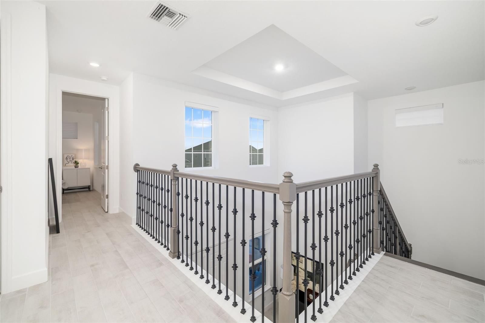 - High Ceilings, Open Floorplan, Main Level Primary, Solid Surface Counters, Solid-Wood Cabinets, Split Bedrooms, Tray Ceiling(s), Walk-In Closet(s), Window Treatments