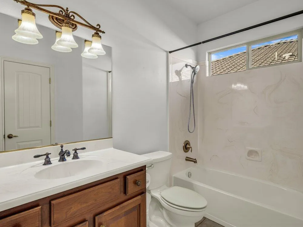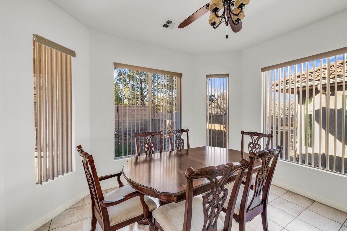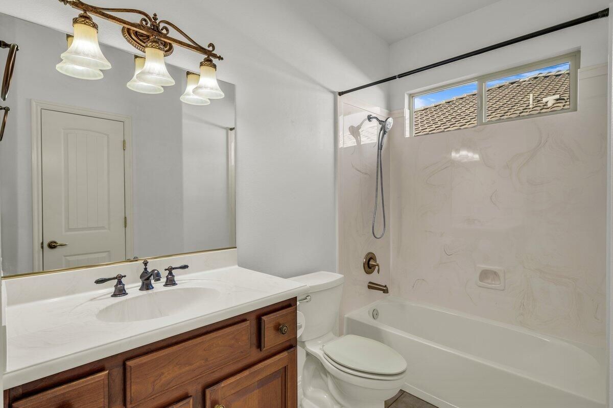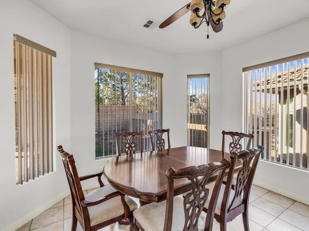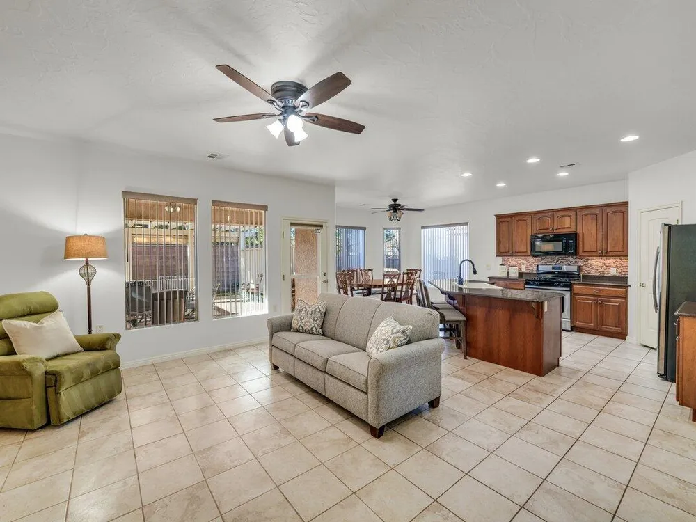 Charming home in Sun River active community. This home is carpet free, Also has granite counter top, with a complimentary backsplash. Large Primary Bedroom, Den is large enough to be a 3rd bedroom or seating area. Oversize garage with a mini split for air temperature controlled comfort. Workbench and lots of storage. back Patio has a Large cover so you can enjoy the backyard. Easy care. Do Not Miss Out on this one. Furniture could be available to purchase.