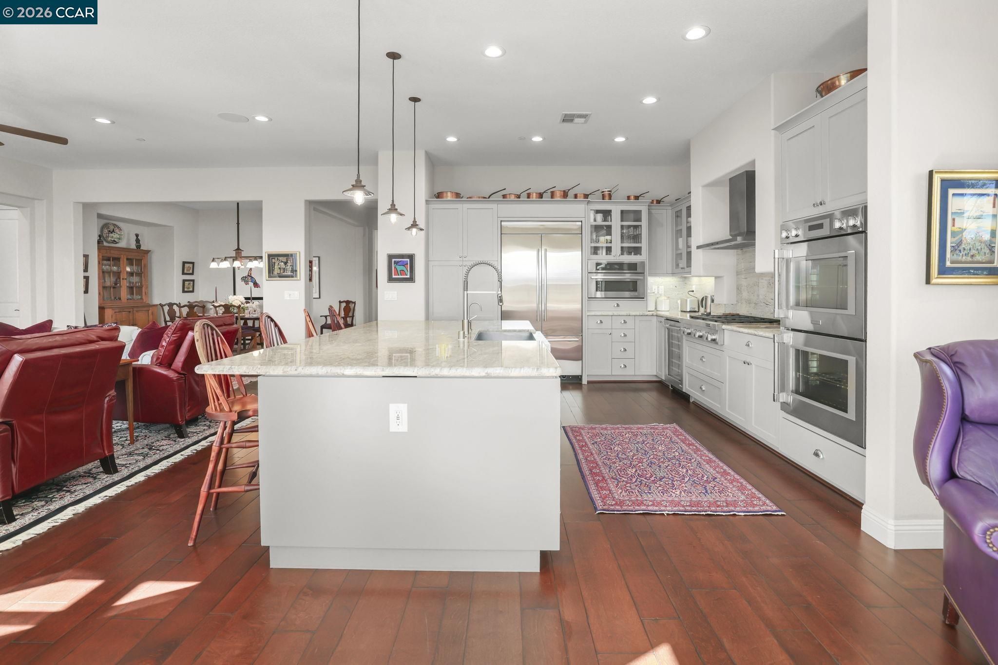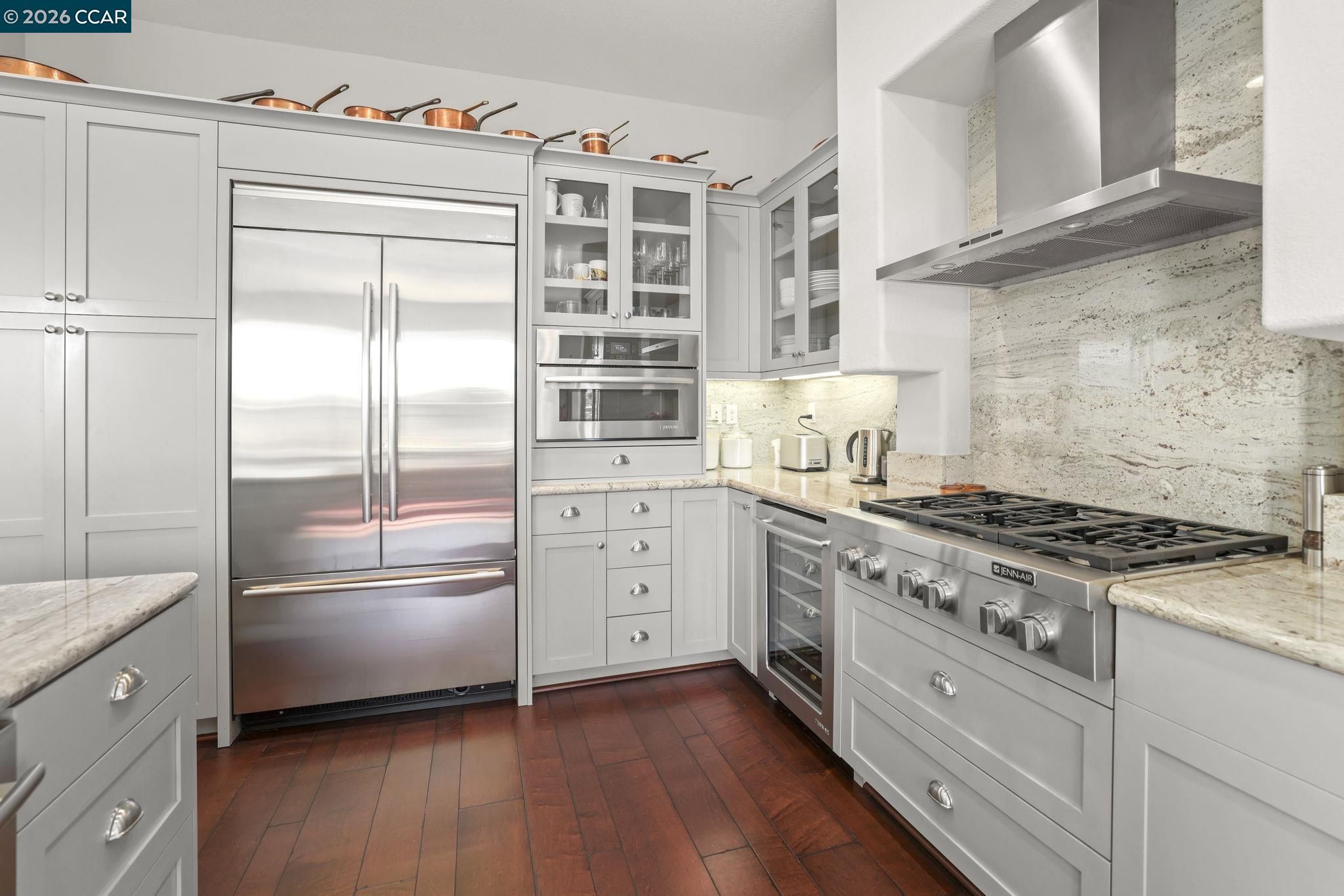 - Dishwasher, Double Oven, Gas Range, Plumbed For Ice Maker, Microwave, Refrigerator, Trash Compactor, Water Filter, Tankless Water Heater