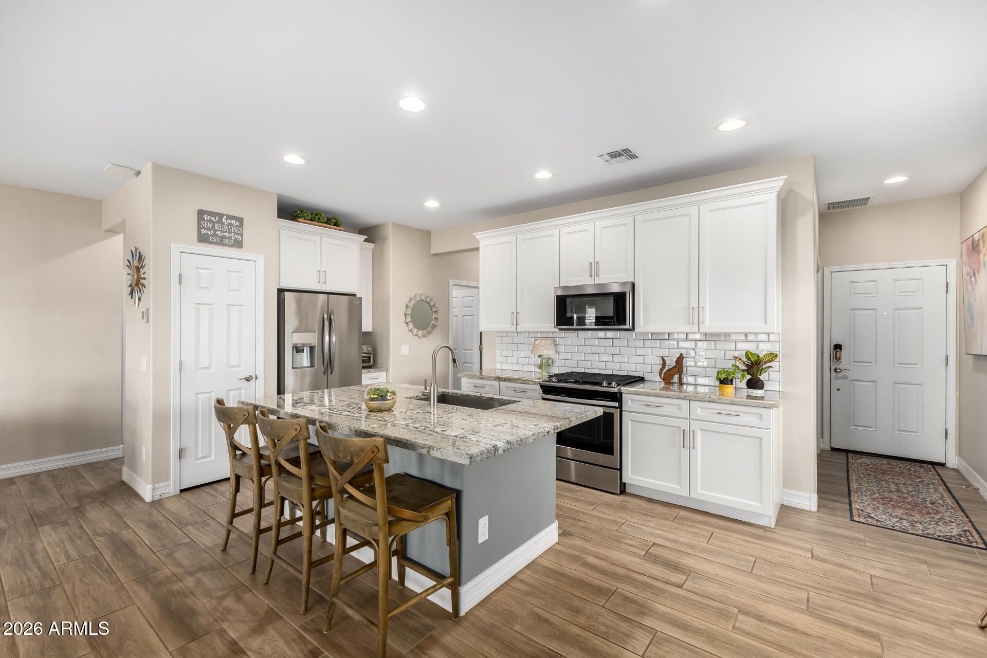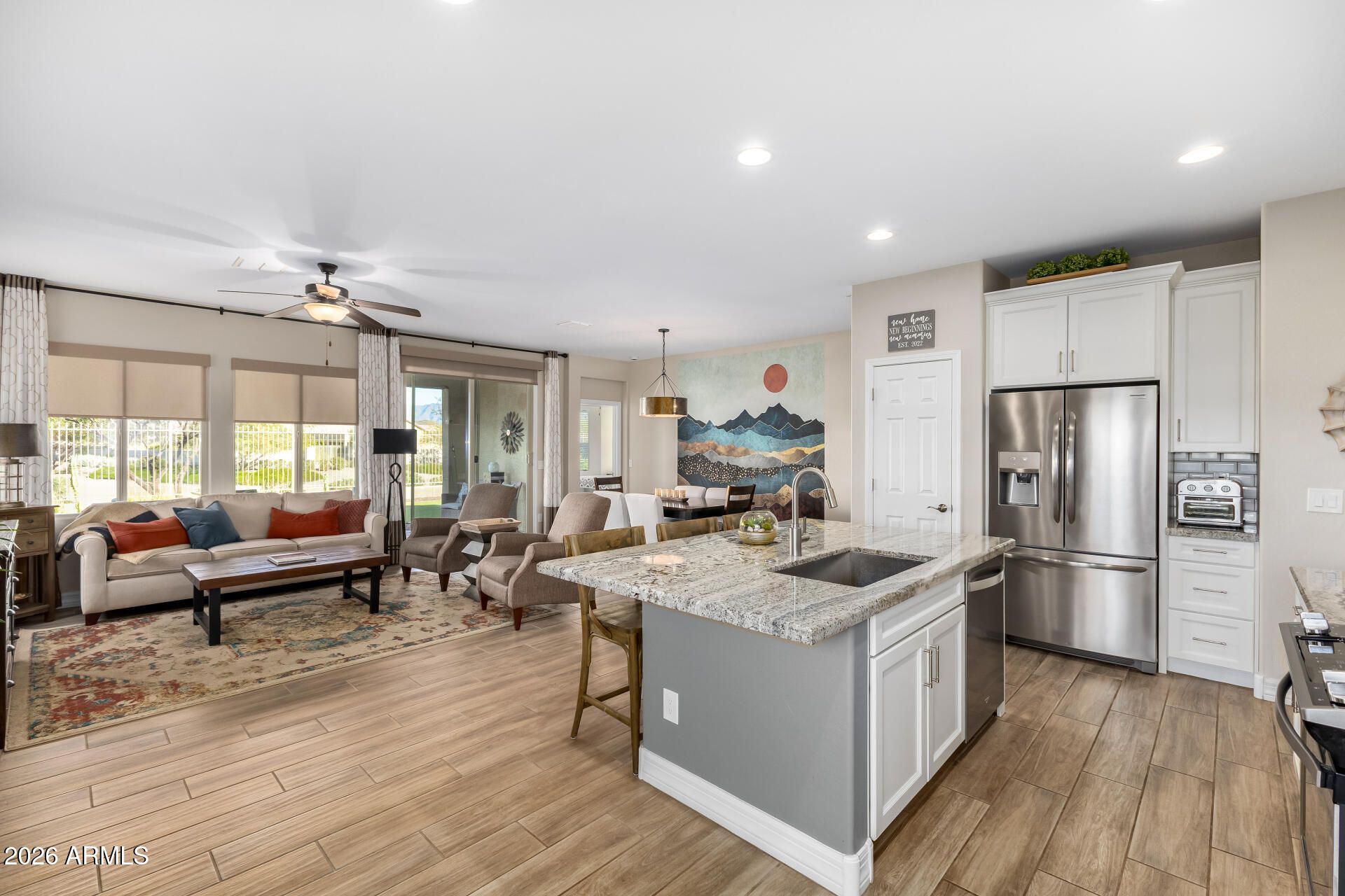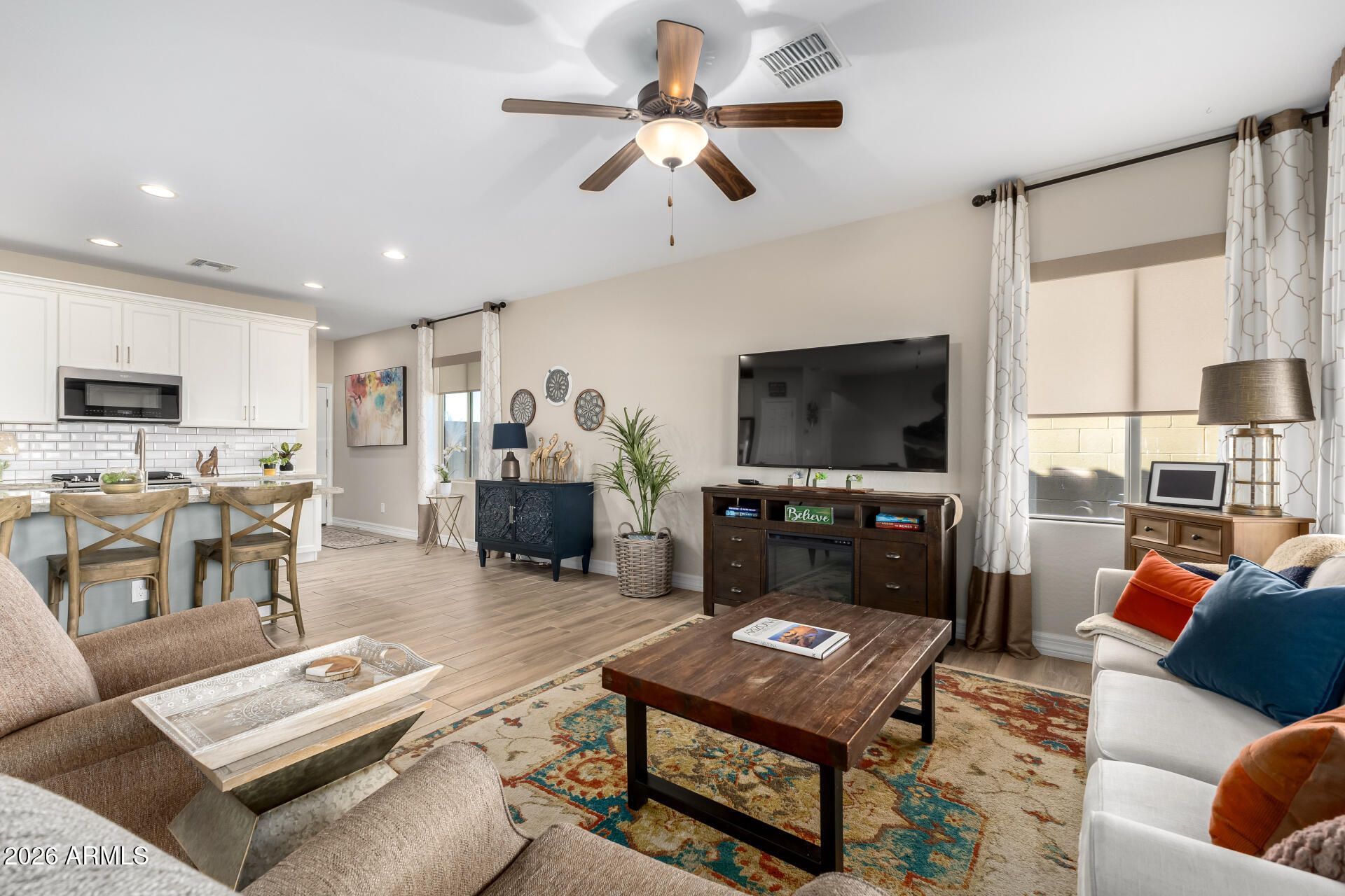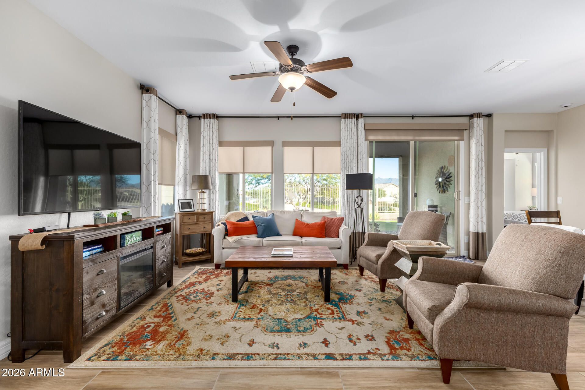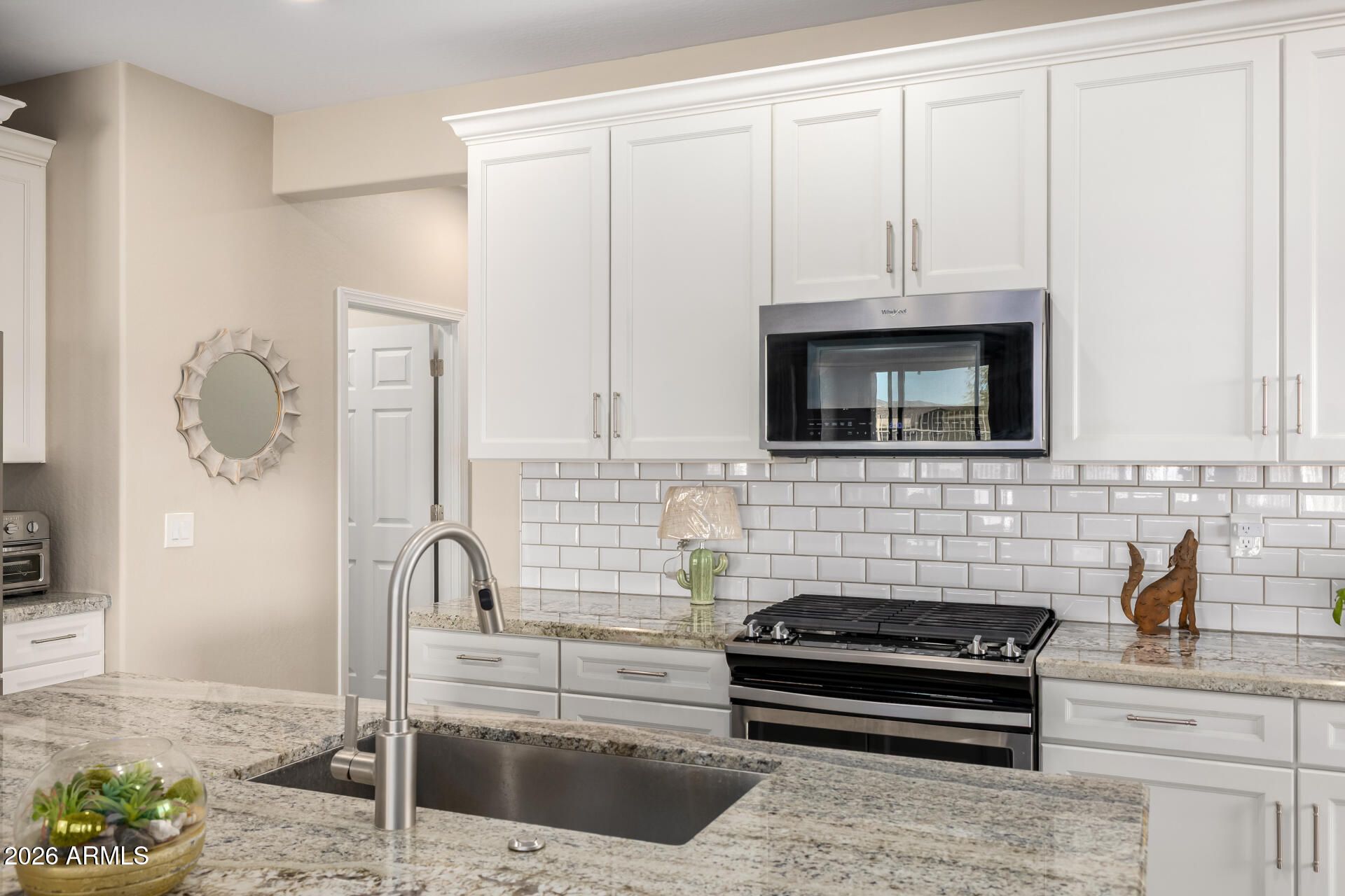 This inviting 2BR, 2BA home is on a cul-de-sac lot with mountain views. The private backyard features view fencing and overlooks a greenbelt—perfect for relaxing and enjoying Arizona sunsets. Split primary suite offers comfort and privacy with dual sinks, step-in shower, private toilet room, walk-in closet. A spacious guest bedroom and full guest bath provide flexibility for visitors. The kitchen is designed for everyday living and entertaining with a gas range, granite countertops, island, built-in microwave, and coffee bar. A separate den offers versatile space for a home office or hobby room. Located in CantaMia, enjoy access to resort-style amenities including pools, fitness center, pickleball, tennis, bocce, concerts, and scenic trails. Furnishings available on a separate BOS.