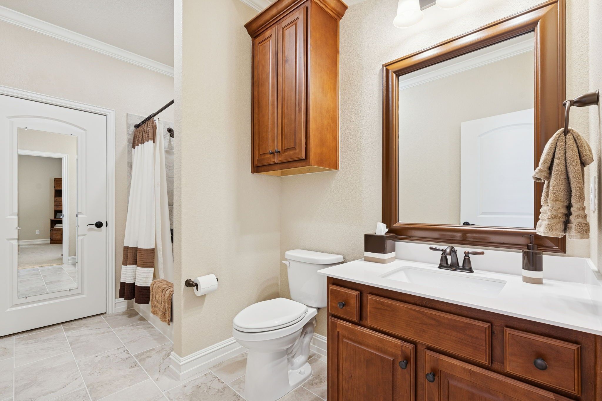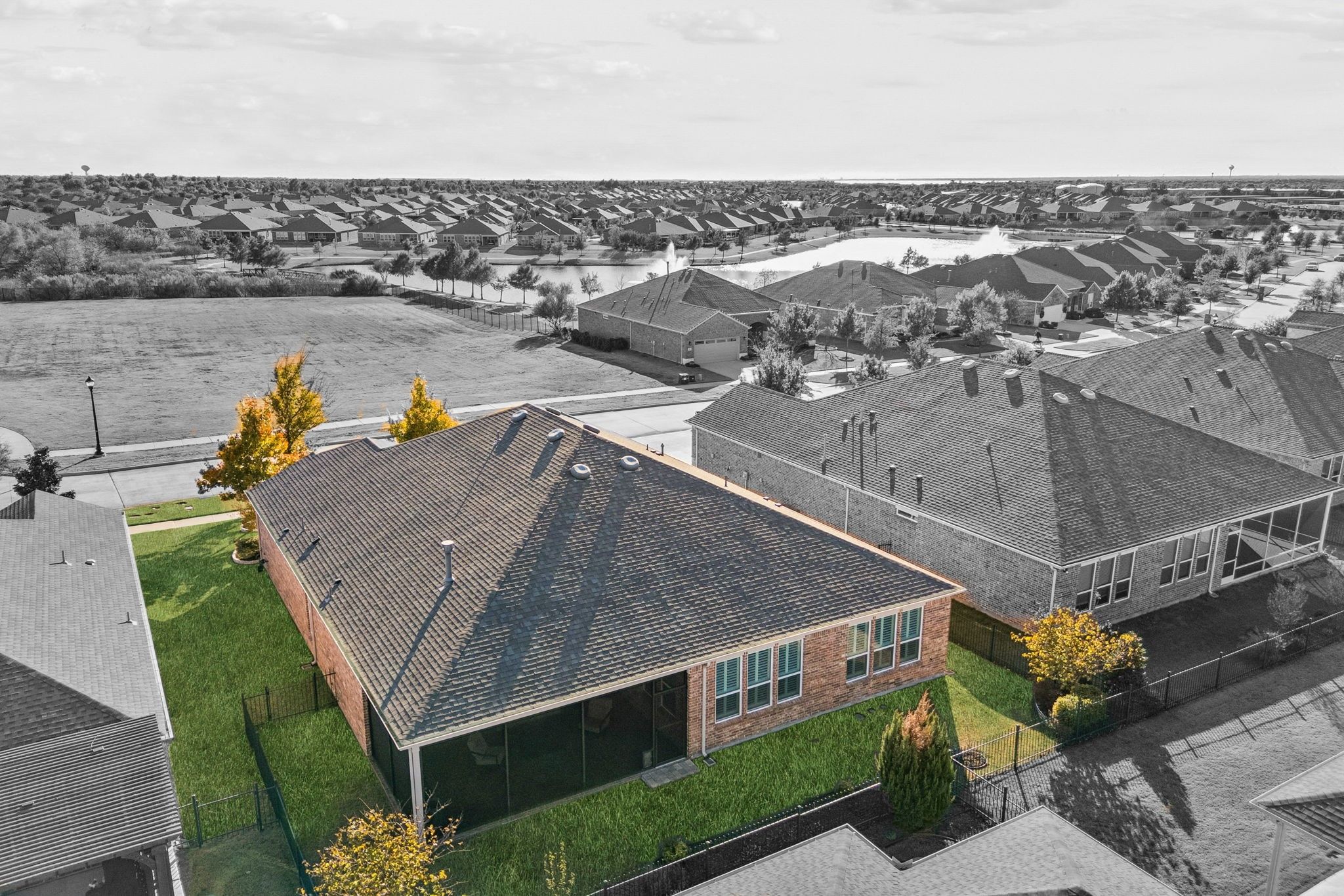 Welcome to resort-style living in the highly sought-after 55+ Frisco Lakes Estate Series. This beautifully appointed brick and stone home offers over 2,800 square feet of thoughtfully designed living space, combining comfort, elegance, and functionality. A stamped concrete walkway and lush landscaping create inviting curb appeal, while the front-entry 2-car garage with a tandem half space which is perfect for a golf cart or additional storage. Inside, enjoy an open floorplan highlighted by engineered hardwood floors throughout most of the home, plantation shutters, and abundant natural light. Carpet is featured in the secondary bedroom, with ceramic tile in all bathrooms. The expansive main living area includes a cozy fireplace and ceiling fan, seamlessly flowing into the kitchen—ideal for both everyday living and entertaining. The chef’s kitchen boasts quartz countertops, a gas cooktop, large island, breakfast bar, and butler’s pantry, all open to the living space. At the front of the home, a private office offers peaceful views of the future city park across the street, while a charming sitting area provides the perfect spot to enjoy morning coffee or relax with a book. The primary suite is a true retreat, featuring a ceiling fan, sitting area, enlarged walk-in closet, and an ensuite bath with dual sinks. The secondary bedroom includes carpet, a ceiling fan, and its own private ensuite, ideal for guests. A powder bath adds convenience for visitors. Additional highlights include a spacious laundry room with cabinetry and space for an extra refrigerator, and a screened-in porch with ceiling fan, perfect for enjoying the outdoors year-round. Experience low-maintenance living and access to the incredible Frisco Lakes amenities, all within a vibrant, active adult community. This home offers the perfect blend of luxury, comfort, and lifestyle—don’t miss it!