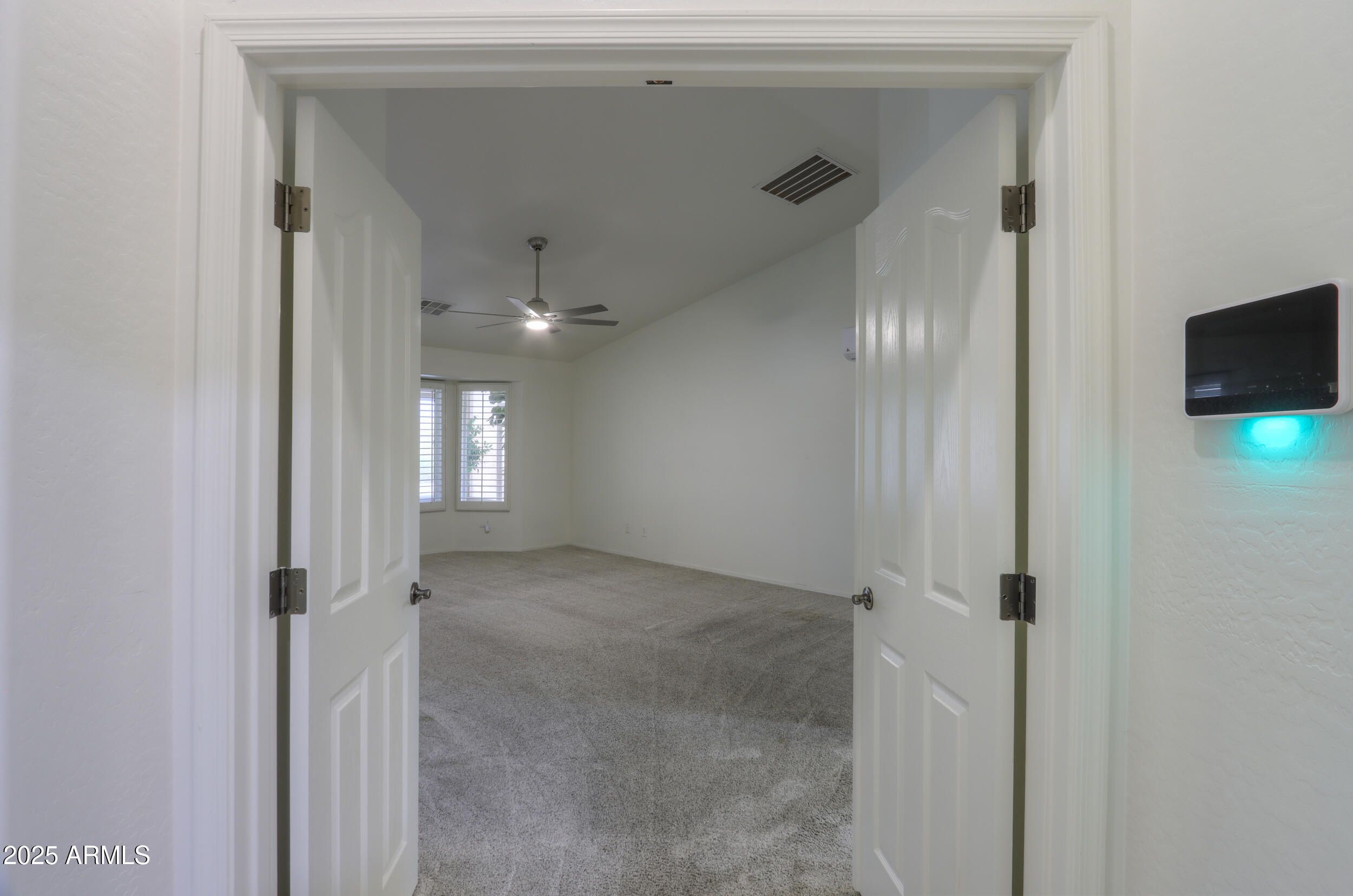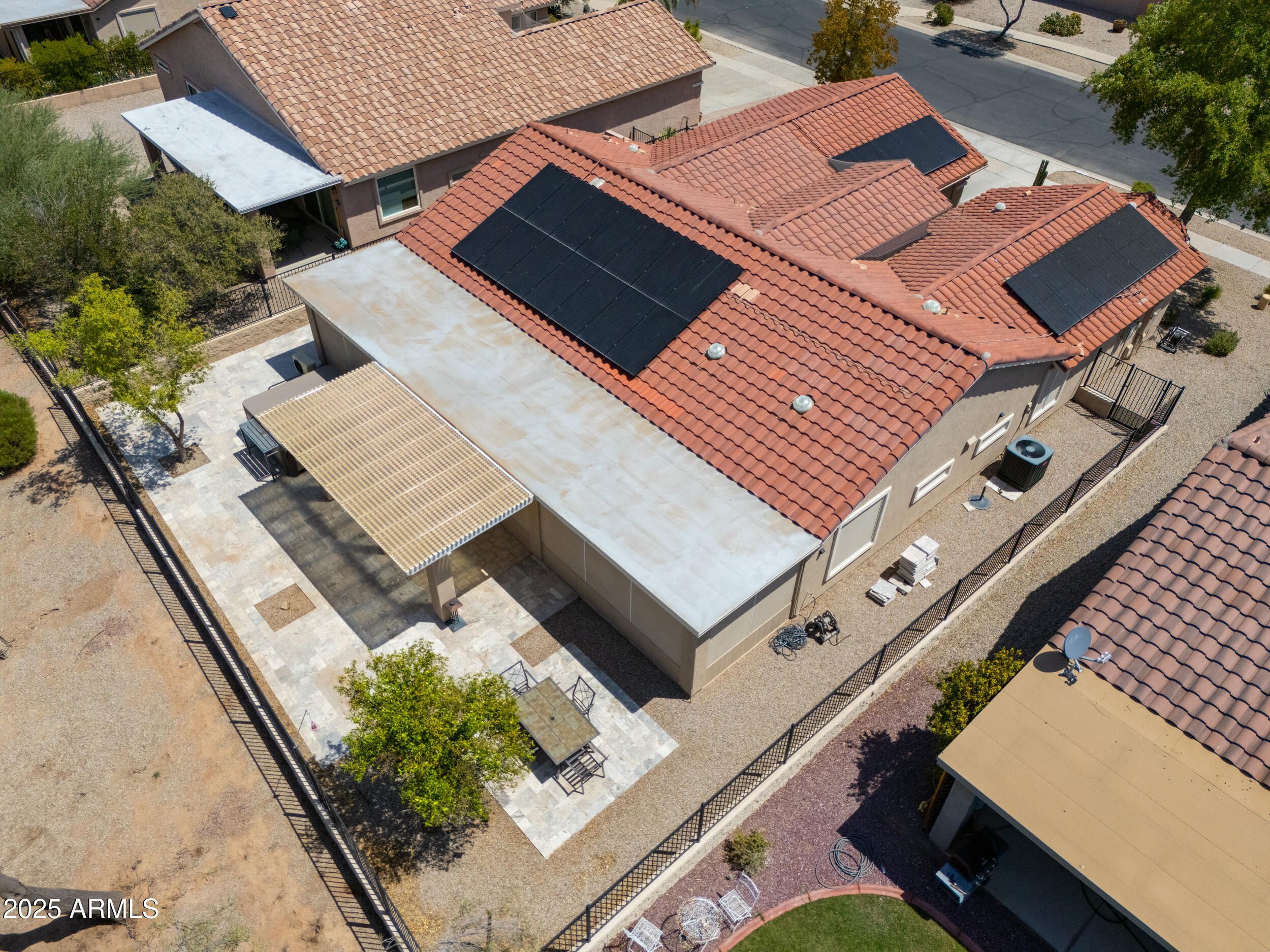 Welcome to this Beautiful 2 Bed, 2 Bath Home w/den & OWNED SOLAR! Situated on a privacy lot in the highly sought after Mission Royale 55+ Community. This popular 107 model offers both style & functionality. Step inside to find custom staggered tile flooring, plush carpet in the bedrooms, plantation shutters & ceiling fans in every room. The spacious den includes a built-in Murphy bed and built in cabinets, perfect for guests or flexible office space. The kitchen boasts granite countertops, an eat-at peninsula bar & LG stainless steel appliances. The primary suite is a true retreat featuring split A/C unit, large walk-in closet & luxurious bath w/custom walk-in shower, raised dual-sink vanity & skylight. Your guests will enjoy their stay w/private guest bedroom featuring a bay window & a second bathroom w/custom walk-in shower. Relax & entertain in the custom Arizona room, complete with travertine tile, leading to the extended outdoor patio & fenced backyard that backs to a peaceful wash, ideal for privacy & enjoying Arizona sunsets. Enjoy the comfort of the newly replaced HVAC, water heater & extended garage with extra lighting and custom built in cabinets throughout. This move-in ready gem combines comfort, quality & a perfect location in a community filled with amenities & active adult living.
