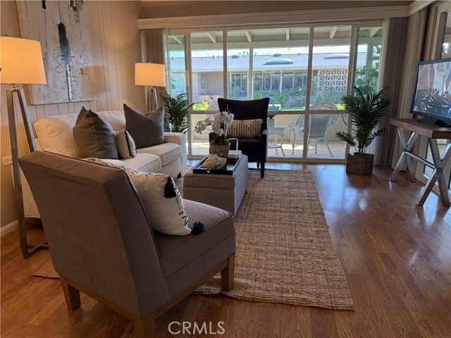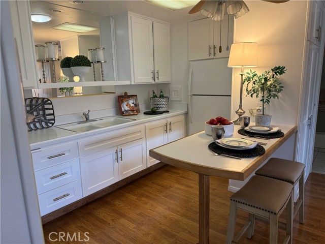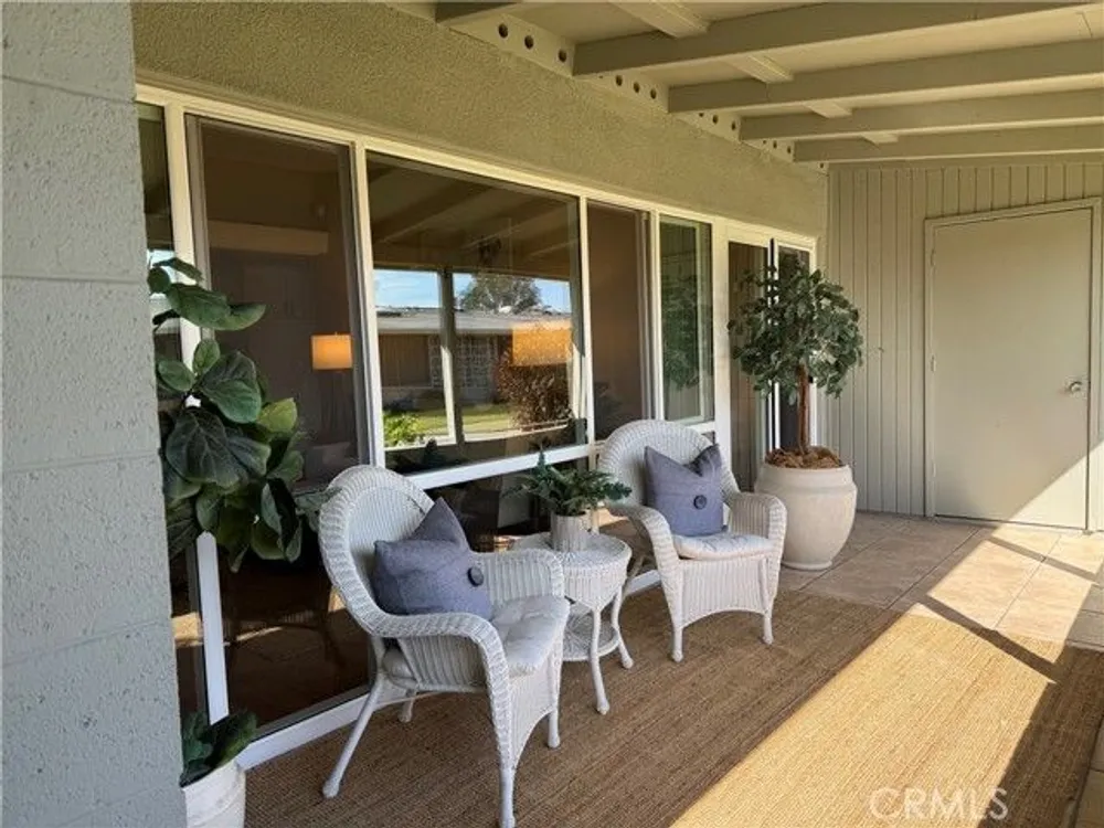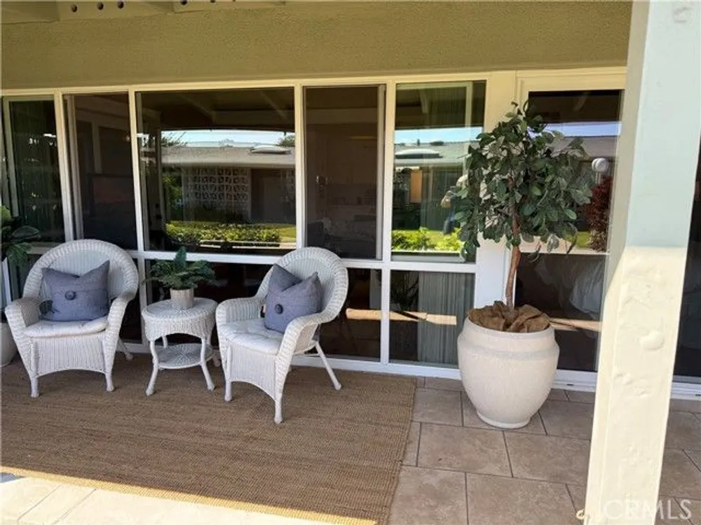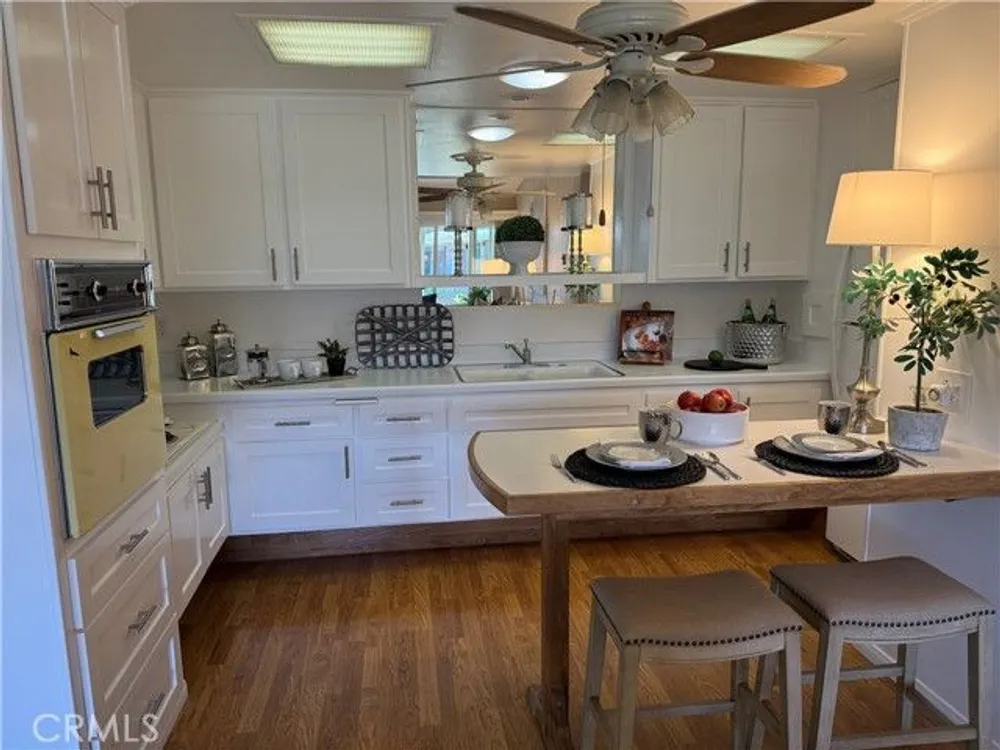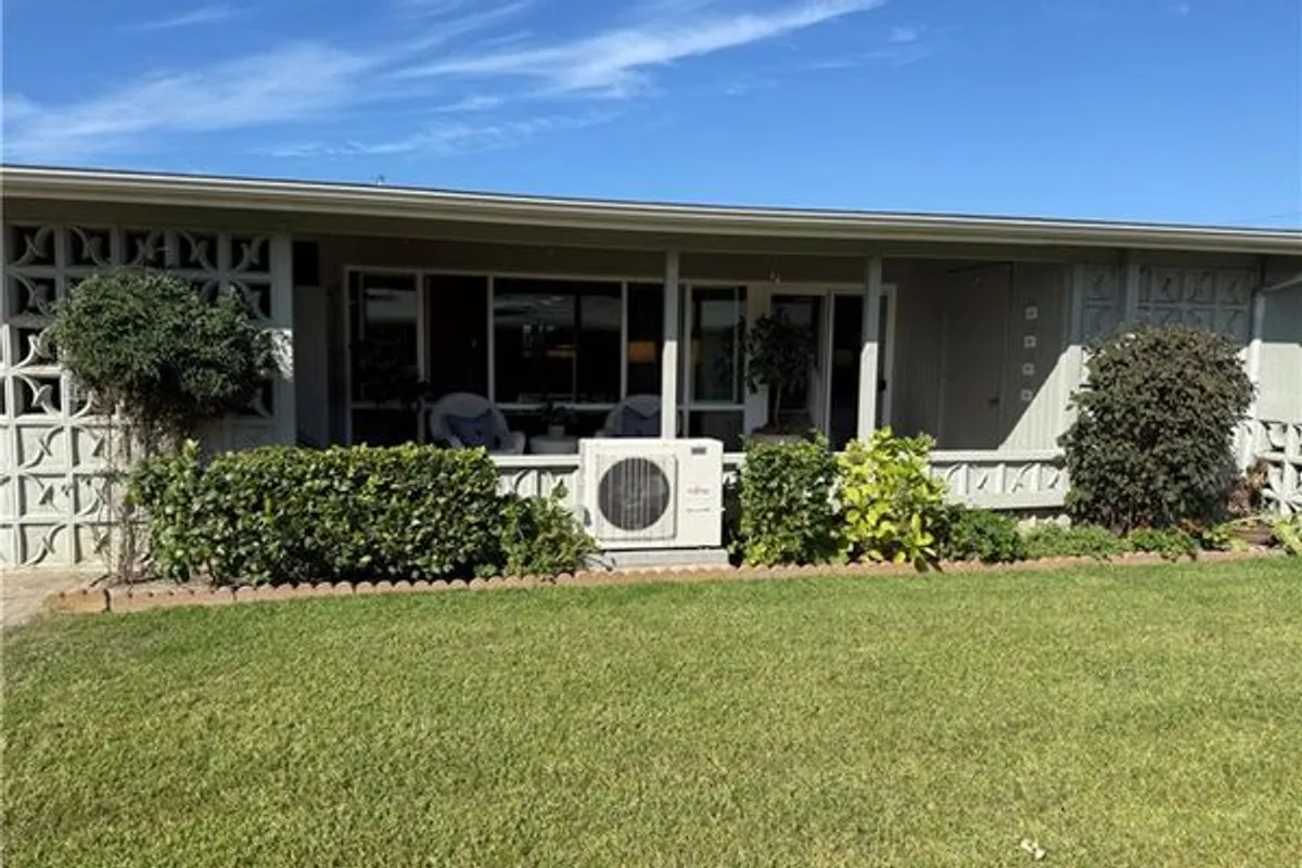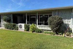 Lovely two bed room one bath room home that has been newly painted. Enter the living room through a beautiful leaded glass door that has a retractable screen, double pane windows, and a window treatment that is a combination of verticle blinds and the elegance of shear curtains. The kitchen has built-in appliances including a stove top, oven, refrigerator, added ceiling fan, pantry, sola tube and breakfast bar. The master bedroom has mirrored wardrobe doors, a heat pump air conditioning unit and double pane sliding doors to the patio. The bathroom has a cut-down shower, tile flooring and a sola tube. The second bedroom has a heat pump/air conditioning unit and mirrored wardrobe doors. The private patio has a gated entry, tile flooring and a walk-in storage. This charming home has laminate flooring, is light and bright and ready to move in.