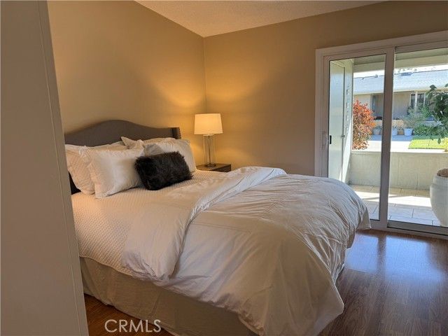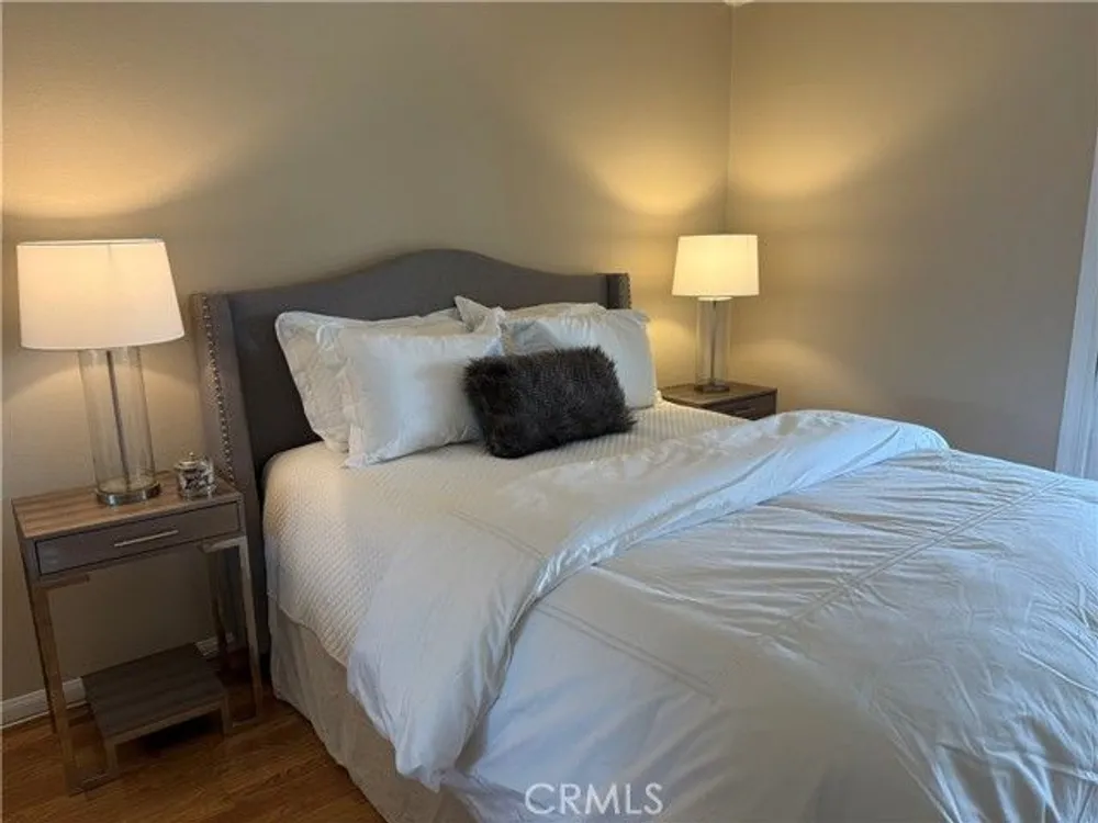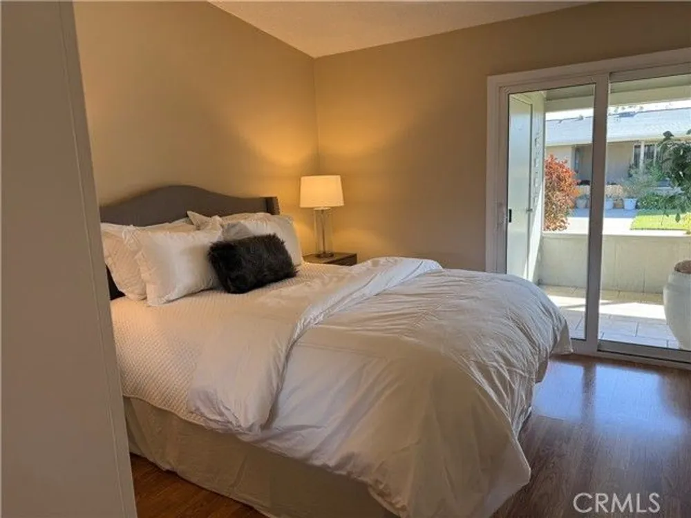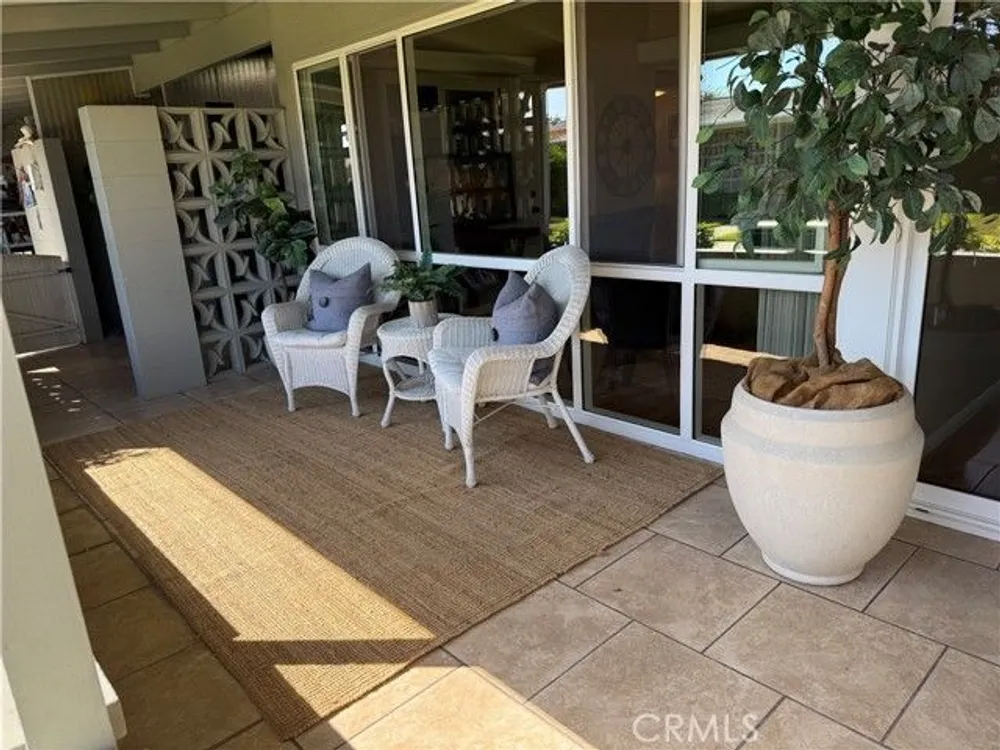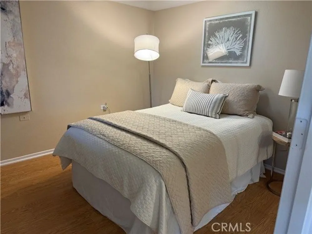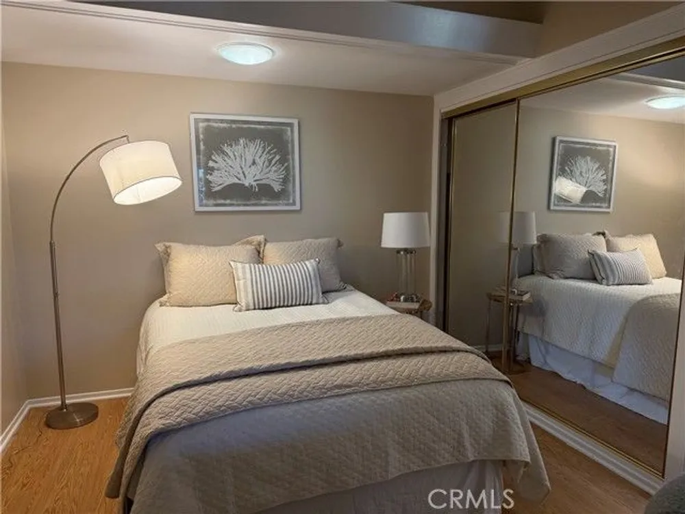 Lovely two bed room one bath room home that has been newly painted. Enter the living room through a beautiful leaded glass door that has a retractable screen, double pane windows, and a window treatment that is a combination of verticle blinds and the elegance of shear curtains. The kitchen has built-in appliances including a stove top, oven, refrigerator, added ceiling fan, pantry, sola tube and breakfast bar. The master bedroom has mirrored wardrobe doors, a heat pump air conditioning unit and double pane sliding doors to the patio. The bathroom has a cut-down shower, tile flooring and a sola tube. The second bedroom has a heat pump/air conditioning unit and mirrored wardrobe doors. The private patio has a gated entry, tile flooring and a walk-in storage. This charming home has laminate flooring, is light and bright and ready to move in.