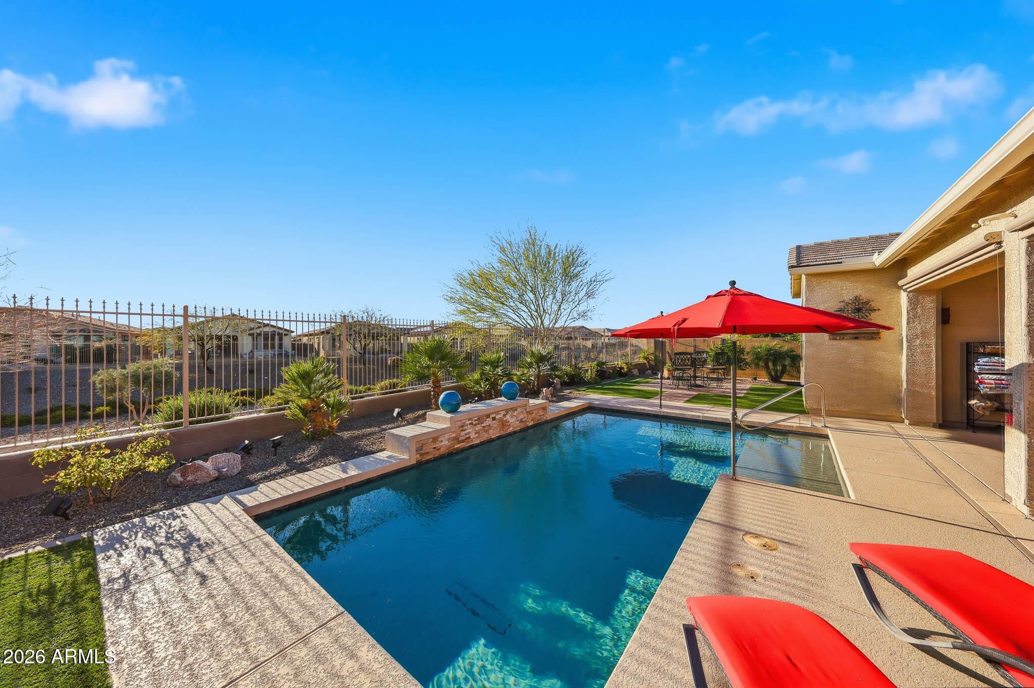 Welcome to the highly sought-after 55+ active adult community of CantaMia at Estrella. Nestled in the scenic Estrella Mountain Ranch area, this beautifully upgraded 3 bedroom, 2 bathroom home blends comfort, style, and resort-style living in one of the most desirable communities in the West Valley. From the moment you step inside, you'll notice the spacious great room concept with soaring 10-foot ceilings that create an open, airy feel perfect for entertaining or relaxing. The gourmet kitchen is the heart of the home, featuring a gas cooktop, generous cabinetry, and a layout designed for both everyday living and hosting friends. All appliances are included, making this a truly move-in-ready opportunity.The thoughtful upgrades continue with a 4-foot garage extension, built-in garage cabinet for storage, and a laundry room complete with additional cabinets and a utility sink.Step outside to your private backyard retreat designed for year-round Arizona living. Relax under the extended covered patio, cool off in the refreshing pool during the warm summer months, and enjoy swimming comfortably through the cooler seasons thanks to the heated feature. With view fencing behind you, the space feels open and serene. If you've been searching for a home in Goodyear AZ w/ a heated pool, mountain views & access to premier active adult amenities, This CantaMia home delivers the complete Arizona lifestyle. Experience resort style living in Estrella Mountain Ranch today.