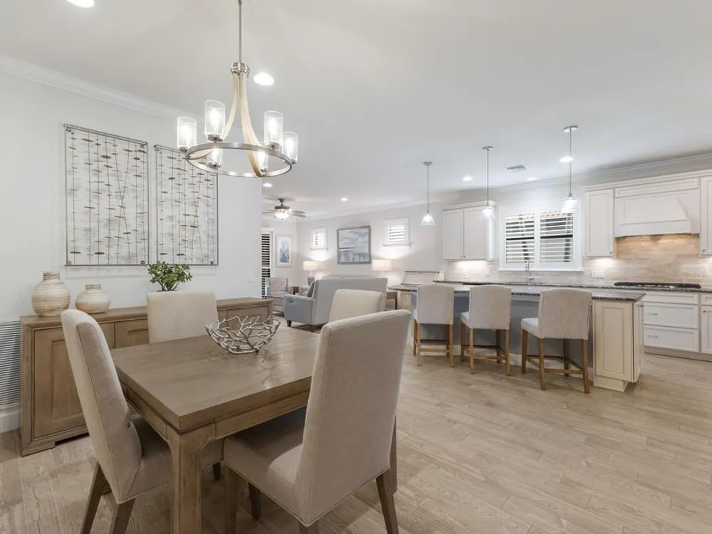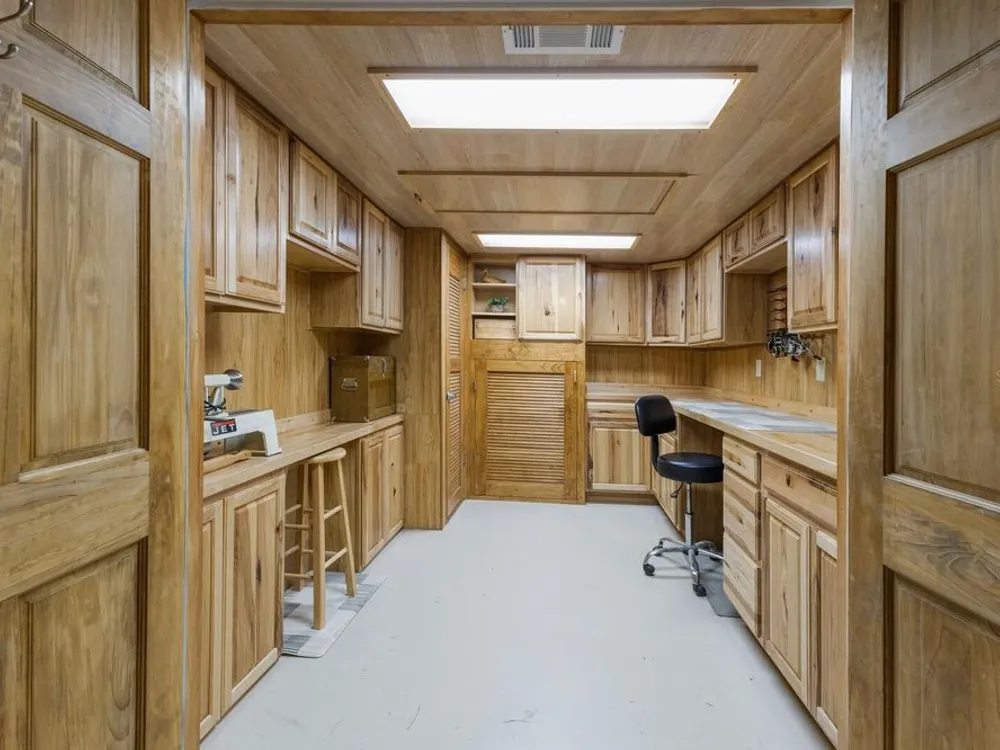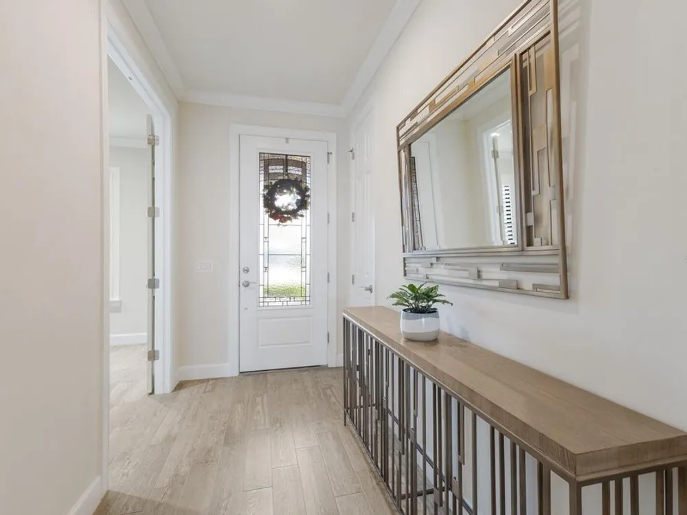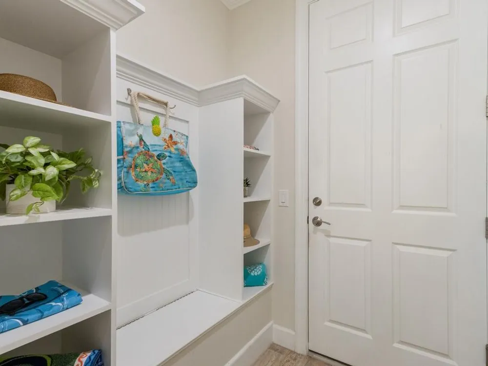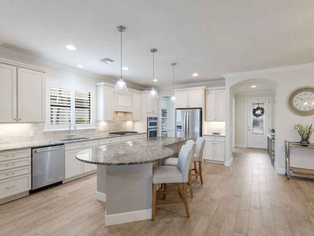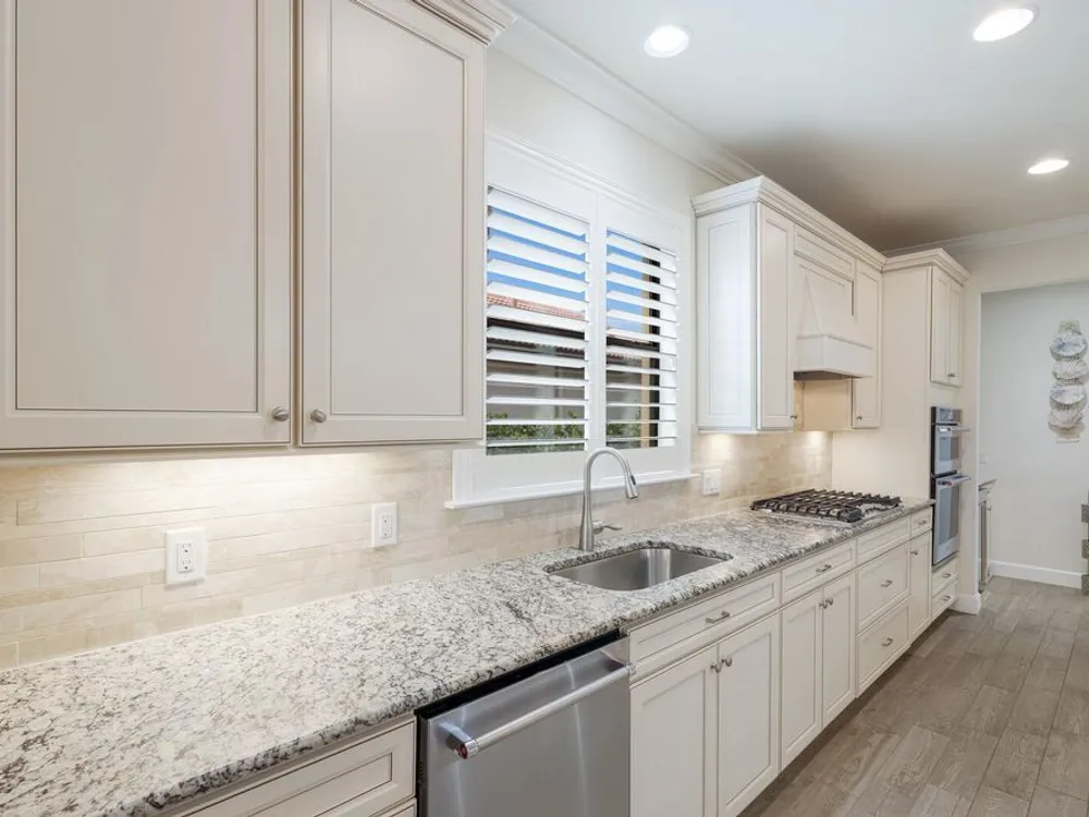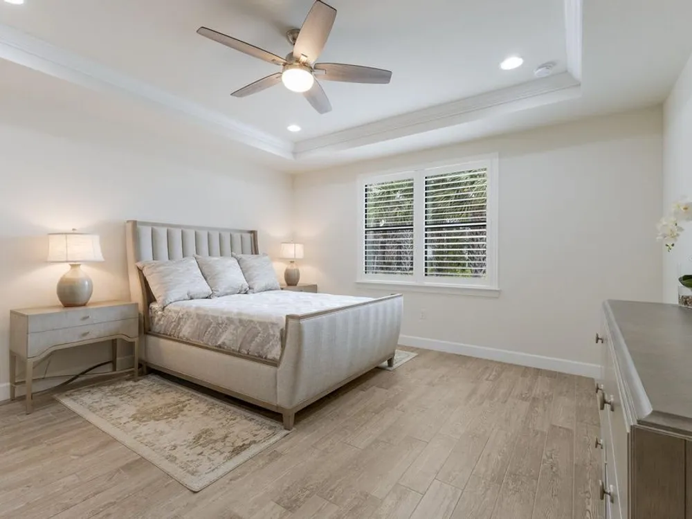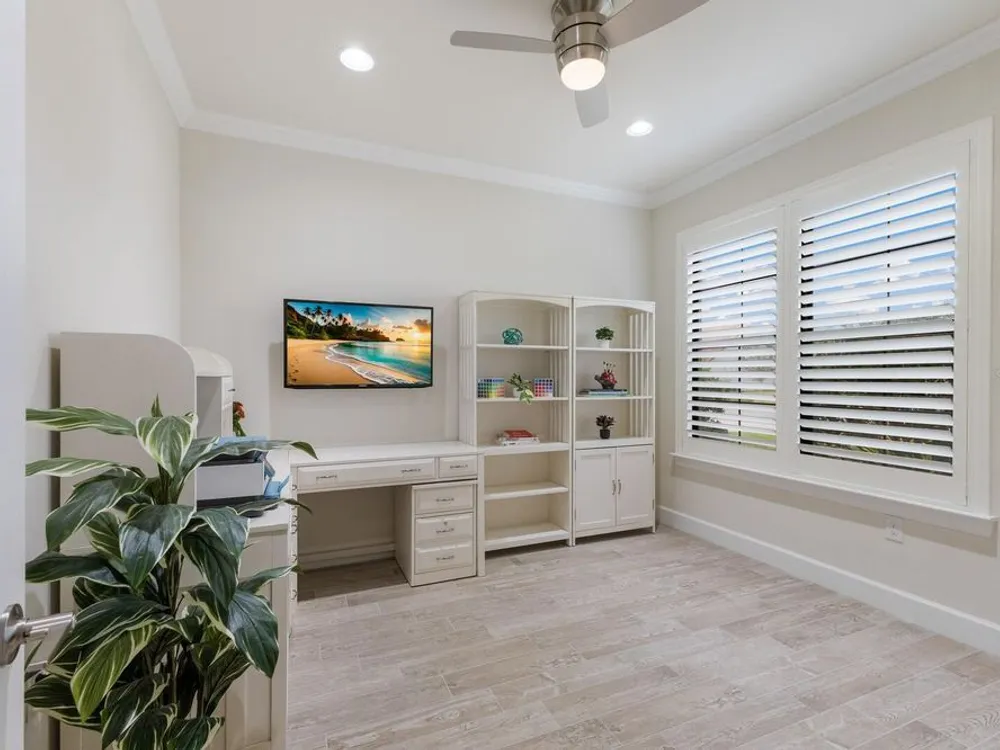 - Built-in Features, Ceiling Fan(s), Crown Molding, Eat-in Kitchen, In-Wall Pest Control, Open Floorplan, Main Level Primary, Solid Surface Counters, Split Bedrooms, Tray Ceiling(s), Walk-In Closet(s), Window Treatments