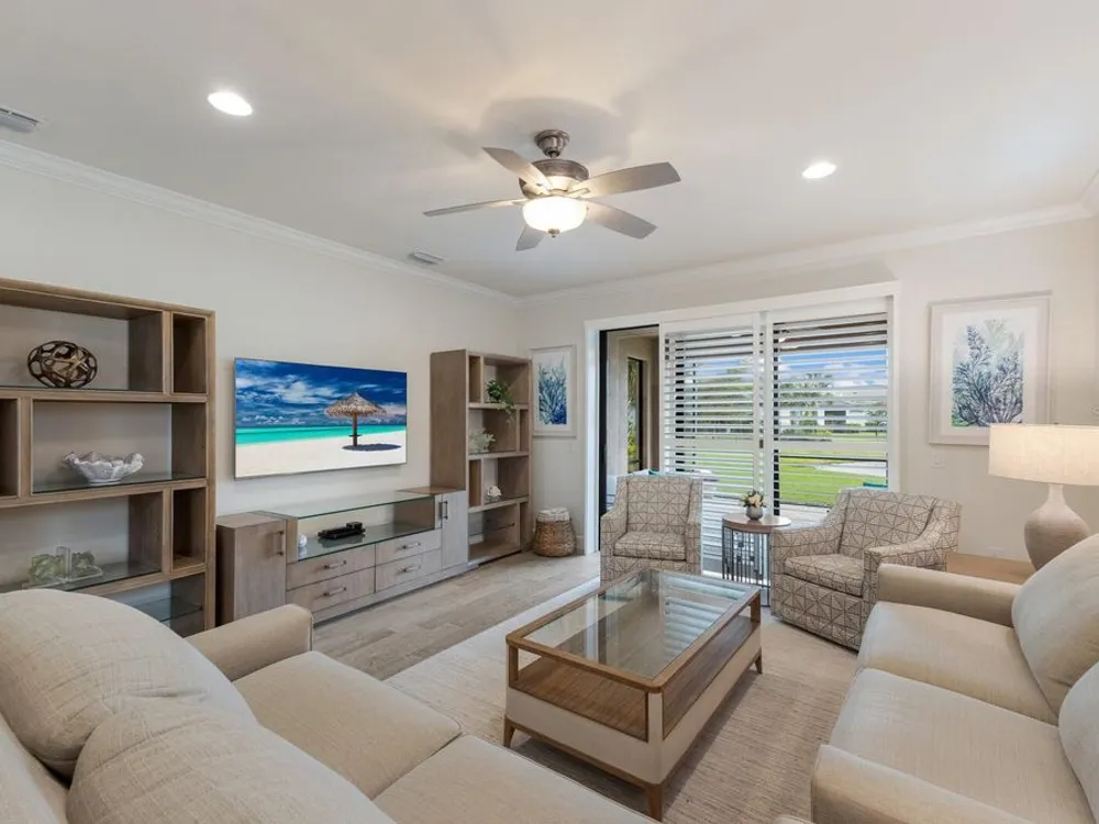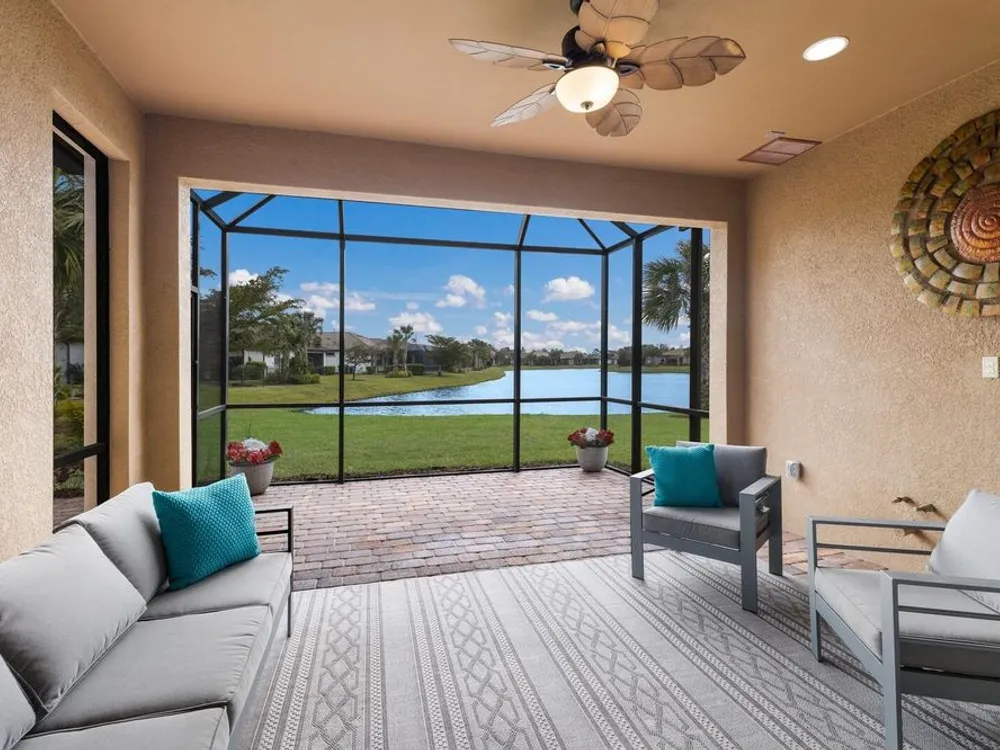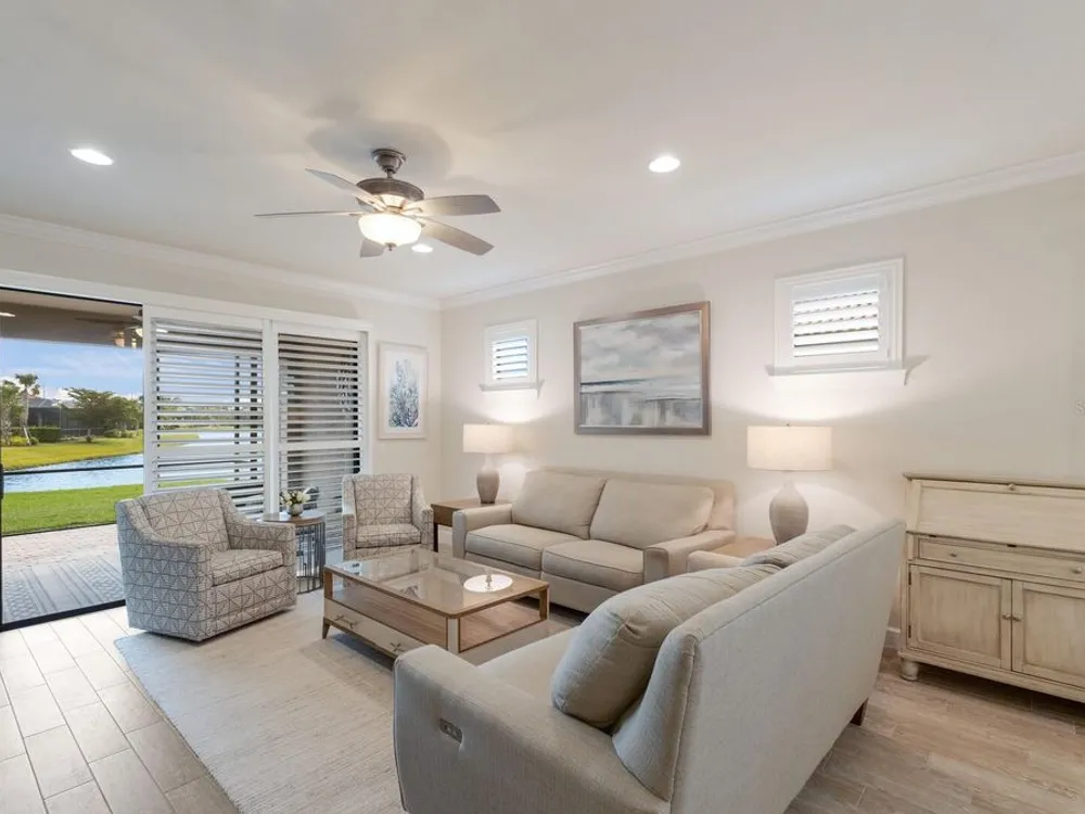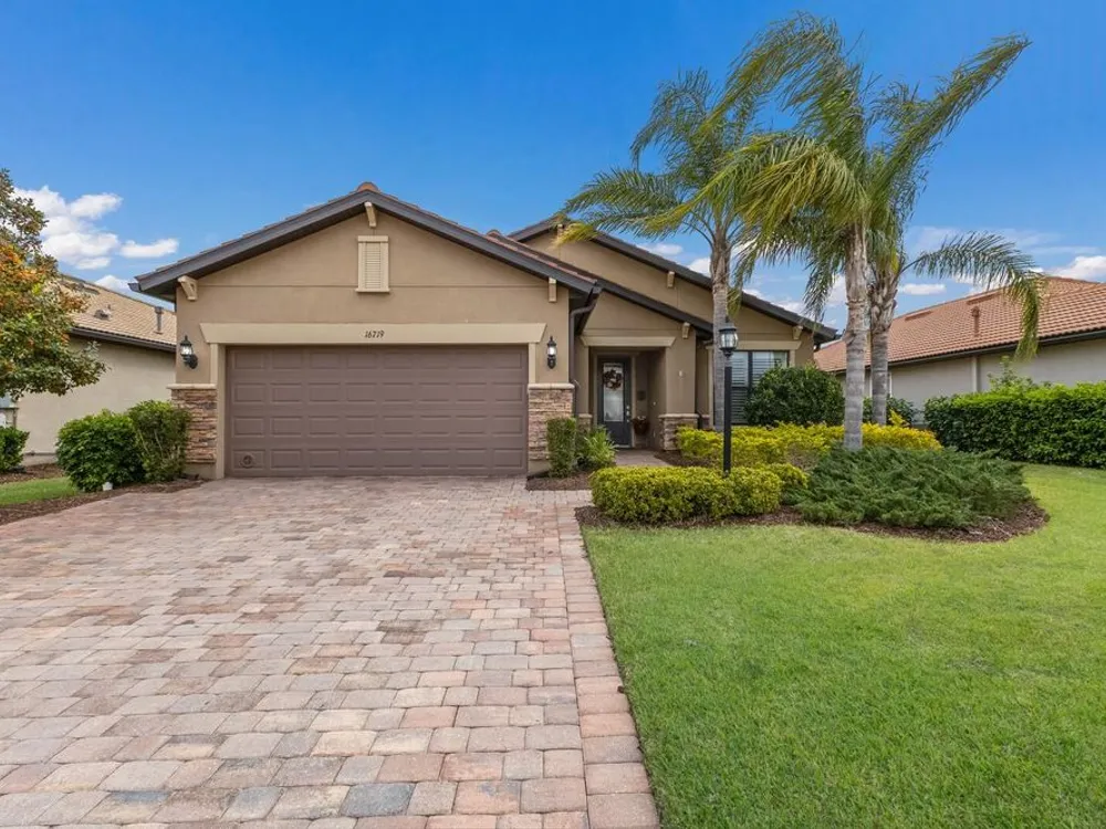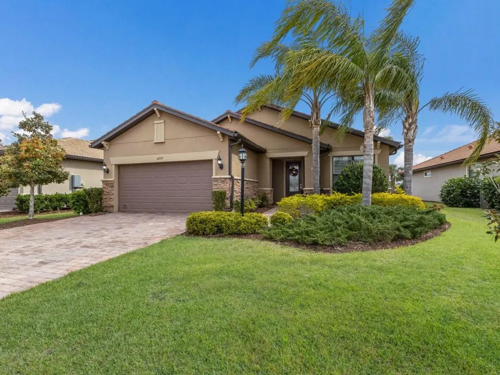 Rare opportunity! This home offers an assumable VA loan (subject to lender/VA approval). Buyer must qualify. Qualified buyers may benefit from favorable terms compared to today’s market. The Good Life Starts Here – Elegant, Stylish & Move-In Ready! Welcome to next-level living in this beautifully designed Martin Ray Model, set in the exclusive Del Webb 55+ community of Lakewood Ranch - the nation’s top multi-generational hotspot. This stunning home is loaded with custom upgrades, stylish design, and resort-style vibes, perfect for buyers who want the ultimate Florida lifestyle without the hassle of maintenance. With 1,964 sq. ft., this home features 2 bedrooms, 2 bathrooms, and a versatile den in an open, easy-flow floor plan. The den is located off the foyer, allowing for privacy and is a space that effortlessly adapts as a home office, workspace, guest retreat, hobby room, or creative nook—whatever you need it to be. This home is beautifully maintained and looks like a model. Interior upgrades include ceramic plank flooring throughout the entire home in a light/neutral color, neutral paint throughout, plantation shutters on all windows and sliders, crown molding and tall baseboards. Designer lighting lends to the home's style and continuity, all of the extra touches create a seamless flow throughout the entire home. Custom built-in drop zone and closet at entry to garage. Built-in cabinets and laundry tub in the laundry room, which is conveniently located close to the primary bedroom. Owner's suite complete with tray ceiling and ensuite featuring a soaking tub and separate shower, walk-in closet and extra storage. Kitchen dreams start here, it is perfect for foodies, entertainers and everyday convenience with a 10-foot island, separate beverage center and a walk-in pantry. Upgraded stainless steel appliances and gas cooktop, premium cabinets with wood range hood, designer backsplash and under-cabinet lighting. Kinetico water filtration system with water softener. Step outside to your backyard and soak up the Florida Lifestyle. Extended screened-in lanai that is plumbed for an outdoor kitchen and extra outside paver patio area perfect for gardening or to simply watch the beautiful sunsets. Widened paver driveway AND don't miss this garage - there is a complete hobby workshop with countertops and double doors to allow golf cart parking inside, pull-down stairs to access upper and lower storage areas, built-in cabinets and small beverage fridge - this is truly a bonus of quality workmanship. Don't miss this one, schedule your private showing today!