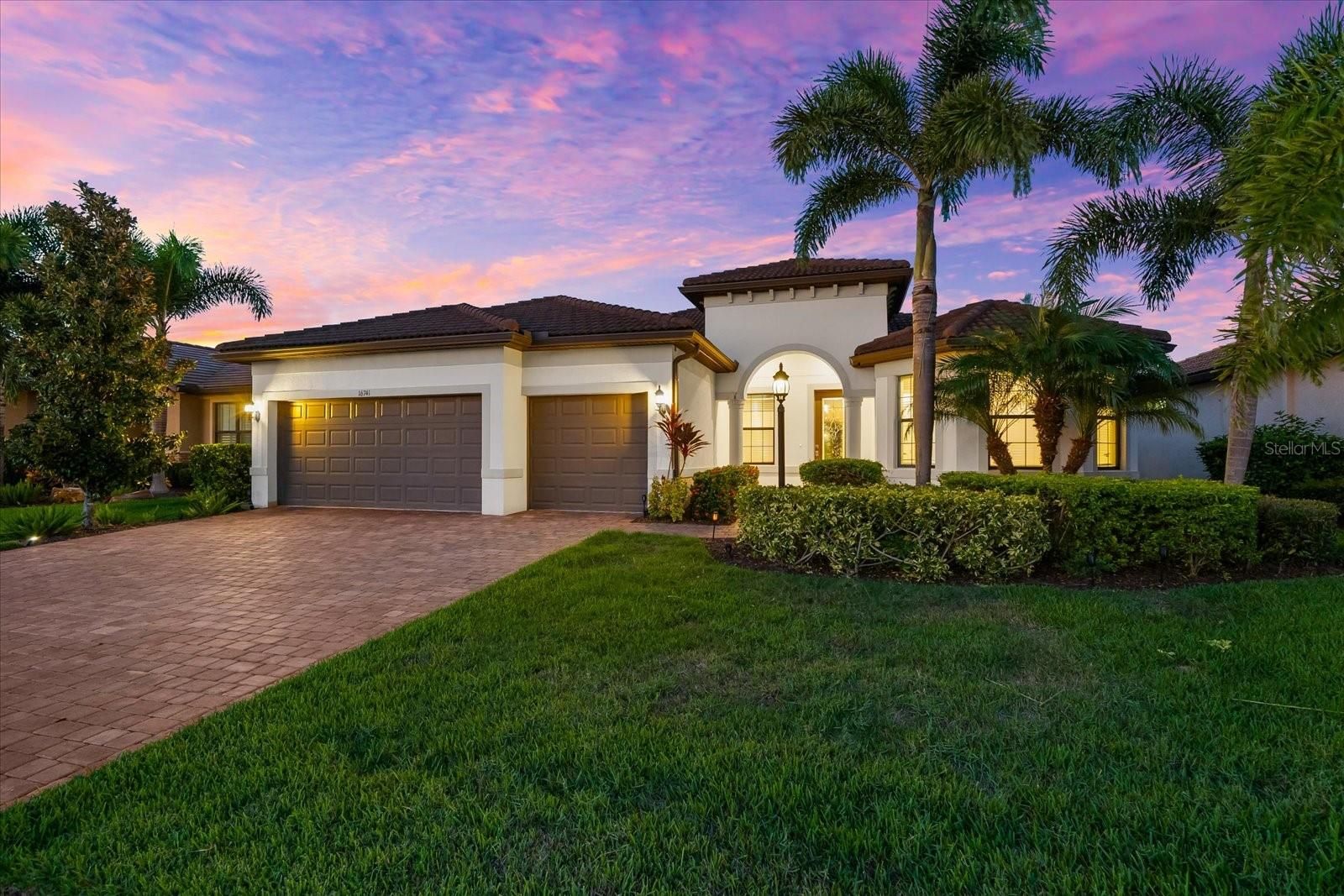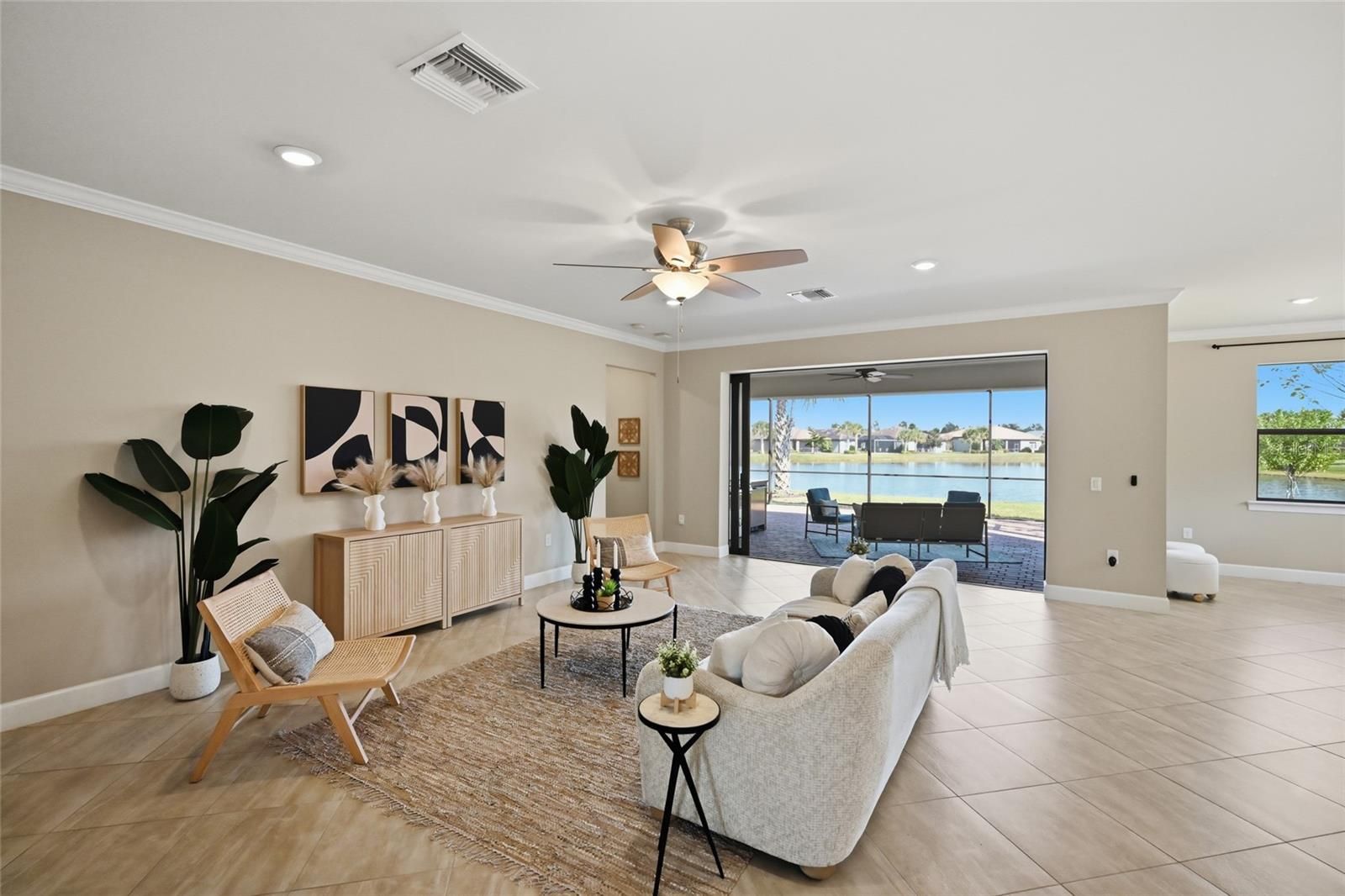 One or more photo(s) has been virtually staged. INTRODUCING THE PERFECT PINNACLE! Prepare to be captivated by this exceptional Estate Series PINNACLE MODEL, offering breathtaking water views and situated in the highly sought-after 55+ Del Webb community of Lakewood Ranch—the nation’s #1 multi-generational expert-planned development. This exquisite residence delivers the ultimate in luxurious Florida living, blending timeless elegance with modern upgrades and everyday functionality. With 3 bedrooms, a versatile den, and a spacious open layout, this home is ideal for both entertaining and daily comfort. Designer touches are found throughout, including crown molding, 5 ¼ baseboards, tray ceiling in the owner’s suite, gorgeous coffered ceiling in the den, designer fans, upgraded lighting fixtures, and hurricane impact glass for peace of mind. At the heart of the home, the gourmet kitchen inspires culinary creativity, featuring a massive island with seating for four, modern pendant lighting, 42” solid wood cabinetry, elegant quartz countertops, stylish backsplash, gas cooktop with upgraded hood, generous storage and prep space, and a custom pantry with built-ins. The home is finished with hard surface flooring throughout that includes a mix of light ceramic tile in the main living areas and rich wood plank flooring in the bedrooms and den, creating a yet warm ambiance. For seamless entertaining, open the zero- corner sliding doors to the extended, covered lanai where you will find ample space for dining, lounging, and tranquil water views—the perfect backdrop for Florida evenings. The expansive owner’s suite offers room for a cozy sitting area and a spa-inspired ensuite with dual vanities, large walk-in shower with a grab bar for safety, and an oversized custom walk-in closet with built-ins and abundant storage. Two additional guest bedrooms, including one with its own ensuite, custom closet, a versatile den with a coffered ceiling—ideal as a home office, gym, craft room, or library. Additional highlights include a 3-car garage built-in storage cabinets, upgraded laundry room with solid wood cabinetry, utility sink, extended screened lanai for ultimate outdoor living. Act quickly. Don’t miss the chance to call this Pinnacle Model showpiece your own and experience luxury living at its finest. Schedule your private tour today!