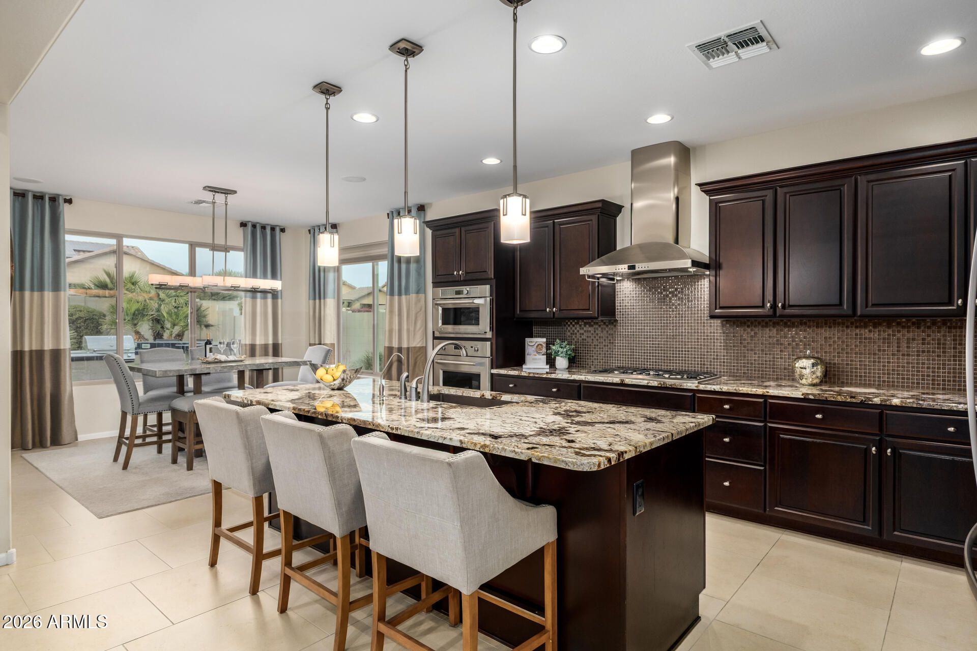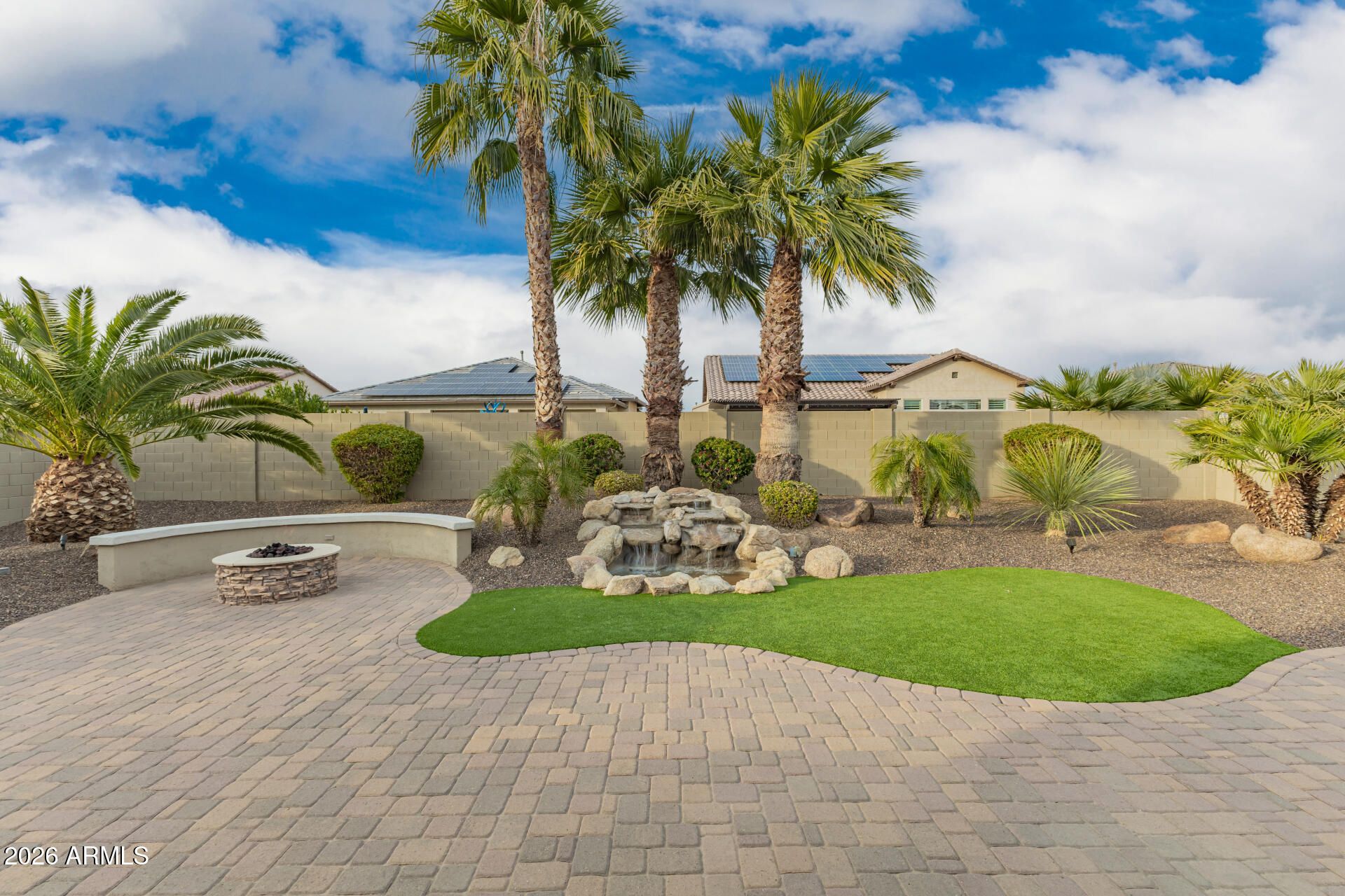 Welcome to this beautifully adorned, meticulously maintained home in PebbleCreek Golf Community. NEW Tesla Inverter and Solar Panels!! This extended Treviso model has it all! The gorgeous professional front landscape leads to the warmth of the front foyer to the open living area which allows you to take in the resort style back yard. A gourmet kitchen with large island, walk in pantry, & extended eat in kitchen makes entertaining family and friends easy! The spacious floor plan boasts 24'' tile floors throughout, Plantation Shutters, custom stacked stone feature wall with surround sound throughout the home, custom espresso kitchen cabinets with mosaic tile black splash, GE Monogram gas cook top, new refrigerator & more. Additional features include the newer garage cabinetry, epoxy garage floors, addt'l overhead storage & extended garages! OWNED SOLAR is another PLUS! Enjoy the professionally landscaped PRIVATE back yard, boasting a large covered patio with cobblestone pavers, serene rock waterfall and an outdoor kitchen...an entertainers dream! The mist system keeps the covered patio cooler on those hot summer days, but for the cool winter evenings, the cozy firepit is where to be. The yard has been equipped with the electrical for a hot tub/spa so that you can sit and watch the beautiful Arizona sky and stars! Enjoy a short distance to the Tuscany Falls Clubhouse, new restaurant, pool, fitness center and pickleball courts. This home is well maintained, move-in ready and suits any AZ lifestyle whether a full-time haven or a convenient lock & leave, this property is most desirable for the active adult lifestyle! Don't miss the opportunity to make this your PebbleCreek Dream Home!