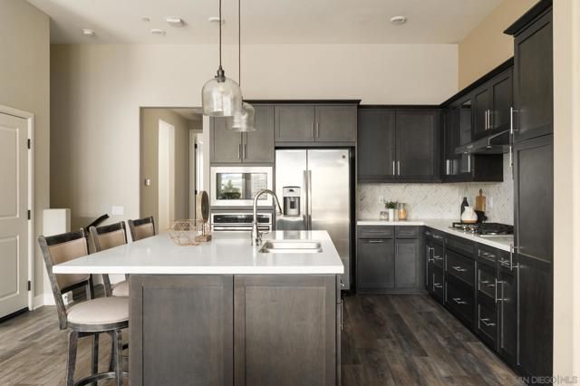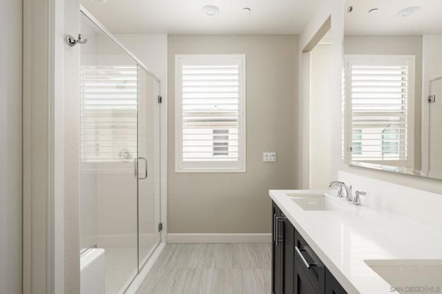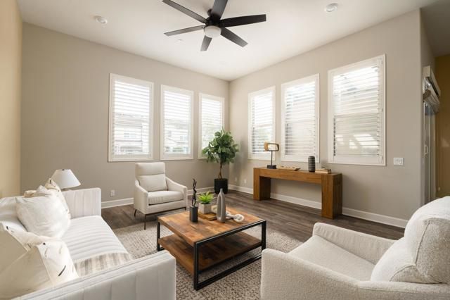 Ideally situated within the prestigious 55+ gated enclave of Avante at Del Sur, this beautifully appointed dual-suite Plan 3 residence offers a refined blend of modern design and effortless living. Built in 2018, the home is filled with natural light and showcases a thoughtfully designed open-concept layout highlighted by high ceilings, wide-plank upgraded flooring, recessed lighting, and custom shutters throughout. The gourmet kitchen serves as the centerpiece of the home, featuring quartz countertops, stainless steel appliances, a sleek modern backsplash, generous cabinetry, and an expansive center island that seamlessly connects the dining and living areas—perfect for both intimate gatherings and everyday enjoyment. Both bedrooms are designed as private en-suite retreats, each offering walk-in closets and spa-inspired bathrooms that create a sense of comfort and tranquility. Additional highlights include a private in-home elevator for effortless access between levels, a finished two-car garage, a spacious laundry room, and inviting outdoor living spaces with both a balcony and patio—ideal for relaxing or entertaining. Residents of Avante enjoy exclusive access to a resort-style clubhouse complete with pool and spa, state-of-the-art fitness center, lounge, game room, BBQ area, and welcoming fire pits. As part of the award-winning Del Sur master-planned community, homeowners also benefit from 11 community pools, 14 parks, scenic walking trails, and convenient shopping and dining at Del Sur Town Center. This exceptional residence delivers a rare opportunity to enjoy luxury, comfort, and a vibrant 55+ lifestyle in one of North County San Diego’s most desirable communities.