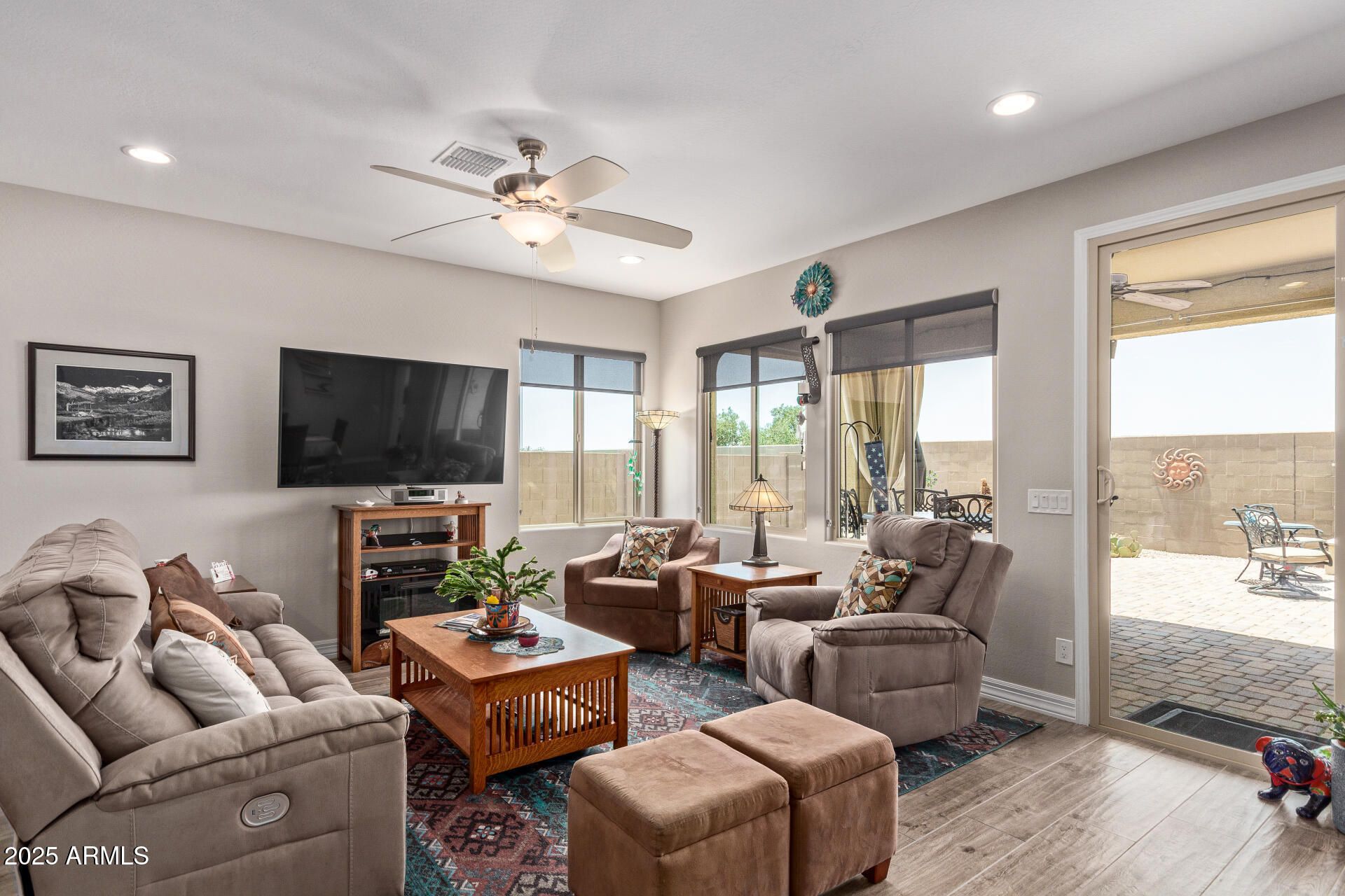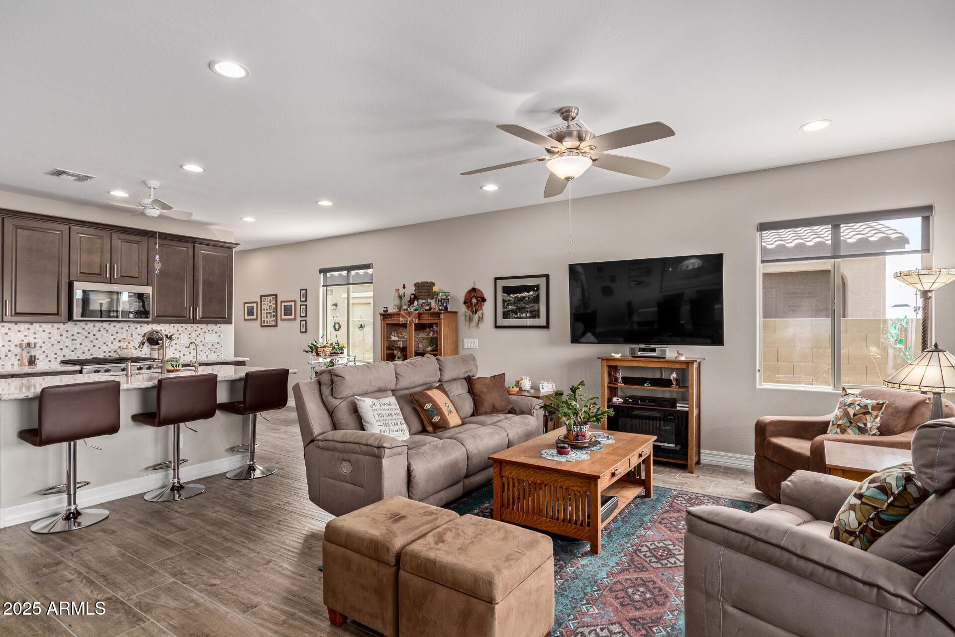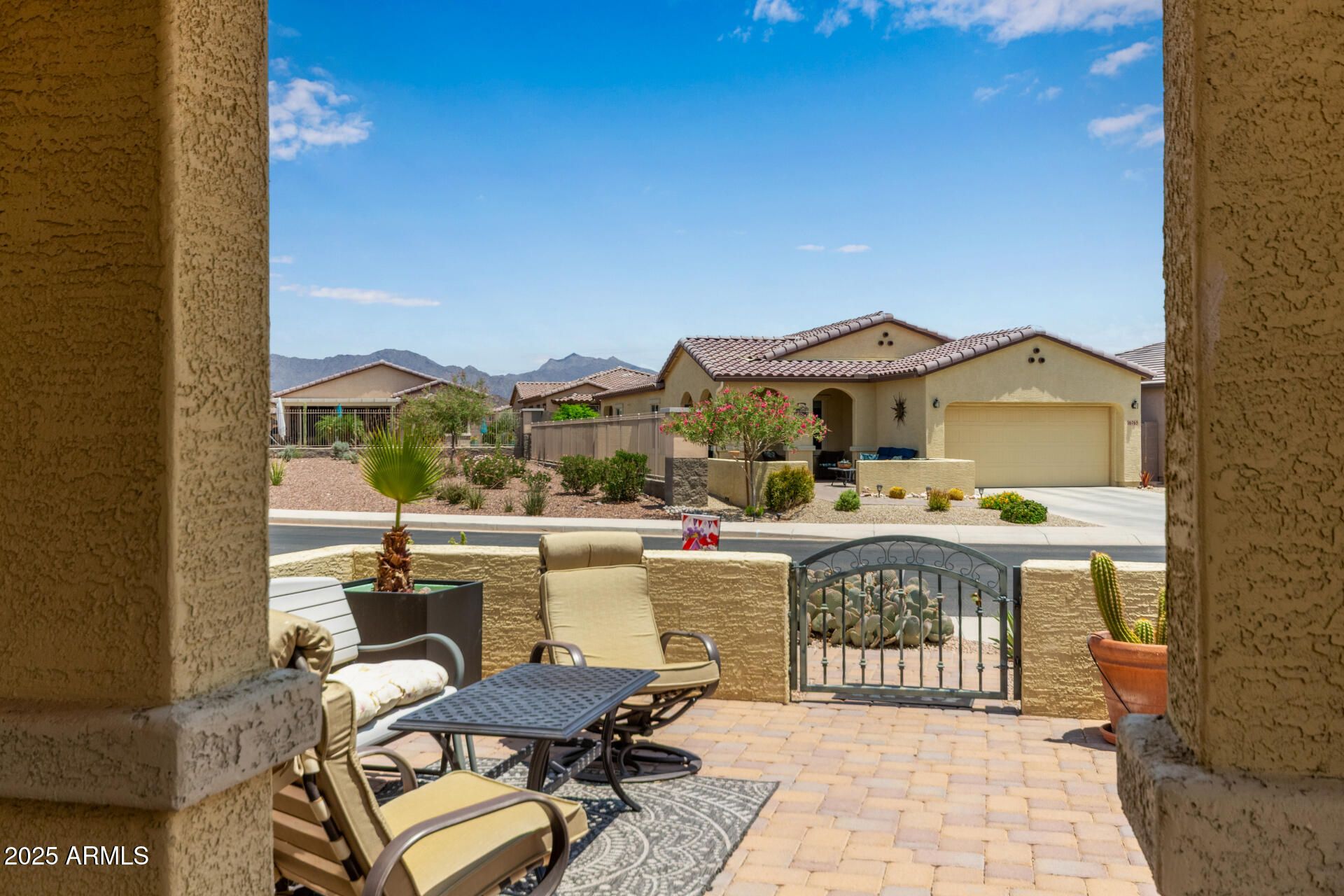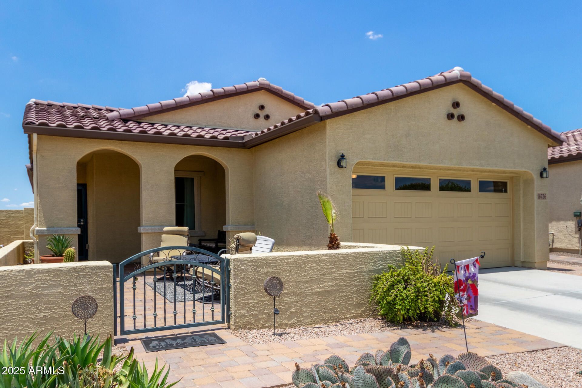 Motivated seller. This beautiful home offers 2 beds + spacious DEN, 2 baths, 2-car garage, & a desert landscape. Its charm starts with the fenced-in paver front patio & porch. Experience resort-style living in the gated Cantamia, a 55+ Community tucked in the scenic foothills of the Estrella Mountains! The inviting interior showcases tons of natural light, neutral palette, & wood-look tile flooring t/out. The welcoming great room to impress! The open-concept kitchen boasts SS appliances, quartz counters, a pantry, mosaic tile backsplash, ample cabinetry, and an island.