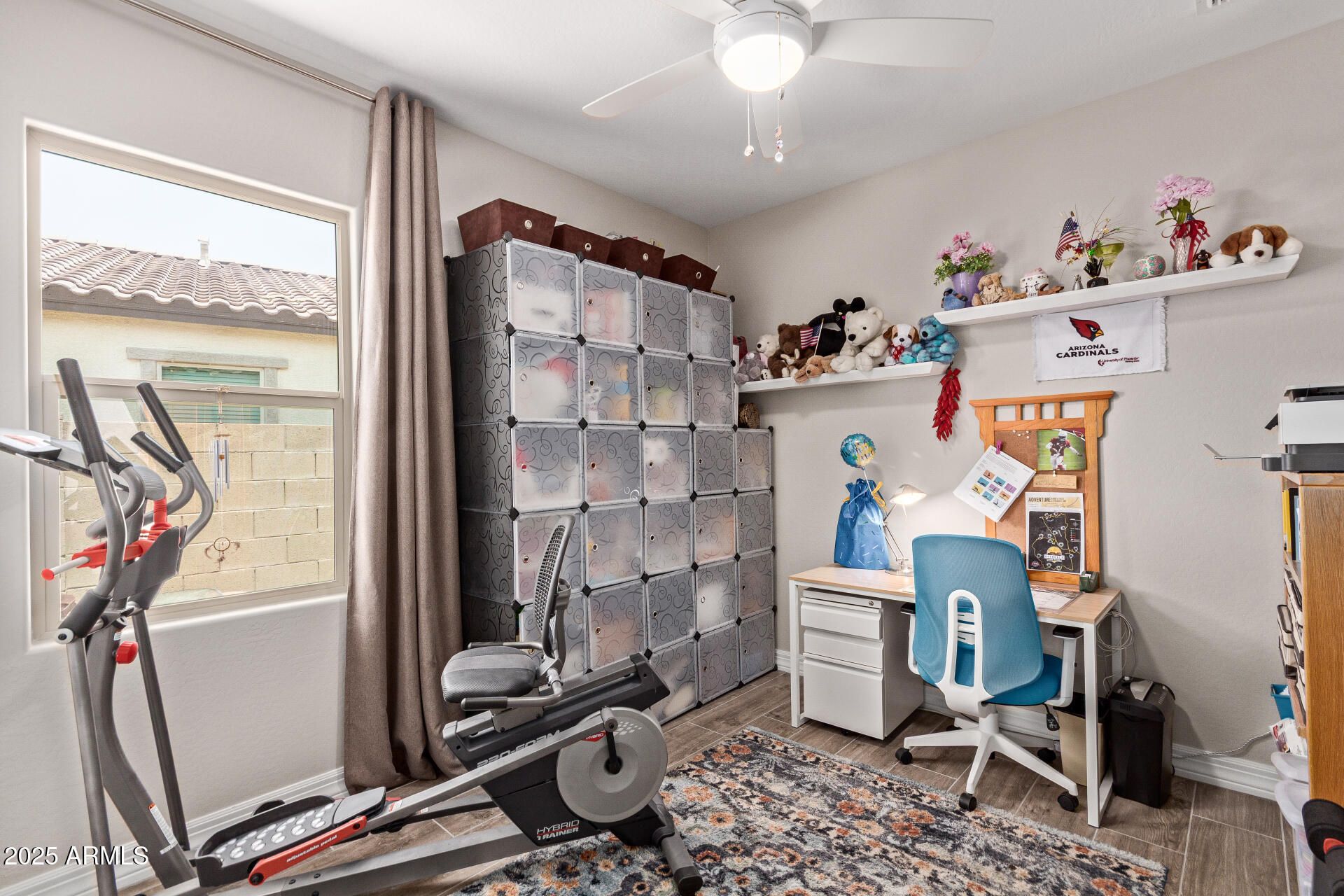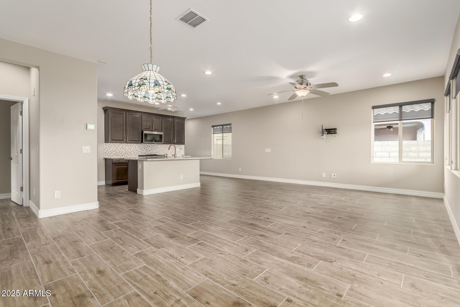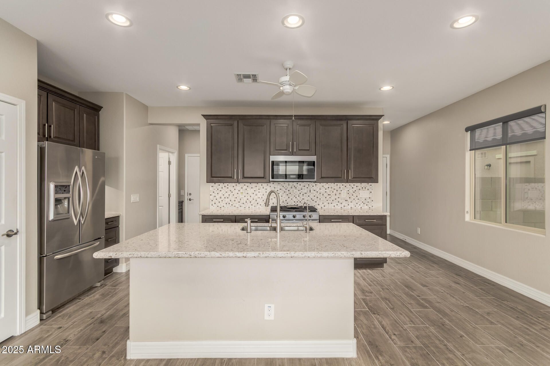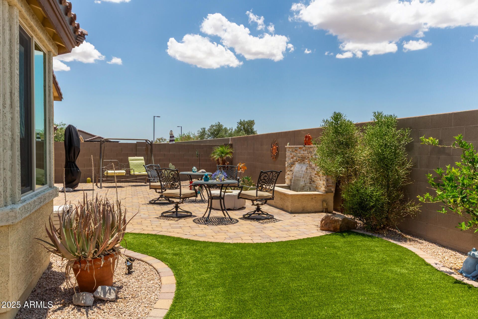 Motivated seller. This beautiful home offers 2 beds + spacious DEN, 2 baths, 2-car garage, & a desert landscape. Its charm starts with the fenced-in paver front patio & porch. Experience resort-style living in the gated Cantamia, a 55+ Community tucked in the scenic foothills of the Estrella Mountains! The inviting interior showcases tons of natural light, neutral palette, & wood-look tile flooring t/out. The welcoming great room to impress! The open-concept kitchen boasts SS appliances, quartz counters, a pantry, mosaic tile backsplash, ample cabinetry, and an island.
