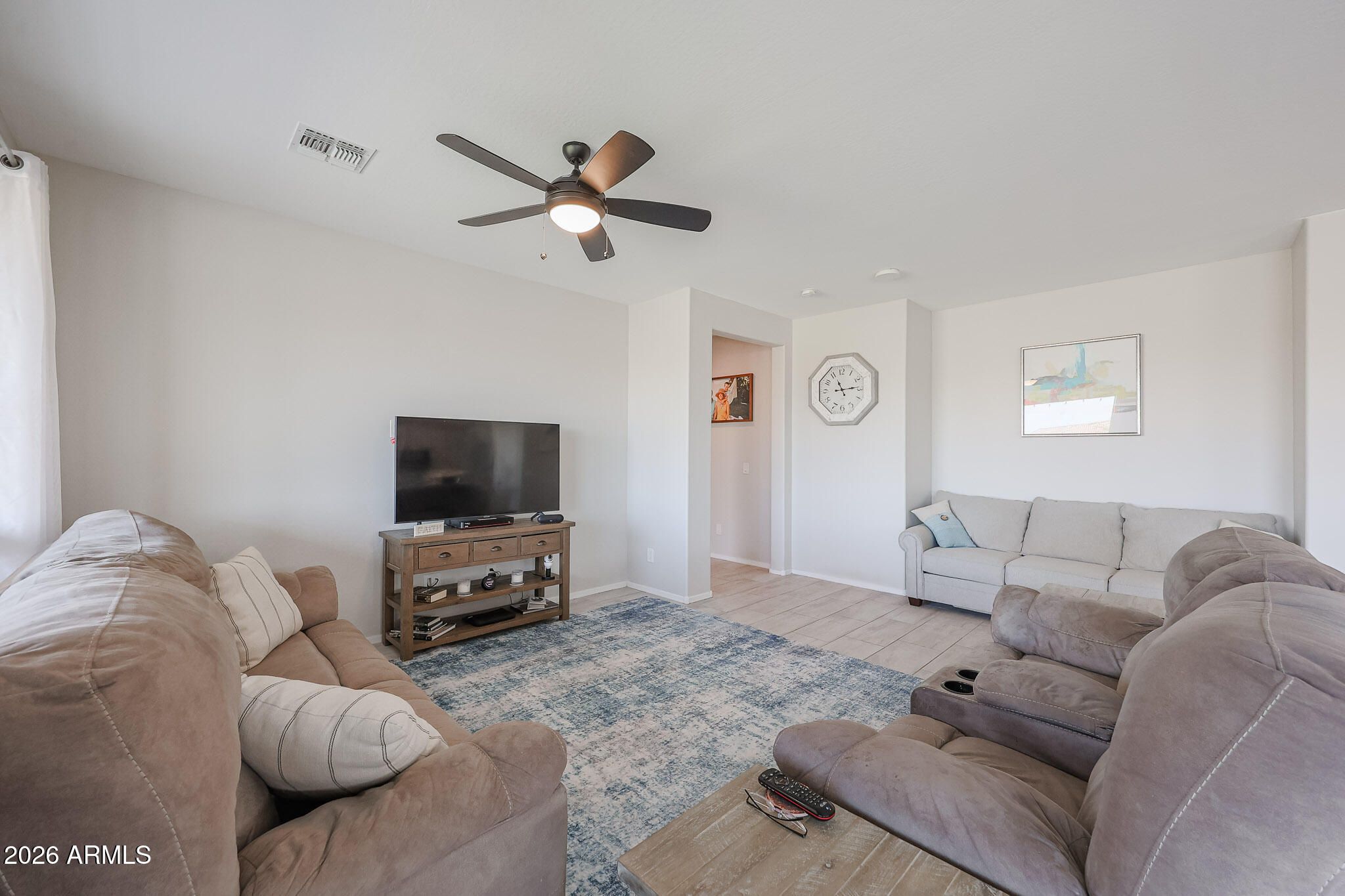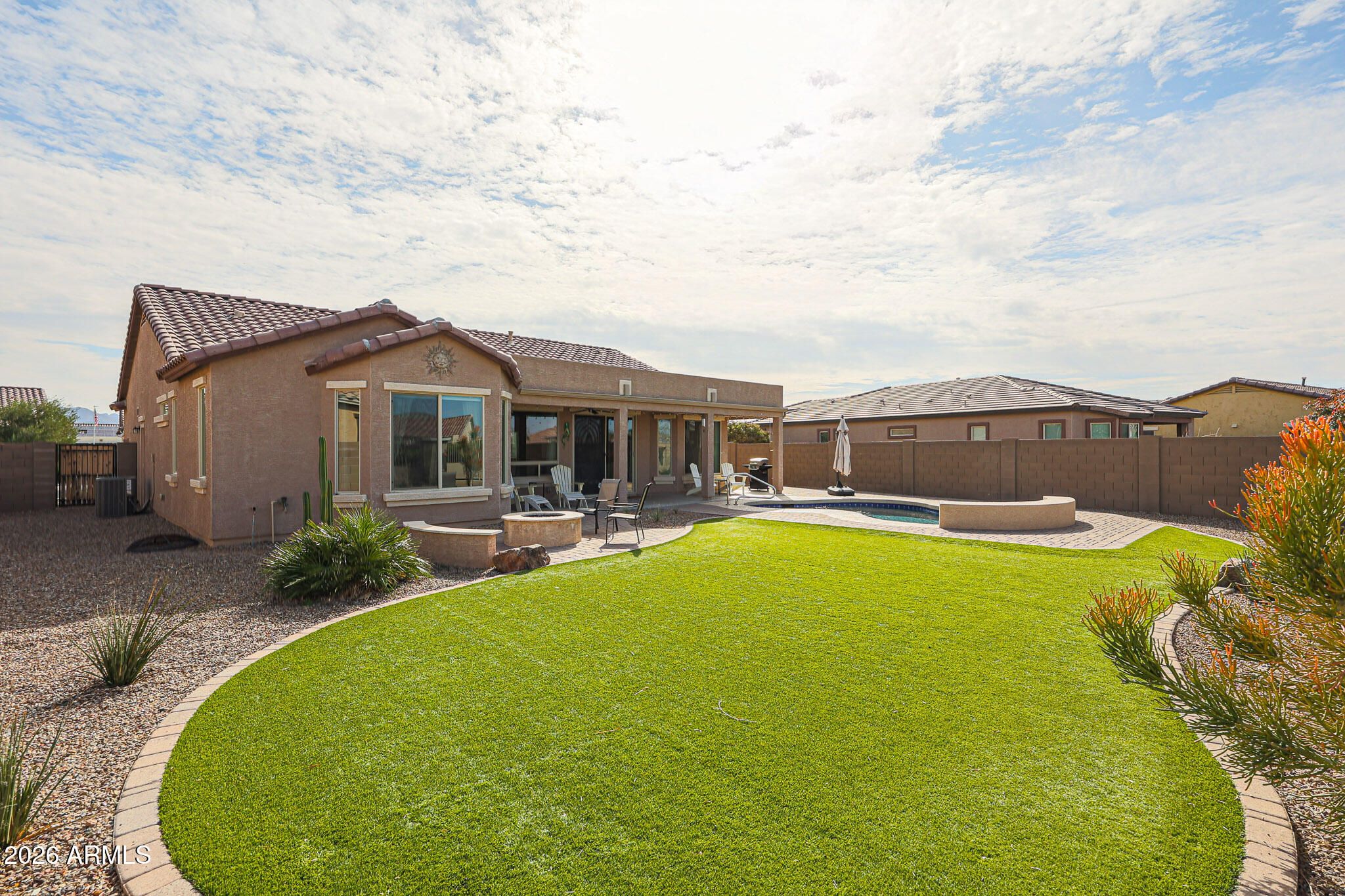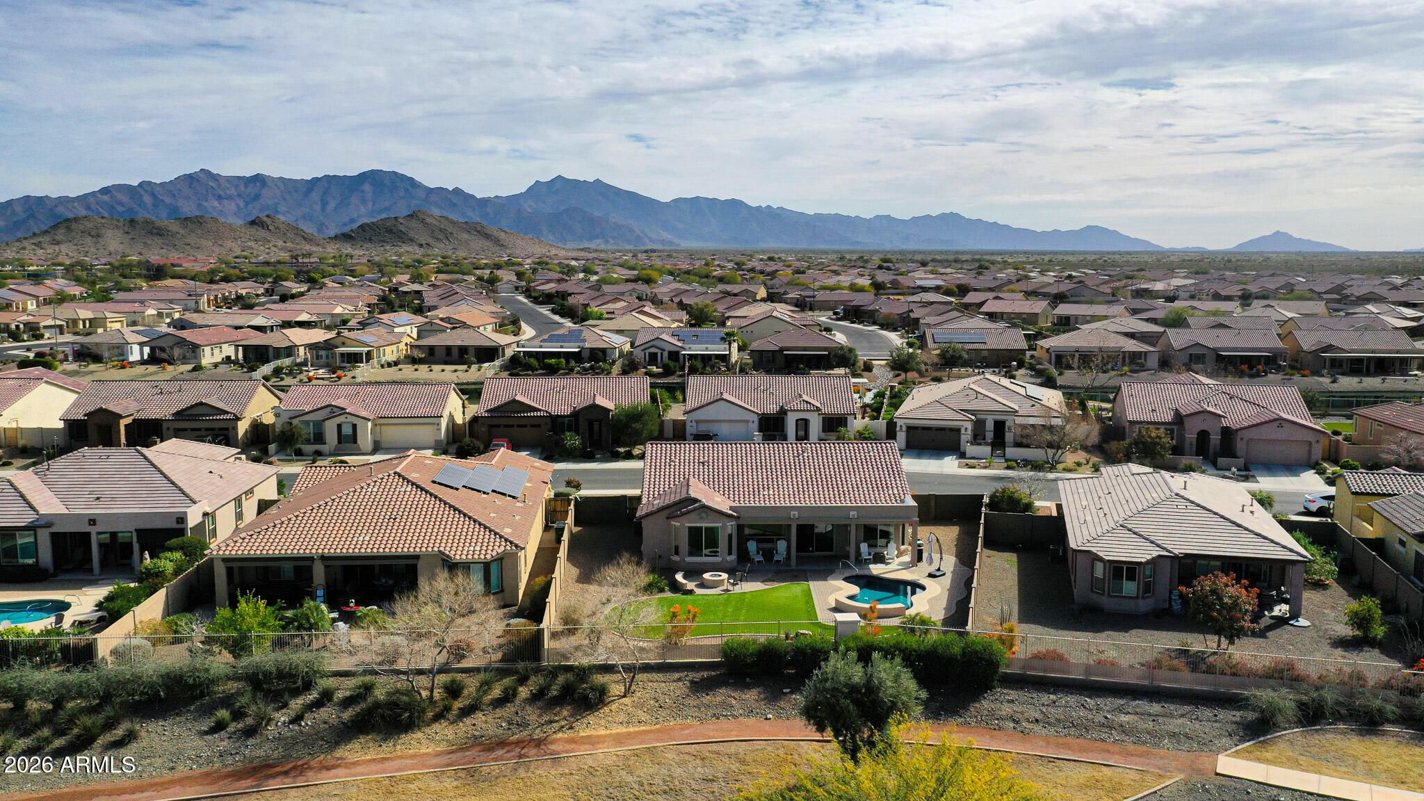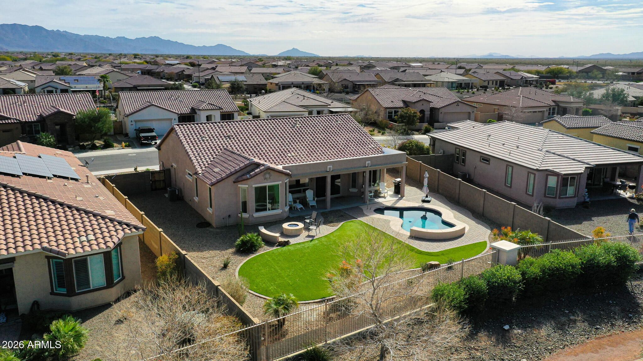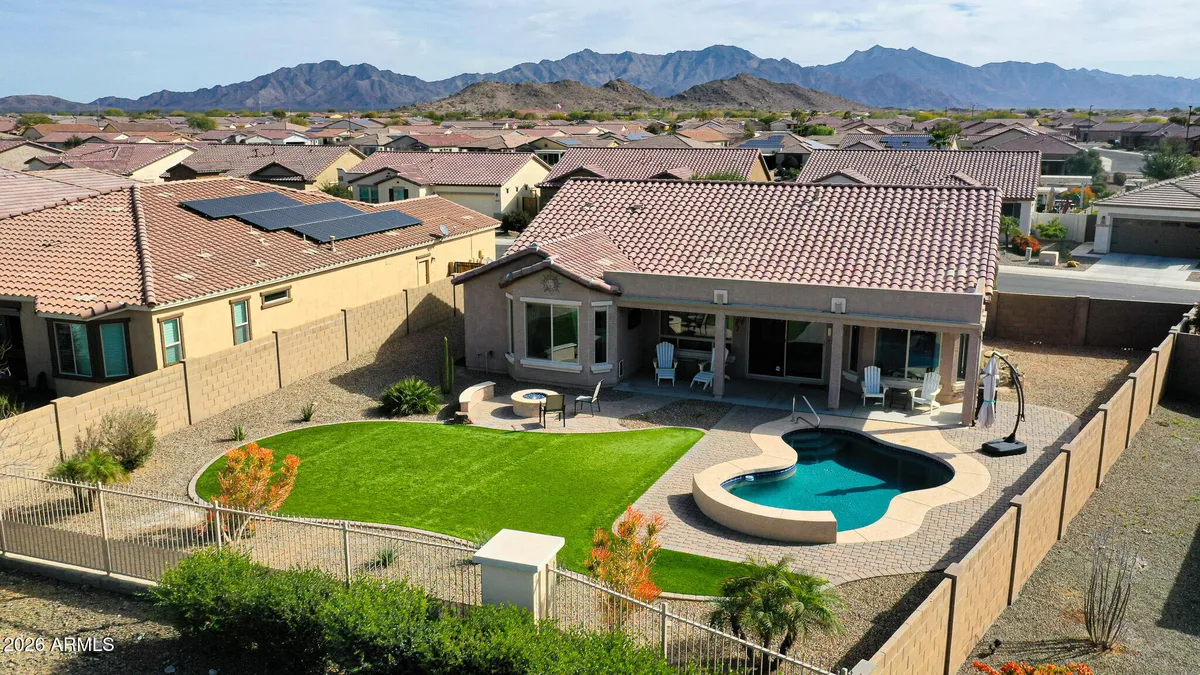 Beautifully maintained and truly move-in ready, this inviting 2-bedroom, 2-bath home with a versatile den is designed for easy living and everyday enjoyment. Start your mornings on the charming front porch, coffee in hand, surrounded by attractive desert landscaping and peaceful neighborhood vibes. Inside, upgraded tile flooring carries you through the main living areas into a light-filled great room where large picture windows create an airy, welcoming atmosphere. The stylish kitchen is both functional and eye-catching, featuring light grey cabinetry, granite countertops, a tiled backsplash, stainless steel appliances, and a spacious center island with breakfast bar - perfect for casual meals or entertaining. The kitchen flows seamlessly into the dining area, where abundant natural light makes every meal feel special. Retreat to the generous primary suite, highlighted by a charming bay window and a bright ensuite with double sinks, a walk-in shower, and a large walk-in closet. Step outside and discover your own private oasis. The oversized backyard backs to common space, offering rare privacy with no neighbors directly behind. Enjoy Arizona living at its best with a sparkling swimming pool, expansive covered patio, and an extended paver patio that leads to a cozy gas firepit - ideal for evening gatherings, sunsets, and stargazing. Take in beautiful mountain views to both the east and west, adding to the serene outdoor experience. Located in the highly desirable, lake-inspired 55+ active adult community of CantaMia, residents enjoy resort-style amenities including a stunning clubhouse, pools, fitness center, pickleball and tennis courts, scenic walking trails, on-site dining, and a vibrant calendar of social events - all designed to support an active, connected, and carefree lifestyle.
