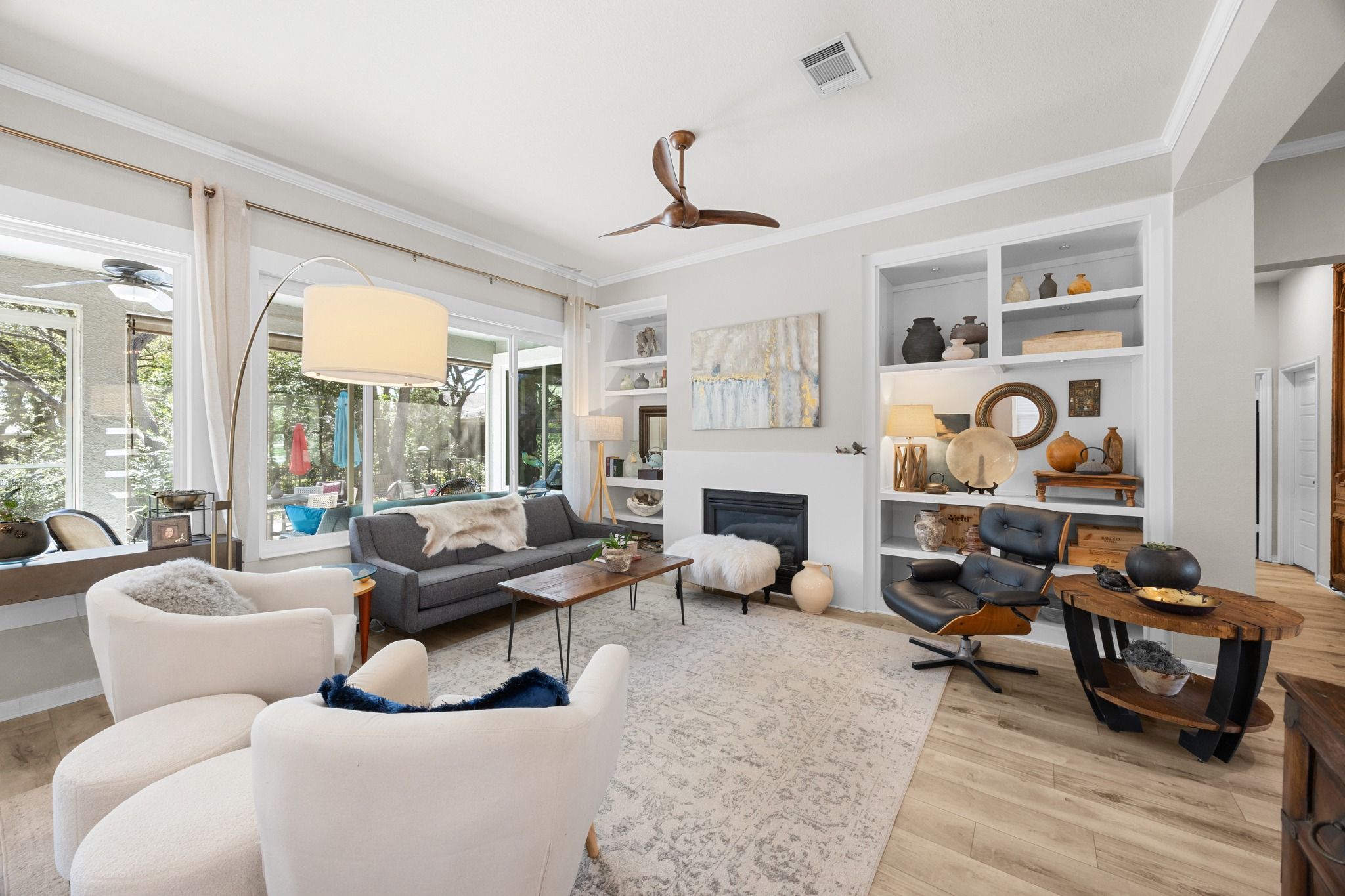Del Webb built popular Trinity model, this house is like new but in a mature, heavily treed, "lots of elbow room "neighborhood in the quiet center of the community. Everything is updated with top of the line renovations, kitchen and primary bath rebuild from the studs out. Perfect indoor and outdoor entertaining with screened porch AND extensive patio... 10 foot ceilings, gas fireplace , 2 beds, 2 full baths, and a flex room/ office/ den/ bedroom. Wall of glass for amazing natural light, bay windows in primary bedroom and breakfast nook... new interior steps, all new flooring, all new windows, recent dual system AC, water softener, all new appliances, all light fixtures updated, recently painted inside and out, wrought iron fencing and doggie fencing, low maintenance revamped landscaping... it's a FULL package !!! The amenities are amazing, and close to downtown Georgetown square, Lake Georgetown, medical facilities, shopping, restaurants, easy access to the airport: city amenities with country feel... check out the tour HERE ....https://168danmoodytrail.mls.tours/u/. and the Sun City Amenities HERE https://www.sctexas.org/Club/Scripts/Home/home.asp