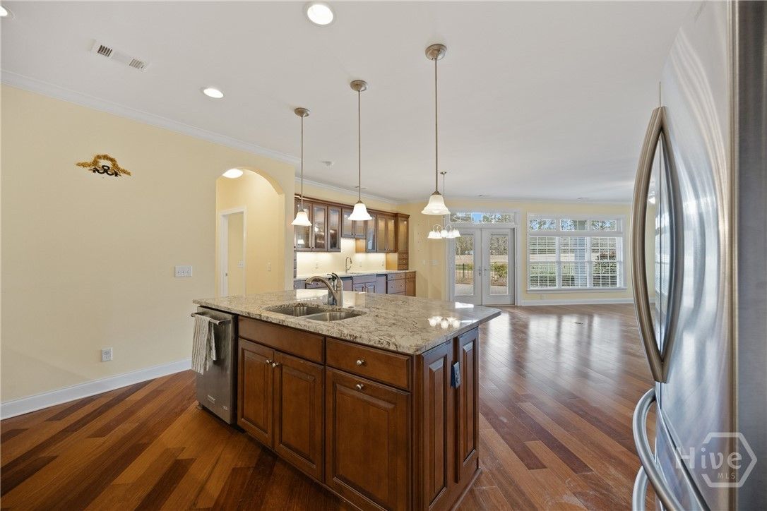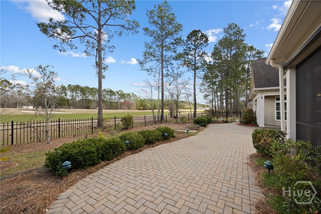 Welcome to this beautiful detached 3-bedroom, 3-bath maintenance-free townhome in The Fairways at Savannah Quarters, that affords the most spectacular views of the 3rd fairway of the Greg Norman Signature golf course! Step inside to a bright foyer, a formal study on left with a bank of windows, & an open floorplan with engineered hardwoods throughout the main living areas, a fireplace in the great room with lots of windows on rear, a gourmet kitchen w/custom cabinets, w/granite countertops, S/S appliances, two pantries, a dining area with built-in china cabinets, a wet bar & wine cooler. There is an expanded brick paver patio on rear, covered & open, a fenced in lawn, perfect for gardening and for taking in the awesome golf views! The spacious master suite on main, w/sliding doors to a screened porch, is perfect for the morning cup of coffeel The master bath features a Roman shower, split vanities w/granite countertops,w/lots of cabinets, & a towel warmer! The master closet, with custom shelving, & cabinets, provides generous space for two! The guest suite on main, has a double closet, & a sliding door to a covered patio! The guest bath has granite countertops & a tiled shower! The laundry room has lots of cabinets & a storage closet. Upstairs you will find a generous loft area w/a closet (could be 4th BR!) a full bath & a guest bedroom. The oversized garage has built-in cabinetry for storage, additional storage shelving, & a sink! The home also has a tankless water heater and a security system. This home is perfect for entertaining & family living! Enoy great amenities including golf, swim, tennis, pickleball, fitness, dining at the Club, and the convenience to downtown Savannah, restaurants & Publix in the Village, and Costco across the Pooler Parkway!