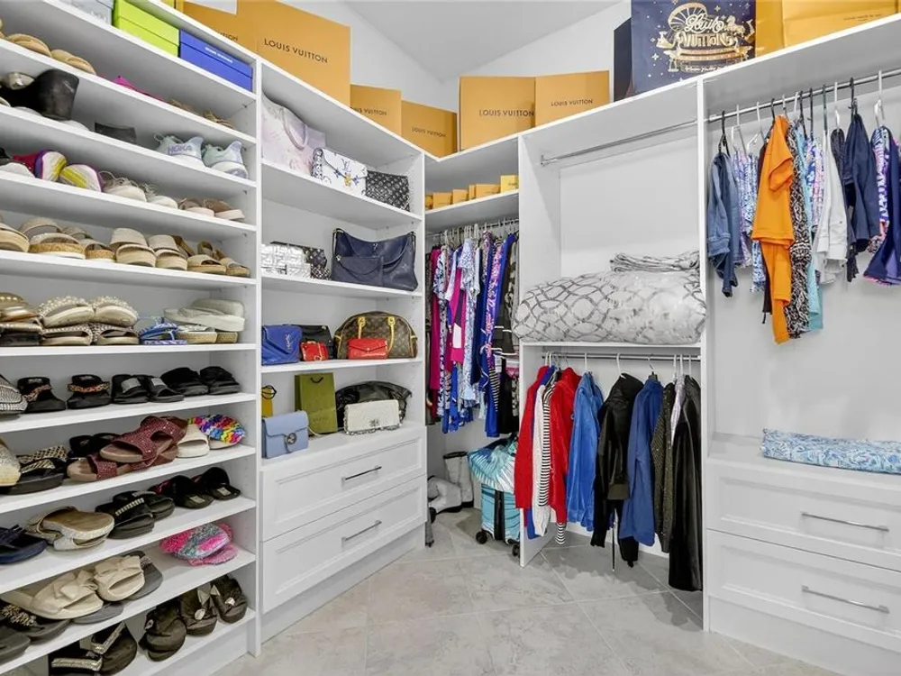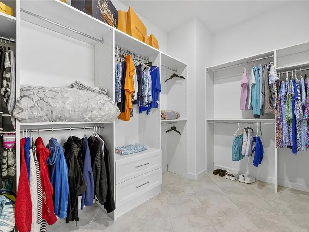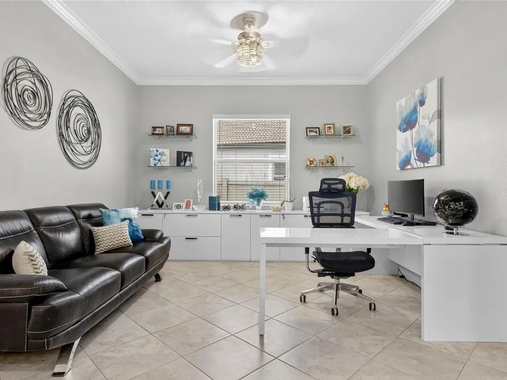 - Built-in Features, Ceiling Fan(s), Coffered Ceiling(s), Crown Molding, In-Wall Pest Control, Open Floorplan, Main Level Primary, Solid Surface Counters, Split Bedrooms, Thermostat, Walk-In Closet(s), Window Treatments