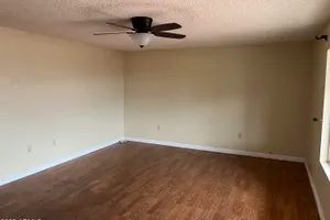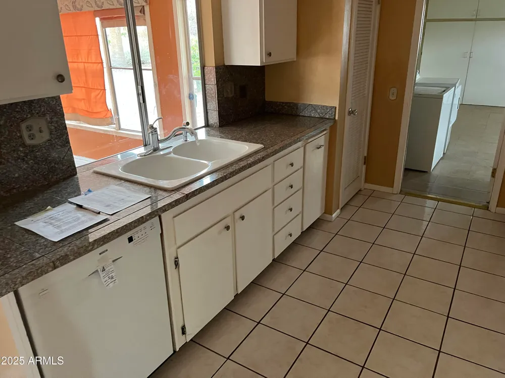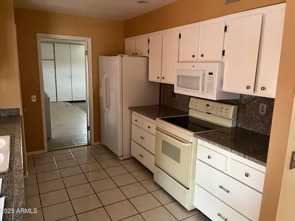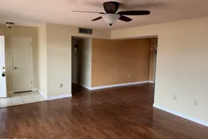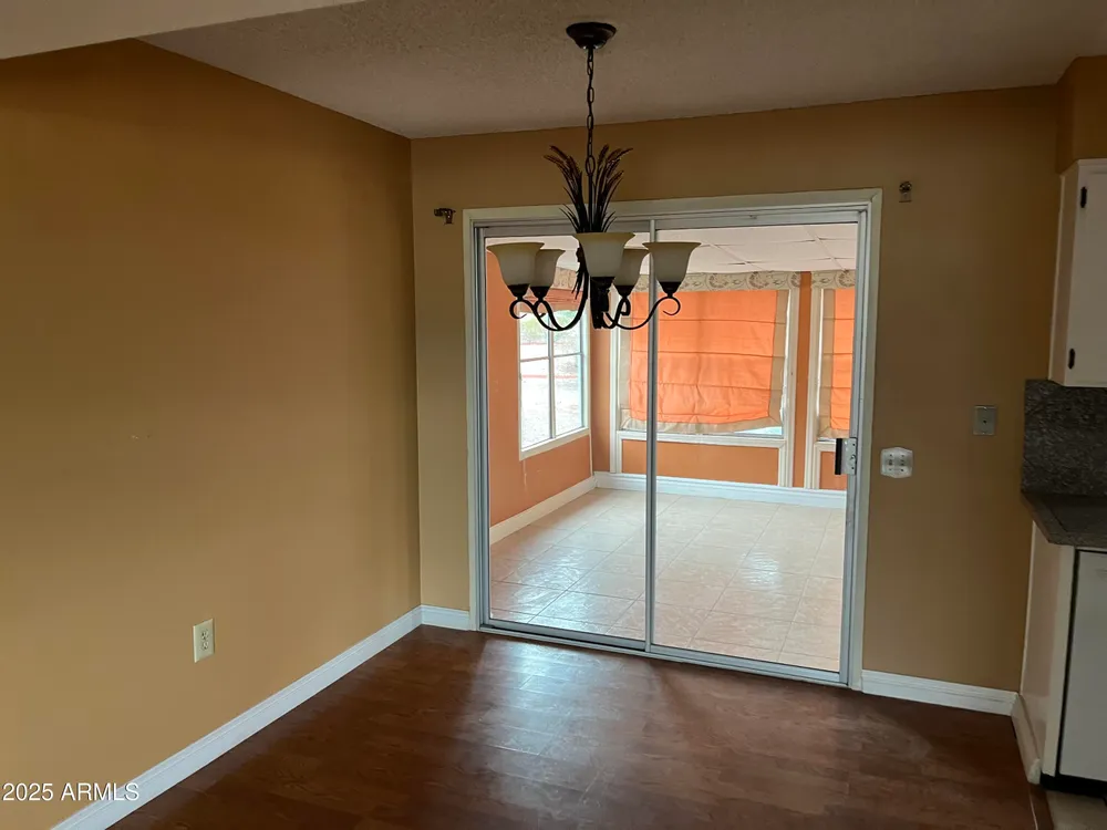 2 bedroom 2 Bath home with living room and dining room with wood vinyl floors. kitchen has white cabinets and granite tile countertops. AZ room with tile flooring and AC unit