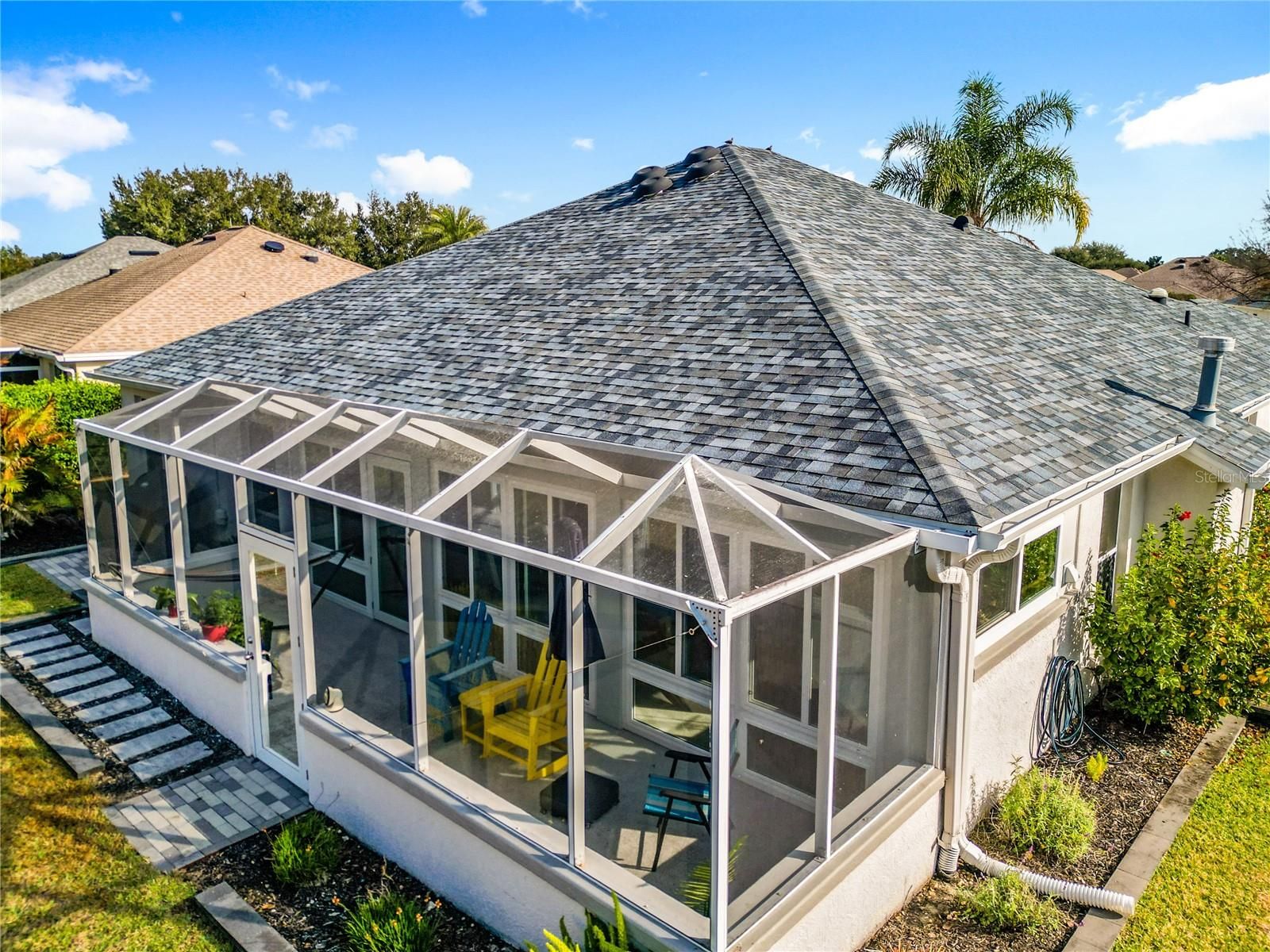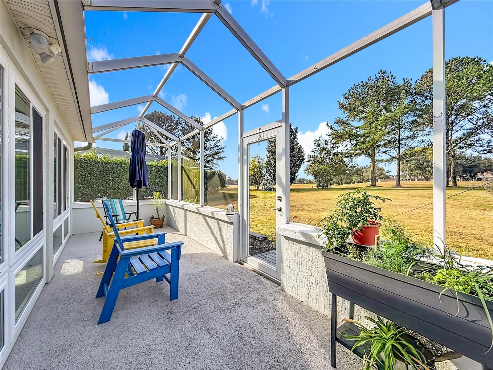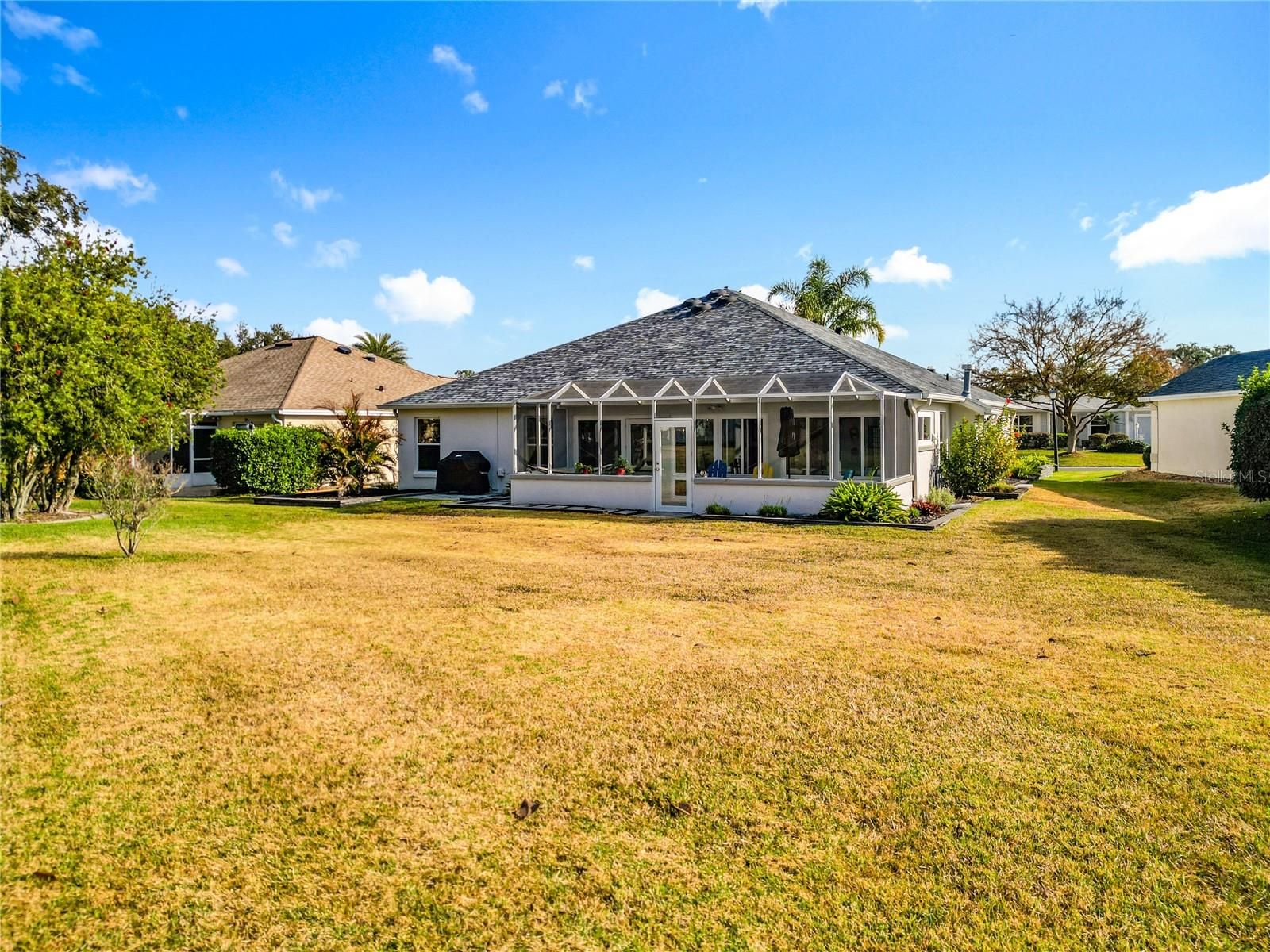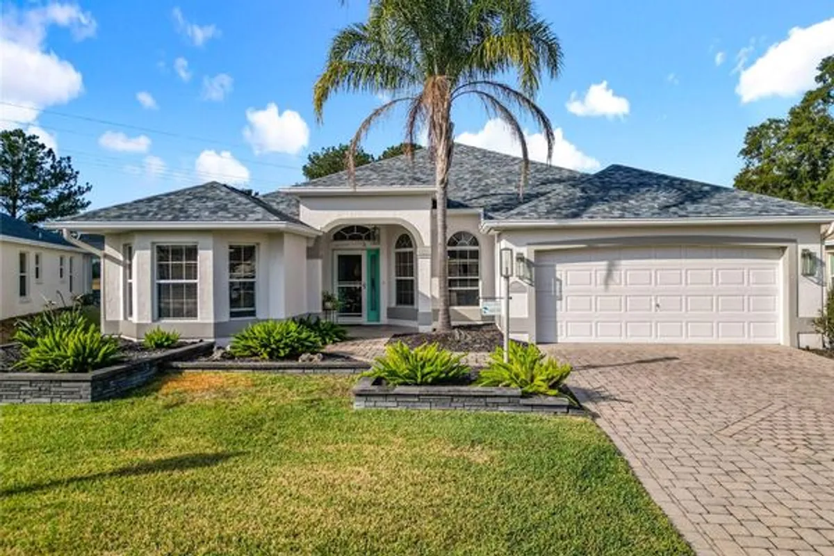 Looking for a Spacious Updated Home, Paid BOND, Backs to Championship Golf Course and has ROOM FOR A POOL? Then Look no further! This Beautiful Designer Gardenia 3 Bedroom 2 Bathroom Stucco Home has everything you are looking for. Updated and Contemporary Styling this home is Located on the 2nd Tee Box of Nancy Lopez Ashley Meadows Championship Golf Course. With a LARGE YARD ready for outdoor entertaining or installation of your own Pool. As you pull up to home you will be impressed by the lovely Paver Driveway, landscaping and clean color accents. Enter through the Artistic Glass Entry Doors you feel the expansiveness of this home. With 2 Private Guest rooms and private bath with walk in shower to the left. A Large eat in kitchen to your right with STAINLESS APPLIANCES, GAS RANGE, CORIAN COUNTERS and plenty of storage and counter space fit for a professional chief. The home has Custom PORCELAIN TILE through out, NO POPCORN, Blinds, Solar Tube, HIGH CEILINGS, Updated CUSTOM LIGHTING, & Updated Ceiling Fans. A GAS FIREPLACE is the Focal Point in the Living Room along with a spacious dining room. The ENCLOSED LANAI extends your living space, has Aggregate Epoxy Pebble flooring and is heated and cooled by a portable unit. Their is also a BIRDCAGE attached, perfect to sit out and watch nature or a golfer or two. The ROOF was replaced in 2022, HVAC 2018, HWH 2017, Garage Door Opener 2024, PAID BOND. The Laundry Room/Mud Room has space for storage and leads to the 2 Car Garage with Epoxy Flooring. If Shopping, Restaurants, or Accessibility in and out of The Villages is important to you then you will Love this location. Not only do you have The Nancy Lopez Country Club, Golf Courses, and Pool Bar just minutes away by Golf Cart but you have Publix, Walgreens, The Back Porch, Beef O'Brady's, Bealls and so much more... This Home is so Spacious Inside and Out and Shows Like NEW! Furnishings are offered separately. Not often do you find a home so ready to just Move In an start living the Good Life! Schedule your showing today before this one gets away.