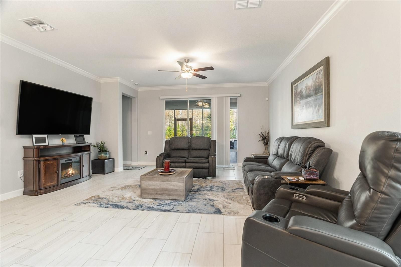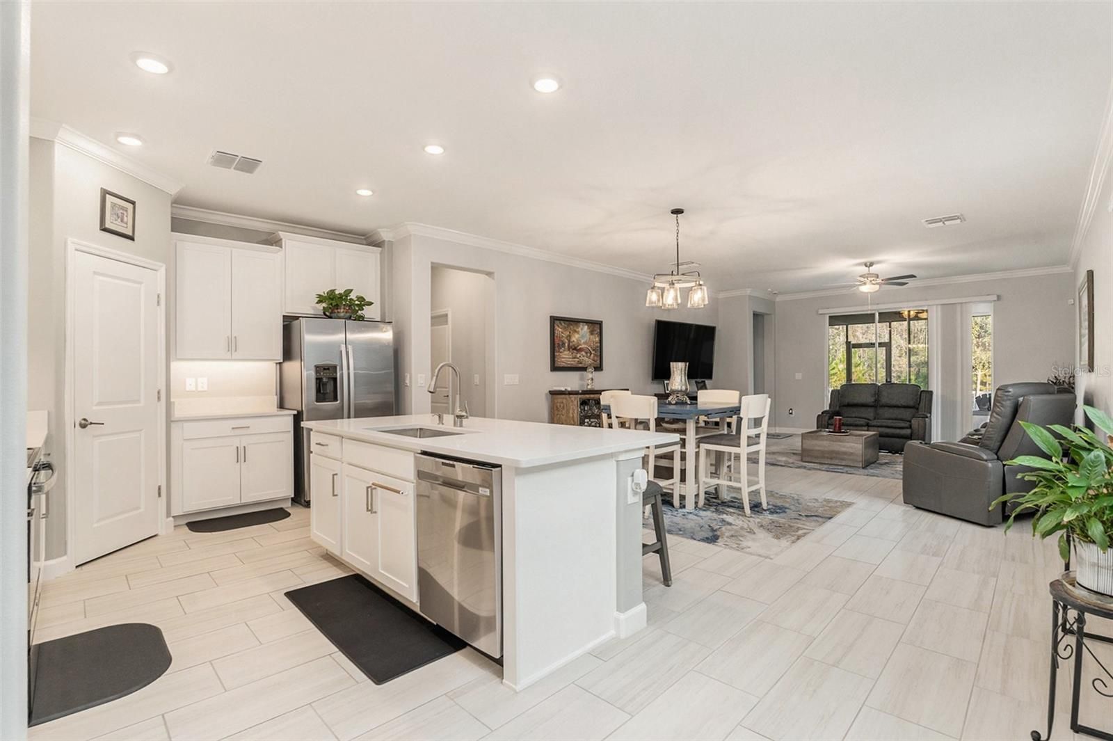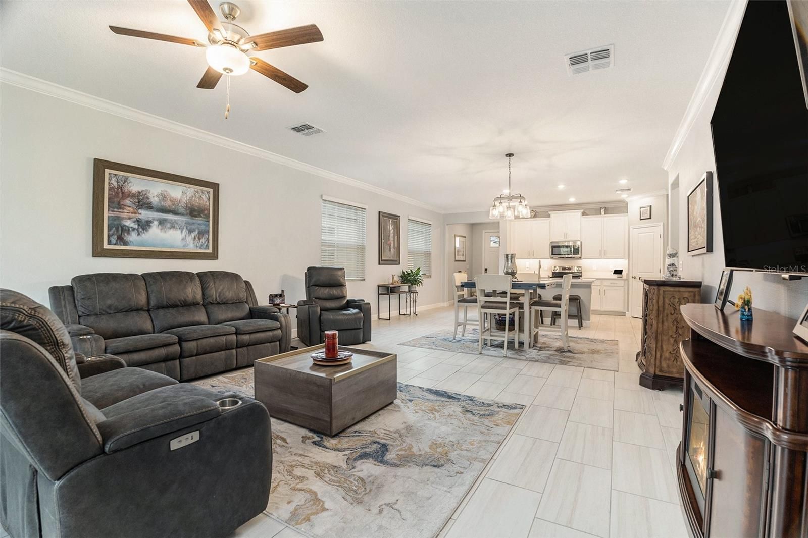 This Move-In Ready Home in Angeline is a highly sought-after Active Adult premier 55+ master-planned community ! This modern 2-bedroom, 2-bath home with a versatile flex room offers the perfect blend of comfort, function, and style. Just off the foyer, the flex space can serve as a home office, hobby room, or guest retreat. The open-concept layout connects the fully equipped kitchen, dining room, and family room, all leading to a large screened-in patio with peaceful natural views. With no backyard neighbors, mornings and evenings are ideal for enjoying tranquility and nature's beautiful creatures. The private owner’s suite features a spacious bedroom and a generous en-suite bathroom with dual sinks, a large walk-in tiled shower, and a water closet. Upgrades include stainless steel appliances, quartz countertops, ceramic tile flooring, crown molding throughout, and an upgraded super-quiet dishwasher. A dedicated laundry room, 2-car garage with additional golf cart space, and fully fenced yard provide extra convenience and privacy. The community offers exceptional amenities, including a private, multi-million-dollar resort-style amenity center just a short walk away, complete with a pool, sports courts, and clubhouse. Residents enjoy over 100 miles of walking, jogging, and biking trails, a future recreational lagoon with acres of crystal-clear water, 3,600 acres of preserved green space, a community farm, and endless outdoor activities that make Angeline an active adult haven. Coming soon: a new Moffitt Cancer Center facility nearby, adding even more convenience and peace of mind for residents. Schedule your private showing today and be in your new home before Christmas.