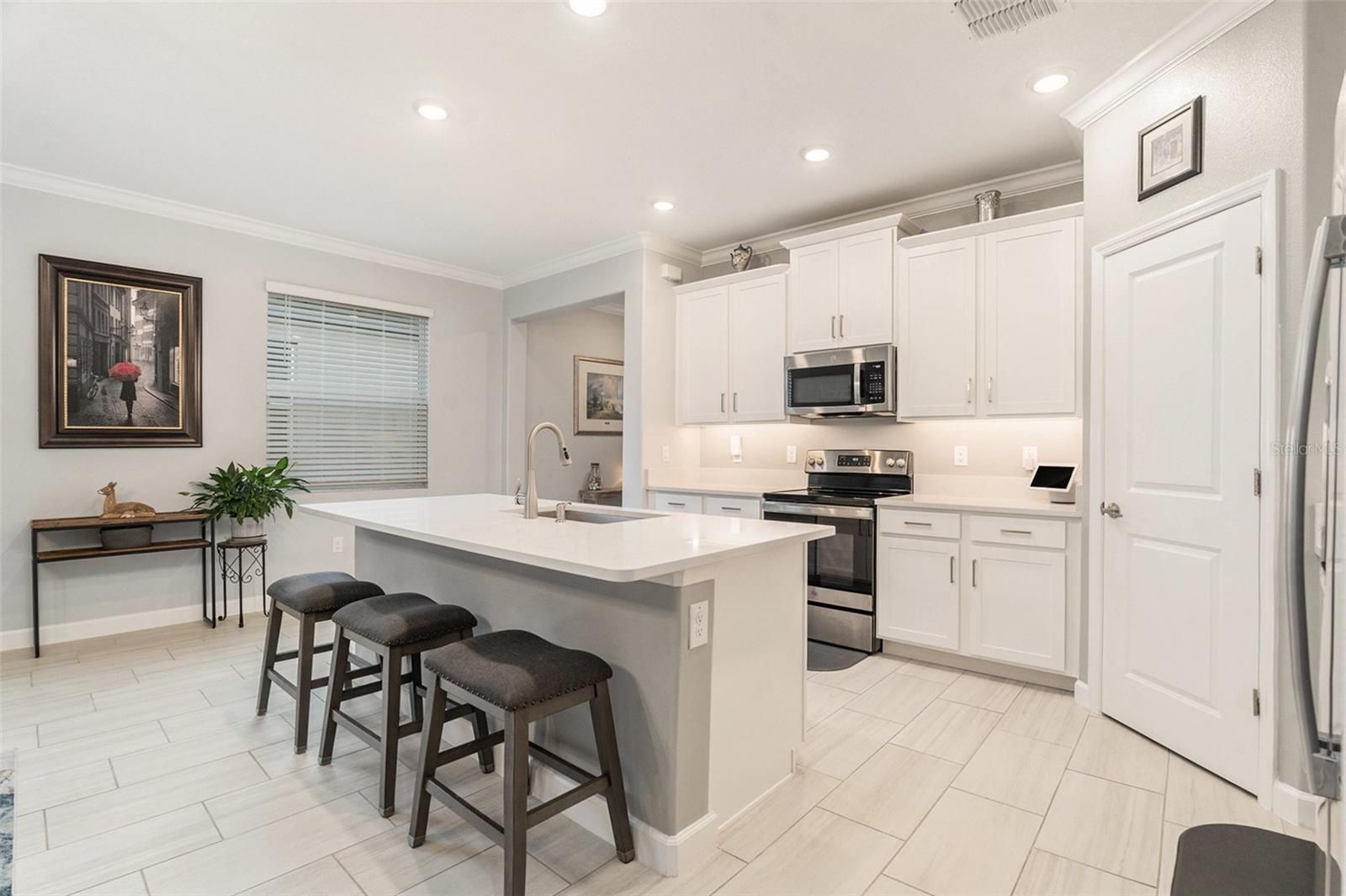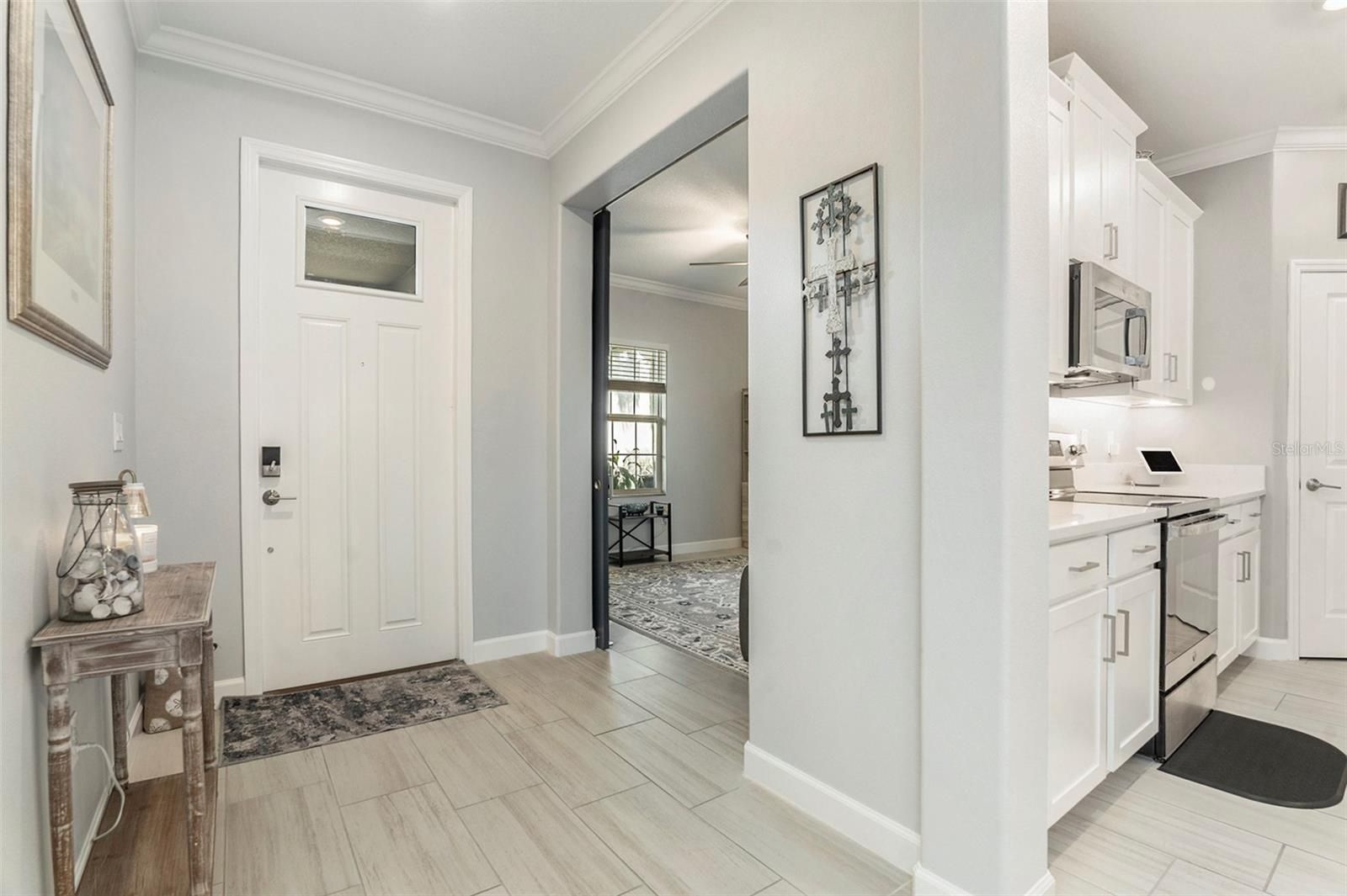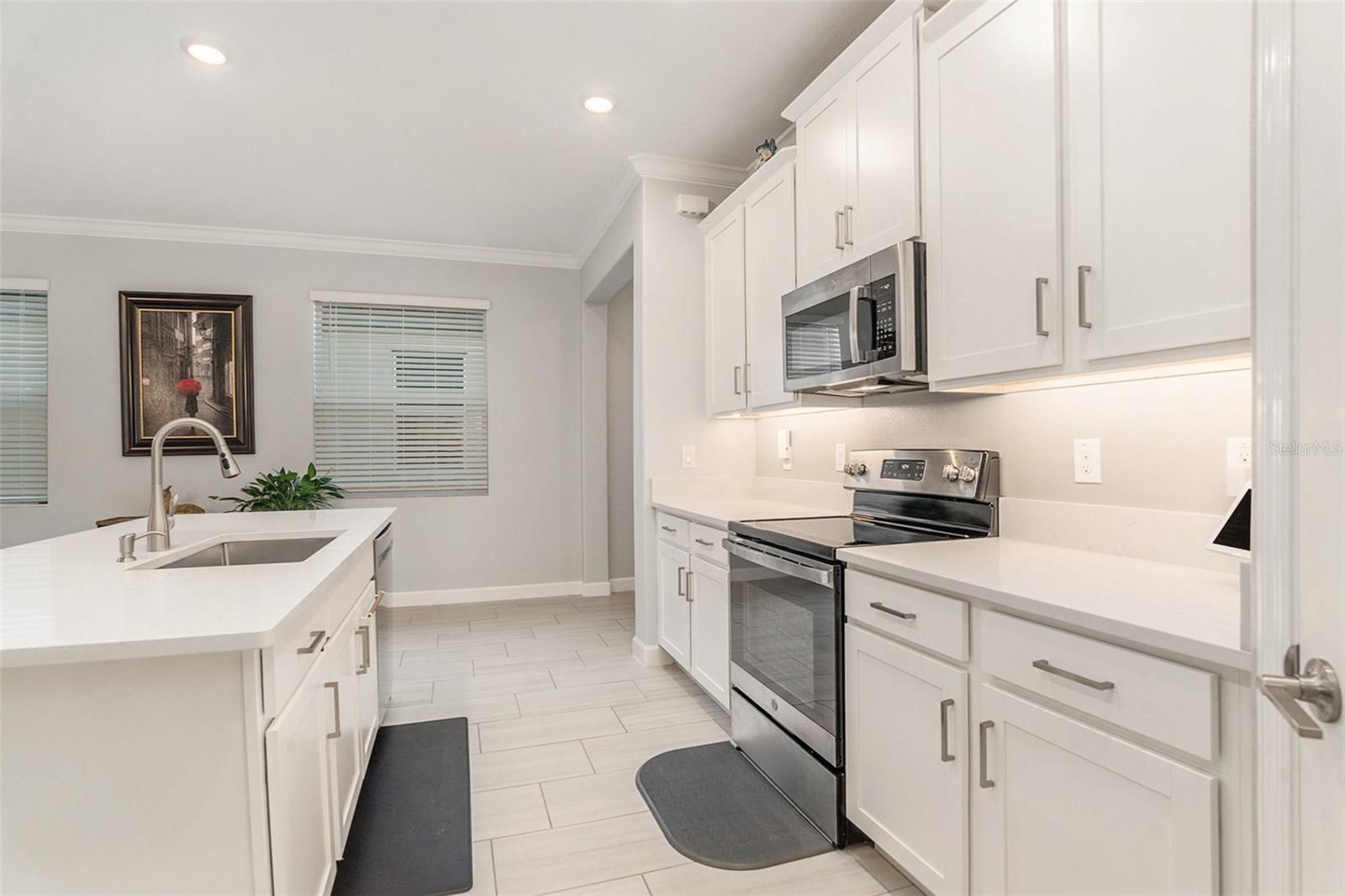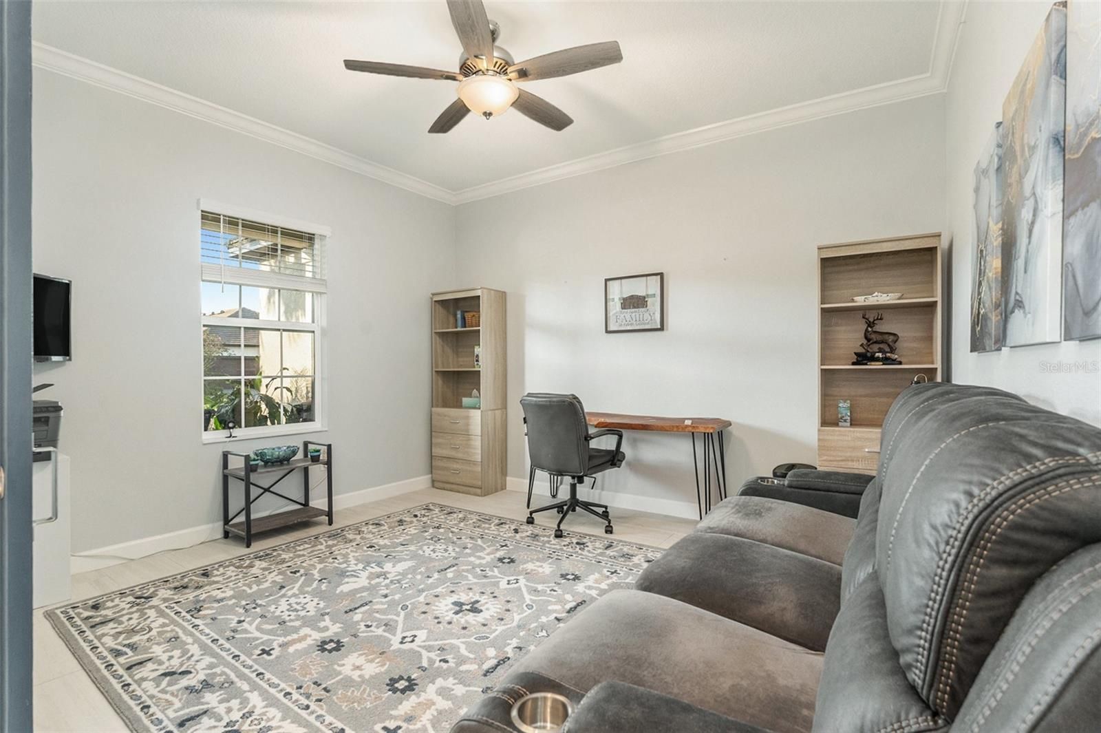 This Move-In Ready Home in Angeline is a highly sought-after Active Adult premier 55+ master-planned community ! This modern 2-bedroom, 2-bath home with a versatile flex room offers the perfect blend of comfort, function, and style. Just off the foyer, the flex space can serve as a home office, hobby room, or guest retreat. The open-concept layout connects the fully equipped kitchen, dining room, and family room, all leading to a large screened-in patio with peaceful natural views. With no backyard neighbors, mornings and evenings are ideal for enjoying tranquility and nature's beautiful creatures. The private owner’s suite features a spacious bedroom and a generous en-suite bathroom with dual sinks, a large walk-in tiled shower, and a water closet. Upgrades include stainless steel appliances, quartz countertops, ceramic tile flooring, crown molding throughout, and an upgraded super-quiet dishwasher. A dedicated laundry room, 2-car garage with additional golf cart space, and fully fenced yard provide extra convenience and privacy. The community offers exceptional amenities, including a private, multi-million-dollar resort-style amenity center just a short walk away, complete with a pool, sports courts, and clubhouse. Residents enjoy over 100 miles of walking, jogging, and biking trails, a future recreational lagoon with acres of crystal-clear water, 3,600 acres of preserved green space, a community farm, and endless outdoor activities that make Angeline an active adult haven. Coming soon: a new Moffitt Cancer Center facility nearby, adding even more convenience and peace of mind for residents. Schedule your private showing today and be in your new home before Christmas.